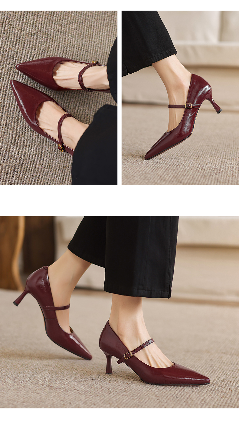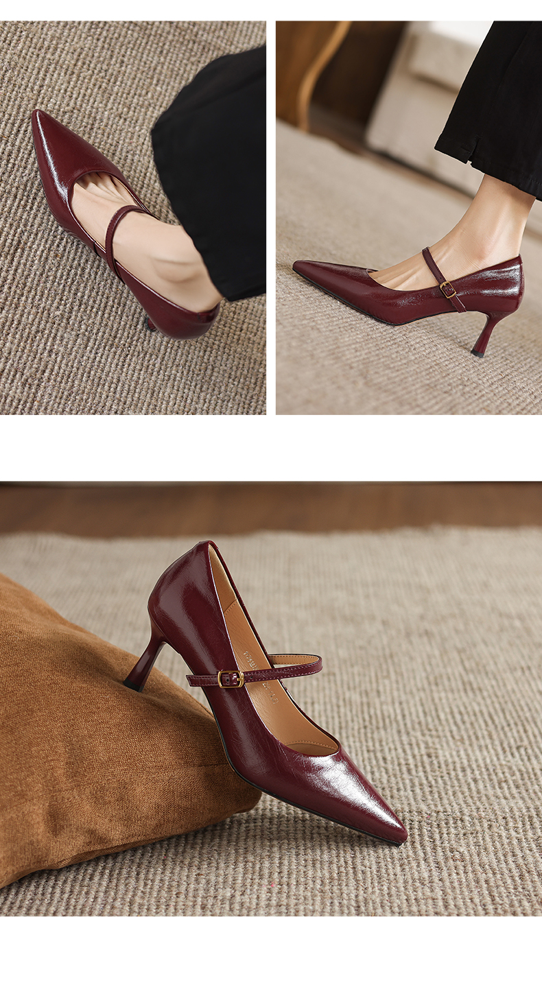 阿么手工女鞋法式气质一字带细跟高跟鞋尖头漆皮浅口单鞋女6.5CM