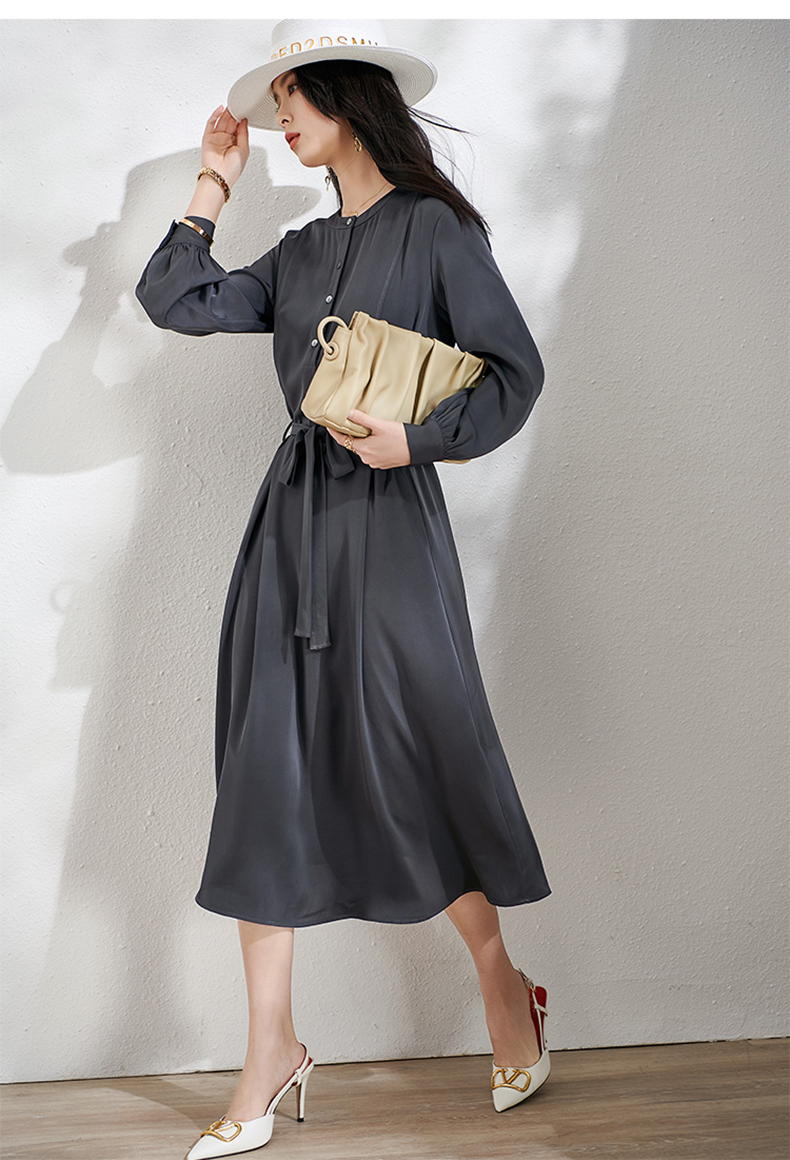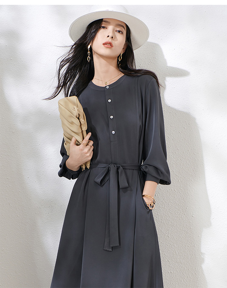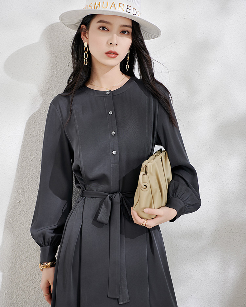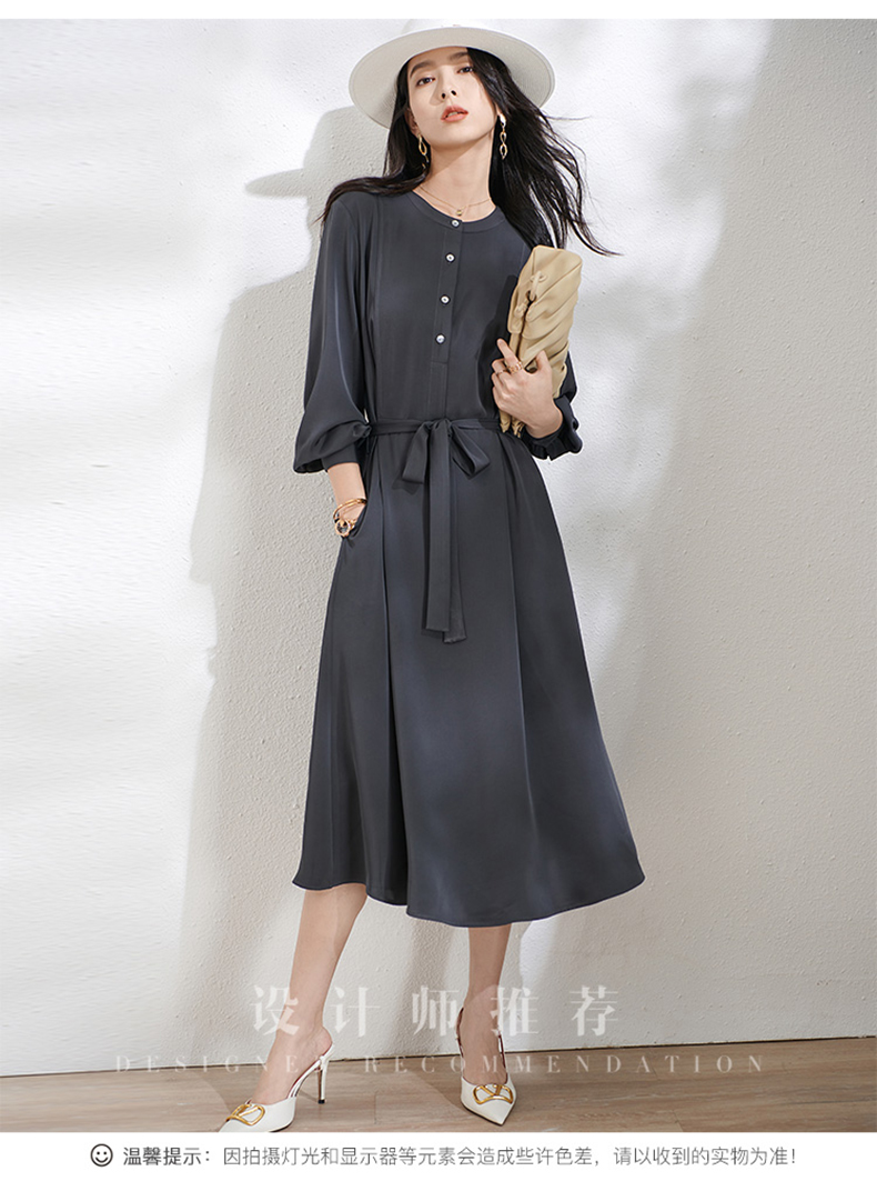 芳外春季新款时尚气质通勤中长裙宽松收腰长袖圆领连衣裙1531
