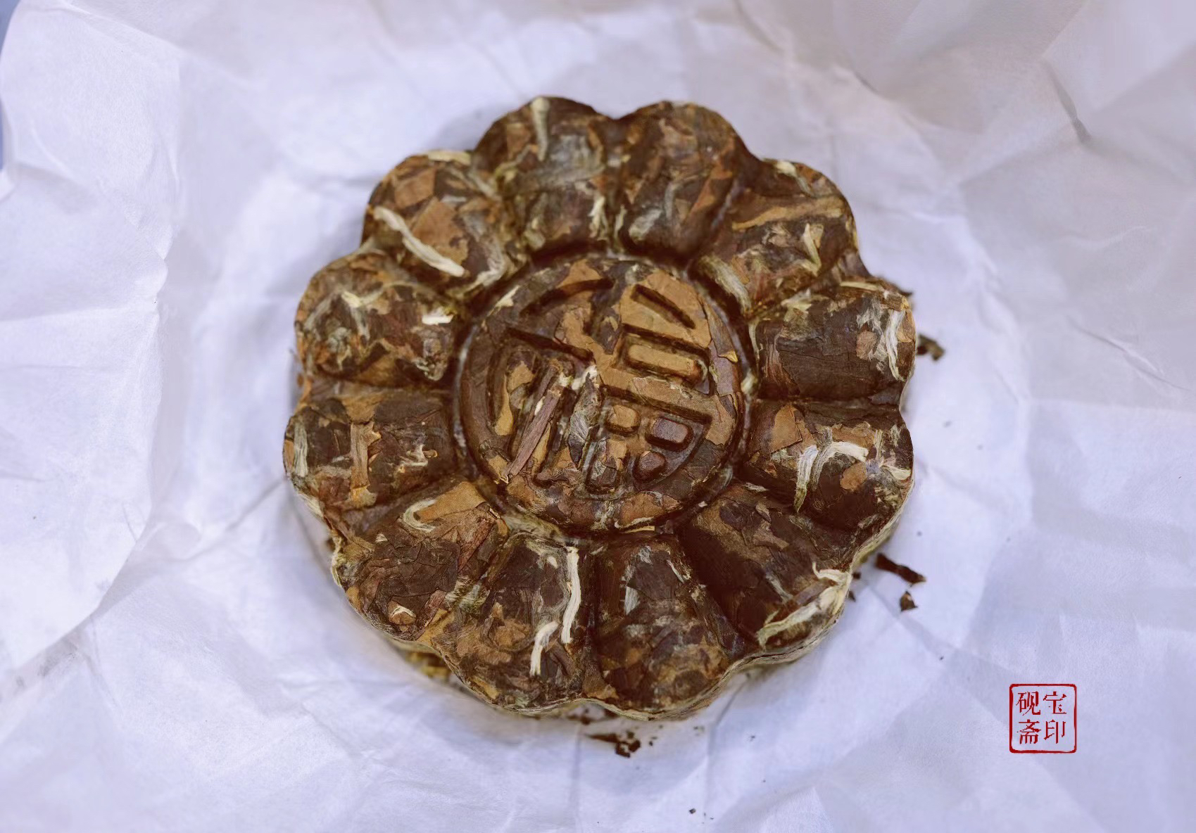 我今天在盘山房库存的时候一下看到这个茶,16年的老白茶贡眉级别的。压成了月饼的形状,当年做的砚宝斋Vip月饼的礼盒,之前我们老一批的Vip都收到过。