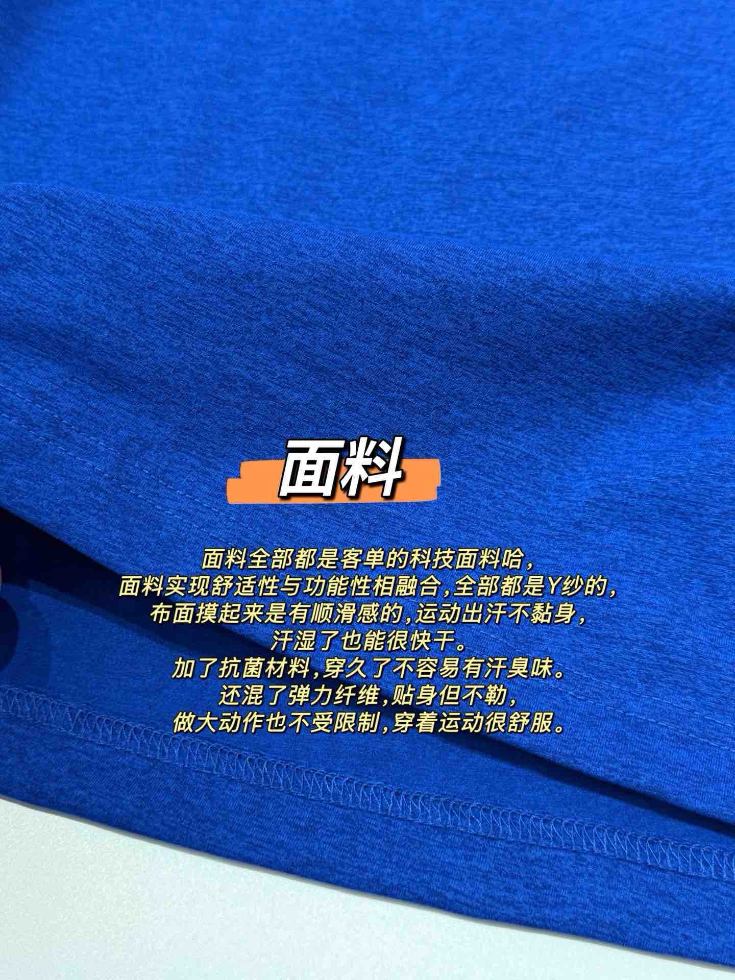面料全部都是客单的科技面料哈,面料实现舒适性与功能性相融合,全部都是Y纱的,布面摸起来是有顺滑感的,运动出汗不黏身,汗湿了也能很快干。加了抗菌材料,穿久了不容易有汗臭味。还混了弹力纤维,贴身但不勒,做大动作也不受限制,穿着运动很舒服。
