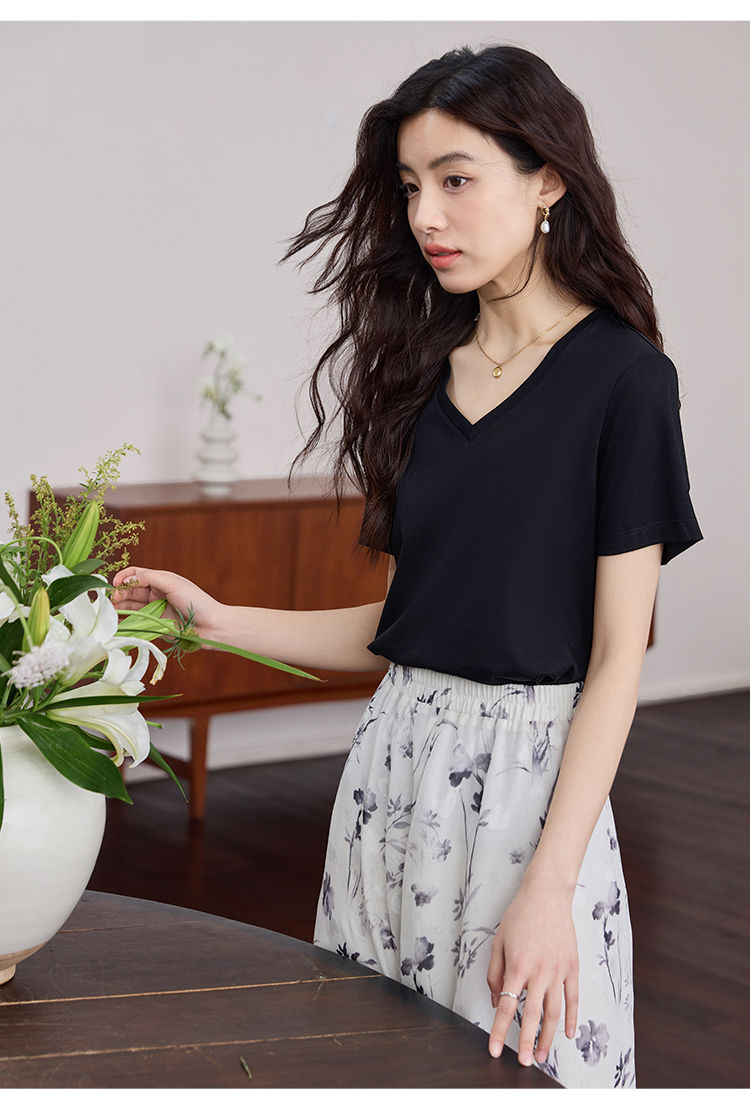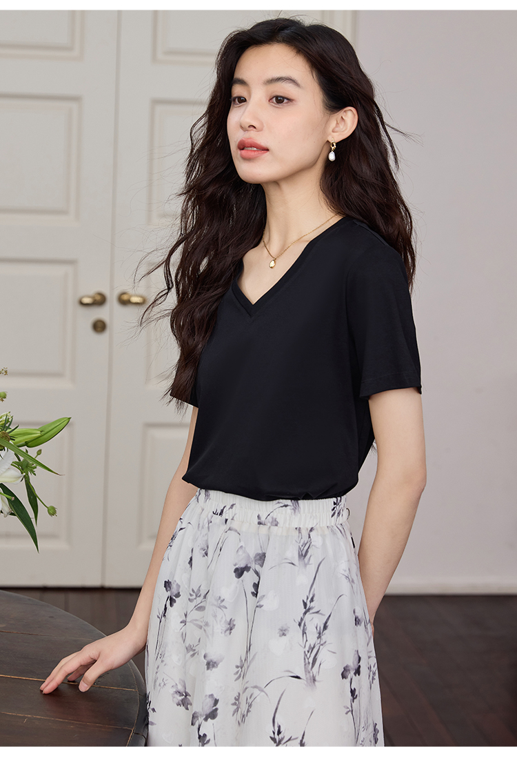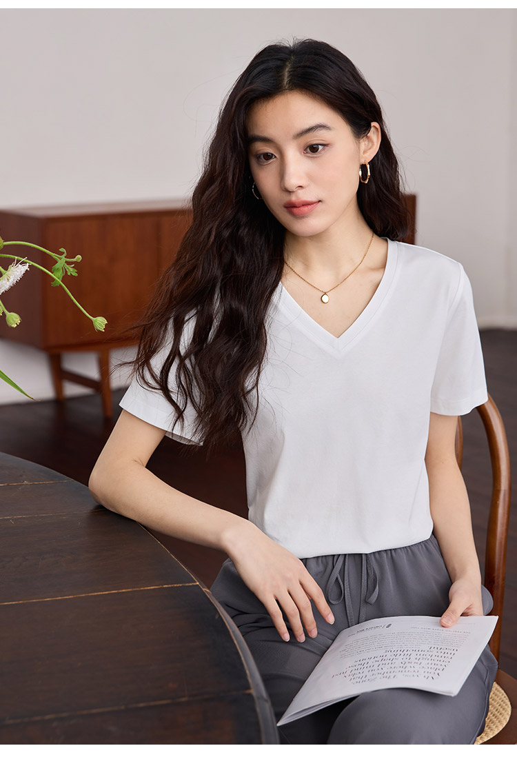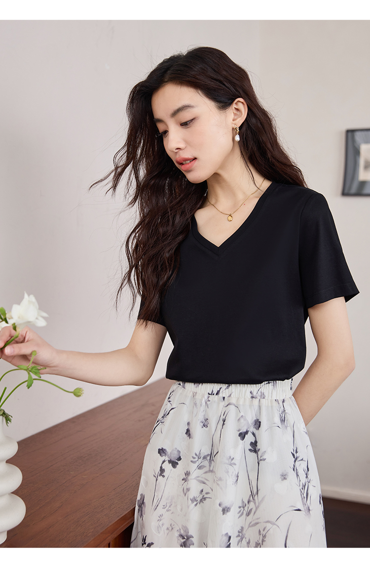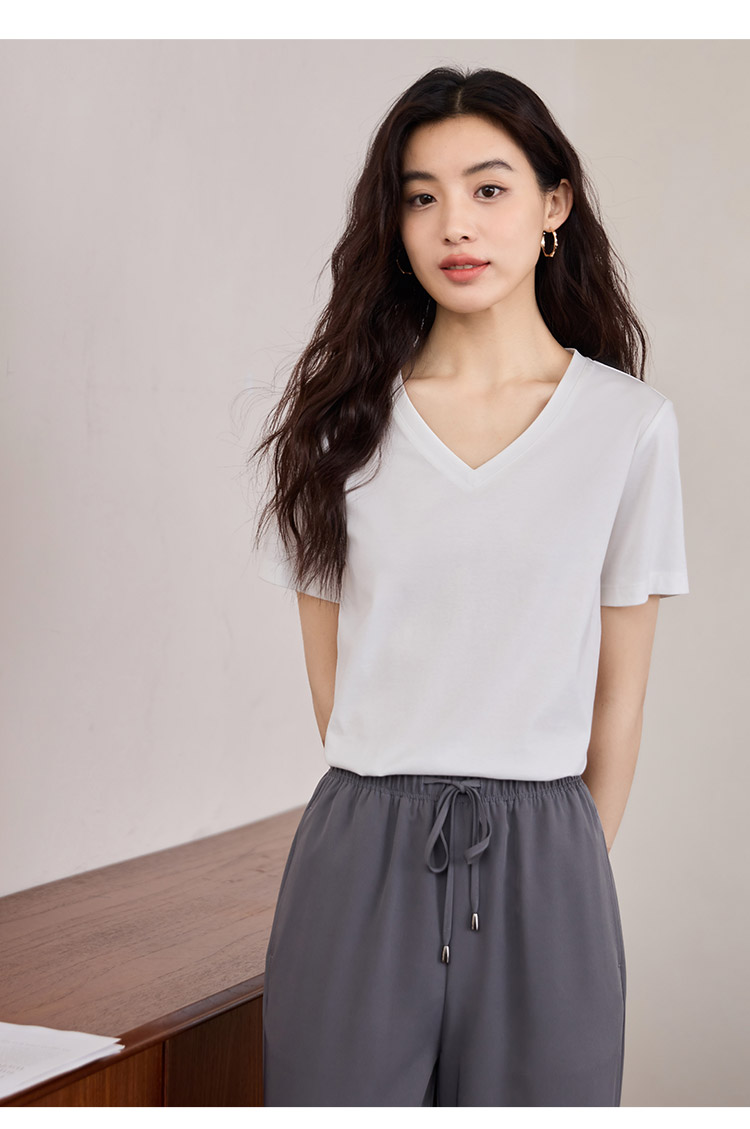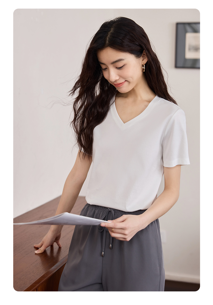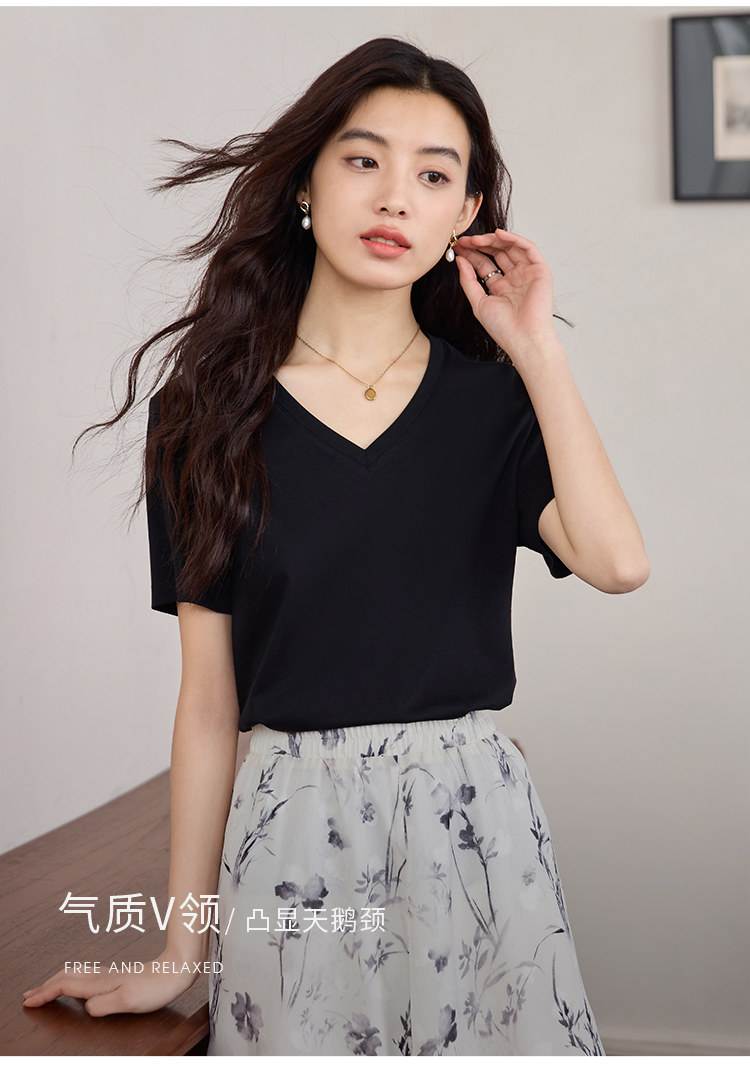 【专属特价】熙世界重磅70s丝光棉t恤短袖2025夏天新款简约纯色V领体恤上衣