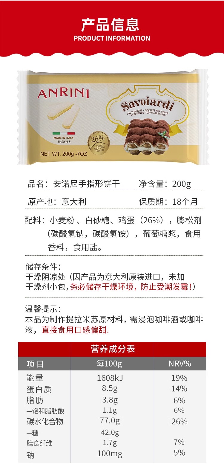 安诺尼手指饼干 提拉米苏原料 200g原装 烘焙原料 意大利进口