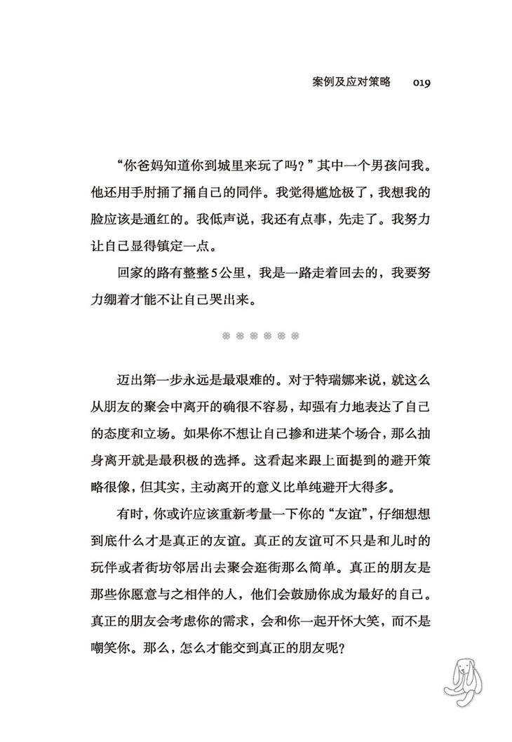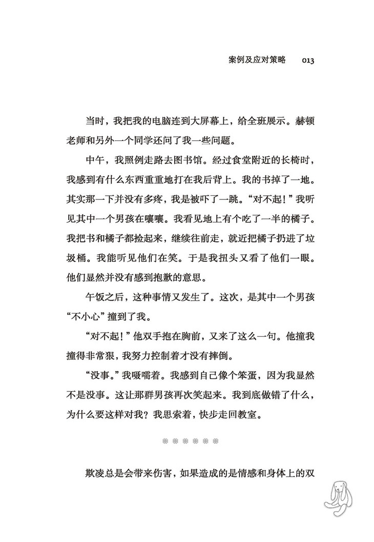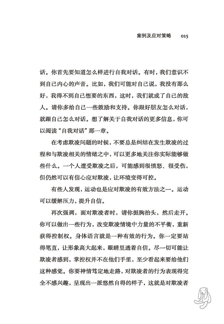 我希望有更多的儿童和青少年能够看到本书,并从本书中有所获益;也希望有更多的教师和家长看到本书,以有效帮助儿童和青少年应对校园欺凌的困扰,降低校园欺凌对儿童和青少年的不良影响。