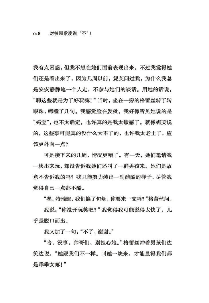 面对欺凌,最应该勇敢站出来大声说“不”的就是作为欺凌受害者乃至旁观者的你自己,就像本书讲述的26个故事中的主人公一样。有被同伴教唆抽烟的特瑞娜,有遭受恶意流言攻击的莱拉,还有遭到了文化歧视的帕特蕾……从中,你能学到应对欺凌的基本态度和各种方法,从而摆脱他人的不良影响,重新振作,让人生掌握在自己的手中。