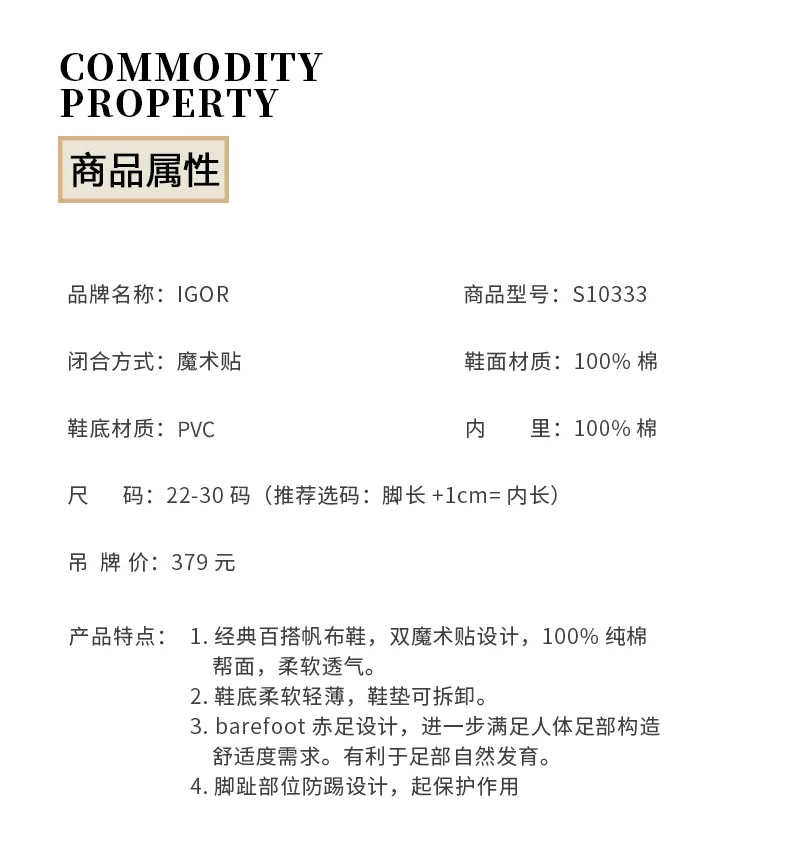 【云优选】igor西班牙儿童薄底小童鞋子纯棉魔术贴帆布鞋宝宝一脚蹬男女童鞋
