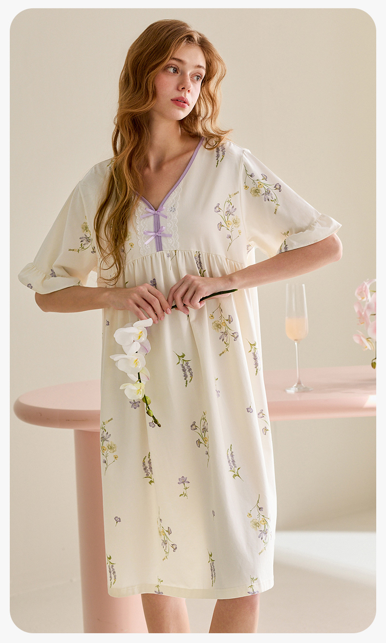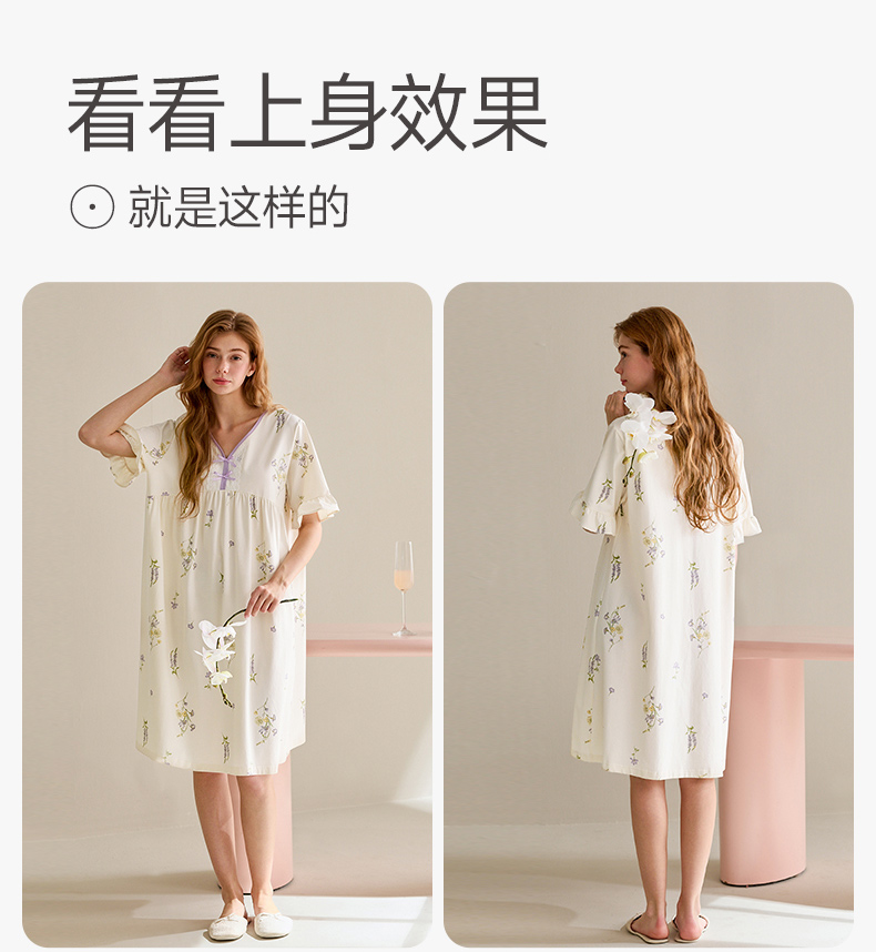 芬腾睡裙女纯棉短袖睡衣裙春夏季新款宽松休闲大码全棉家居服中裙