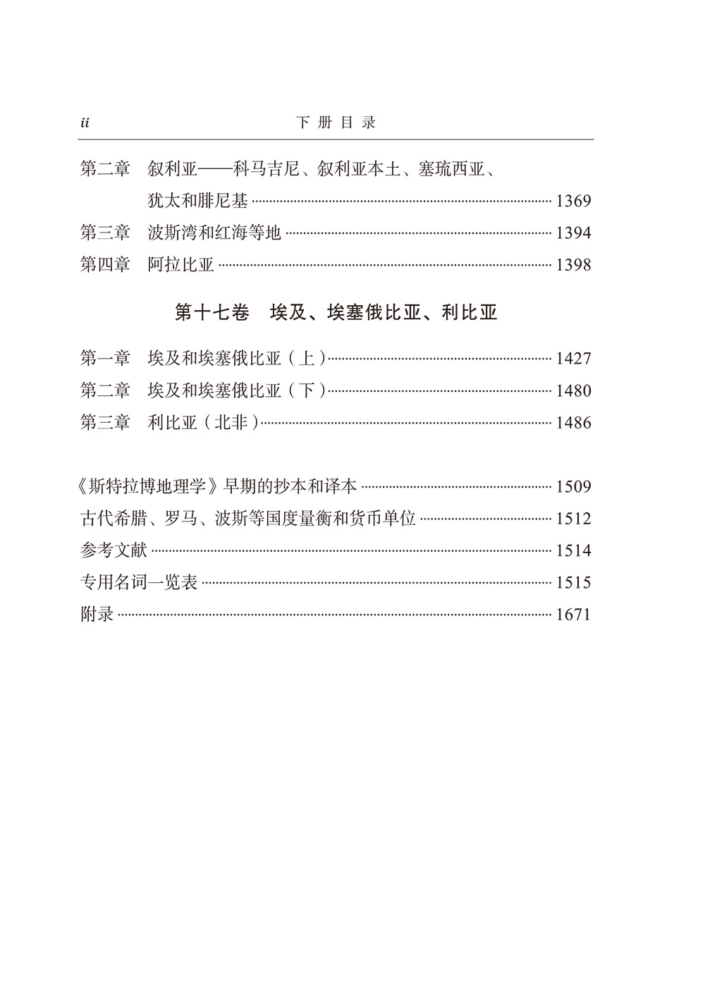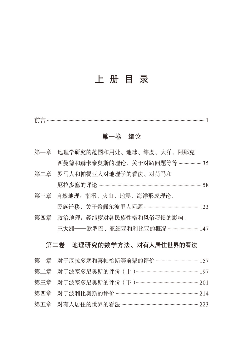全书共有17卷,除第一、二卷是绪论之外,其余全是对当时希腊人所知的、有人居住世界的描述。斯特拉博提出地理学的研究范围和用途,地球、纬度、大洋、阿那克西曼德和赫卡泰奥斯的理论、关于对跖问题、自然地理、政治地理、三大洲的划分原则地理研究的数学方法和有人居住世界的看法,等等。全书大体上按照自西向东的布局,详细地介绍了罗马帝国、希腊、古代中亚地区、小亚细亚地区、非洲等地的历史、地理、经济及外贸等情况,是一部范围最广、内容最全面的、真正的古代地理学著作。作为古代世界最宏伟的地理学著作,本书在学术上具有的水恒价值是难以估量的。本书引用了许多古代地理资料,无意之中保存了许多已经失传的上古地理著作,现代学者正是借助于本书,把许多已经失传的古籍钩沉出来。