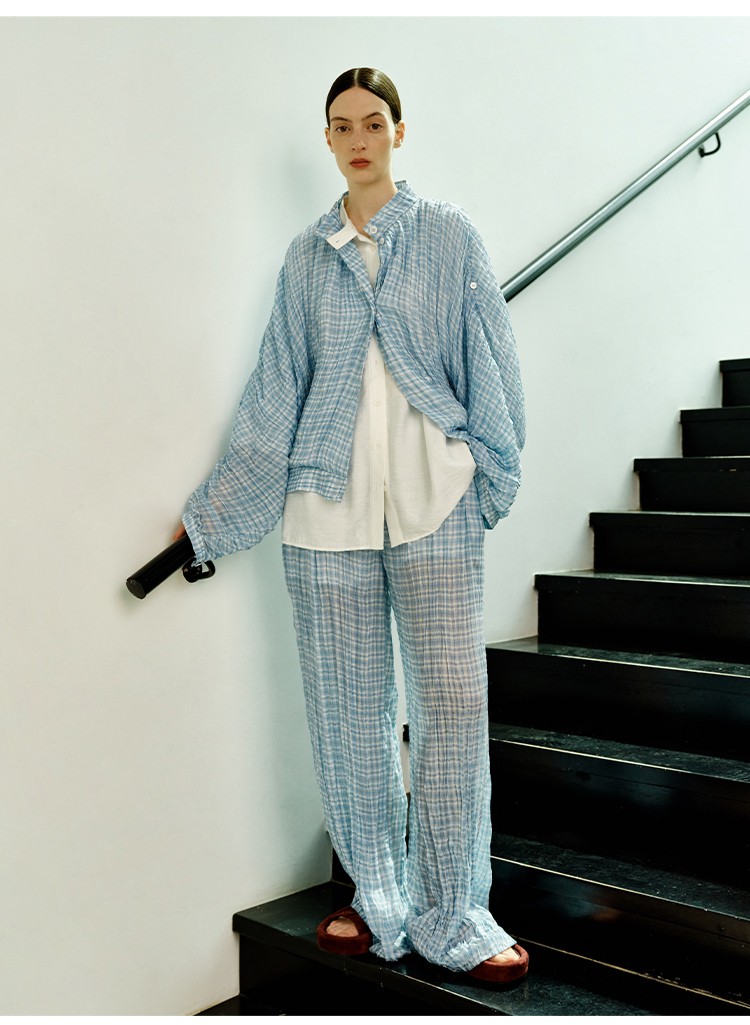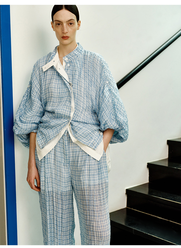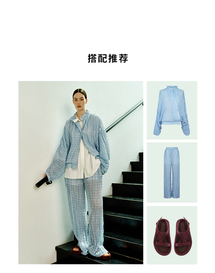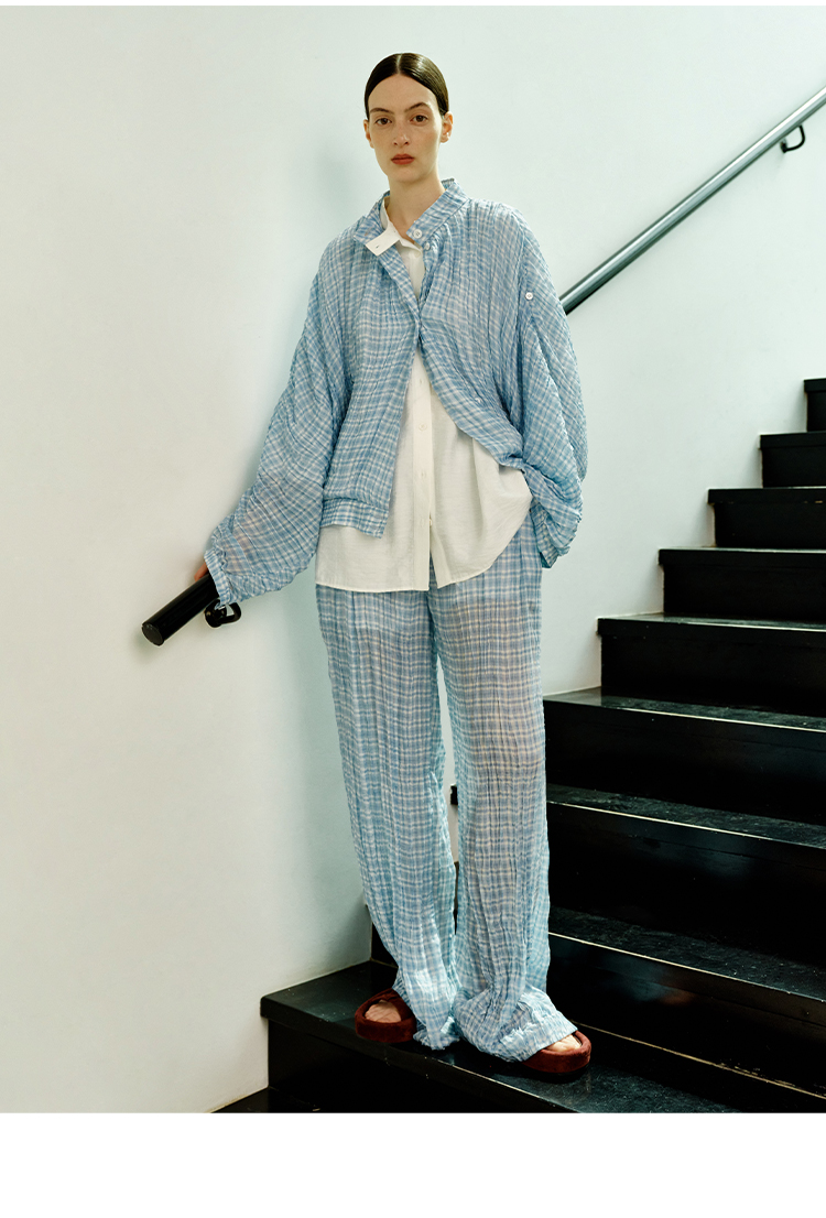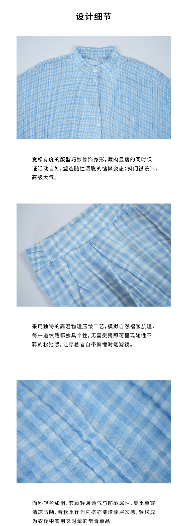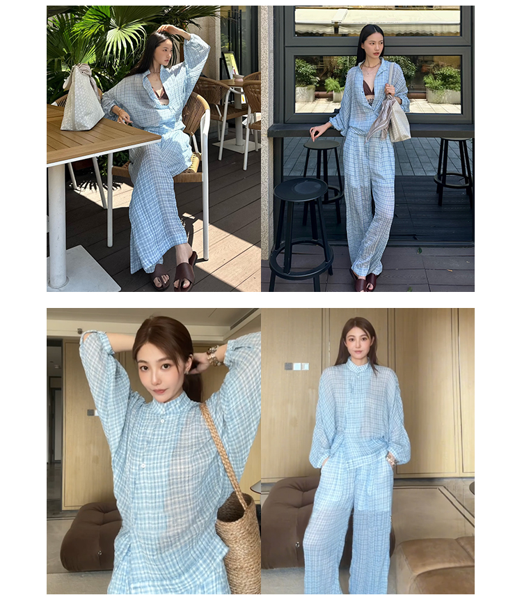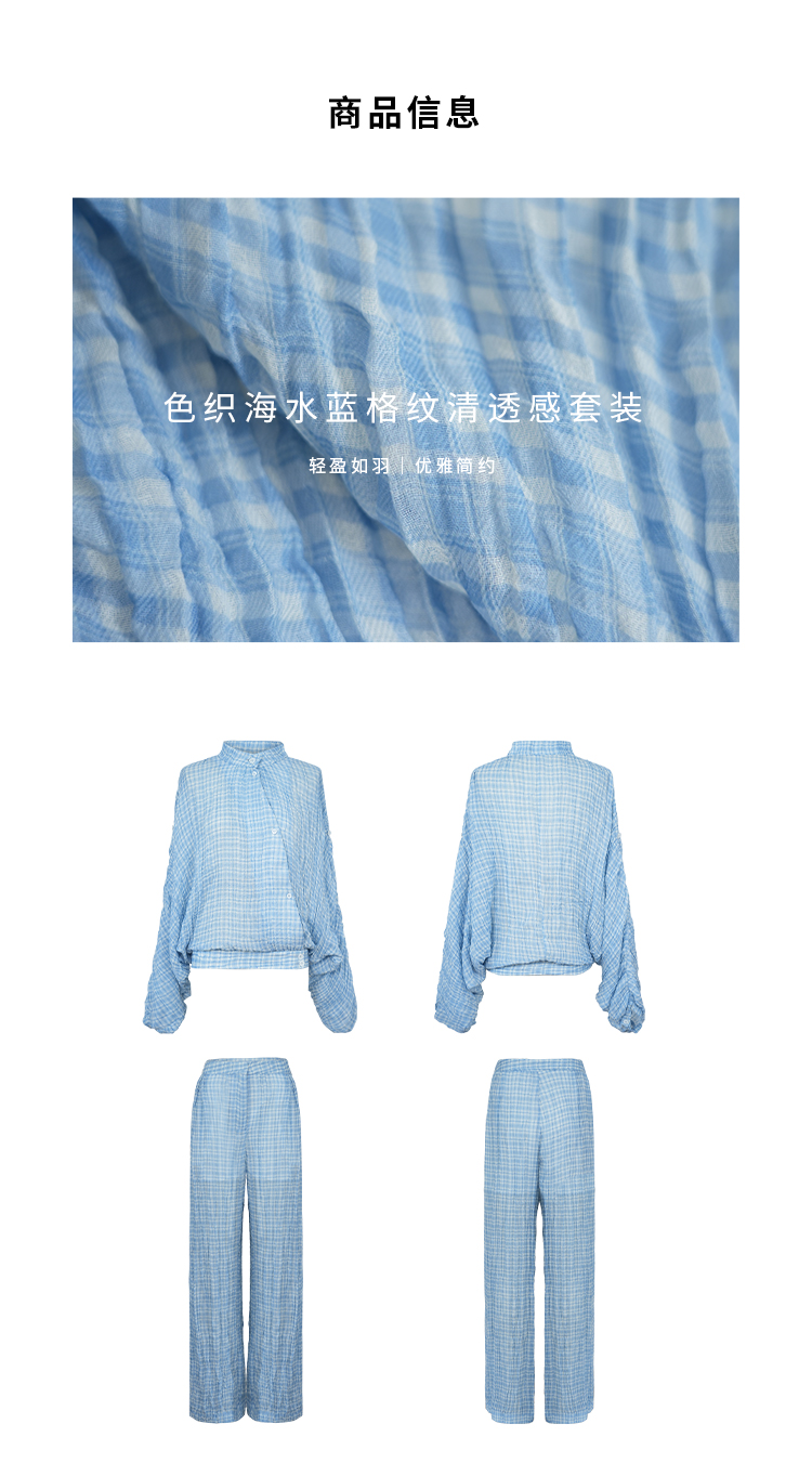 HIDEMI 度假系列色织海水蓝格纹清透感斜门襟设计压褶立领防晒款超薄外套衬衫套装 上衣/阔腿裤