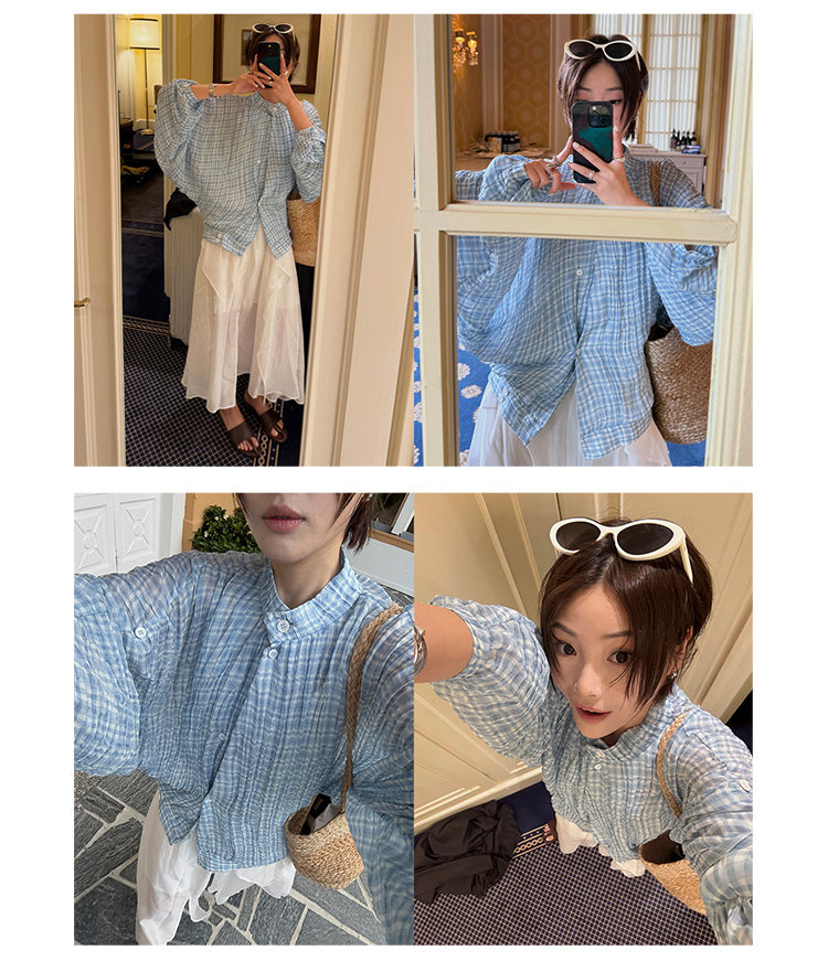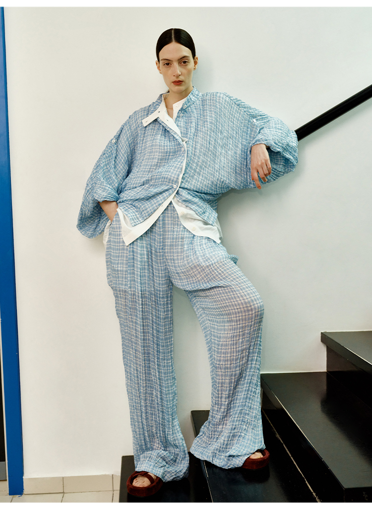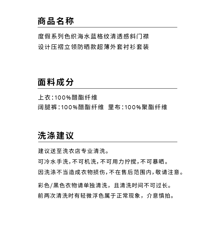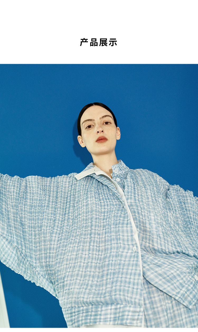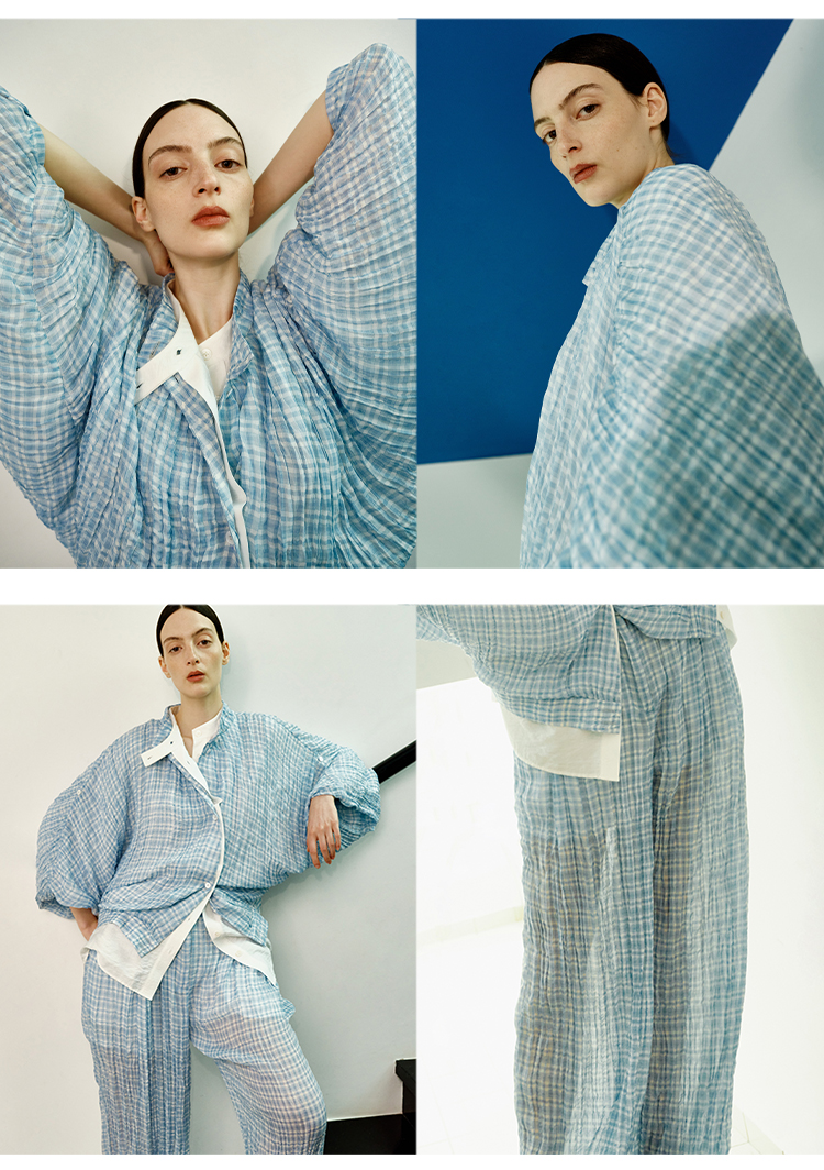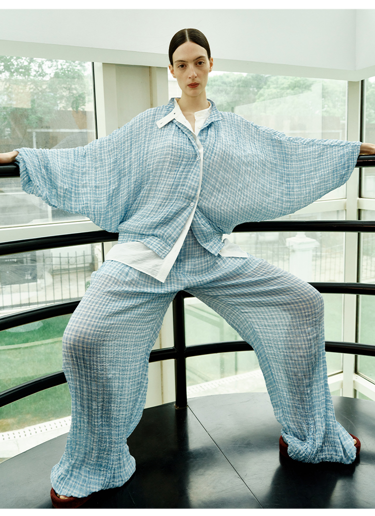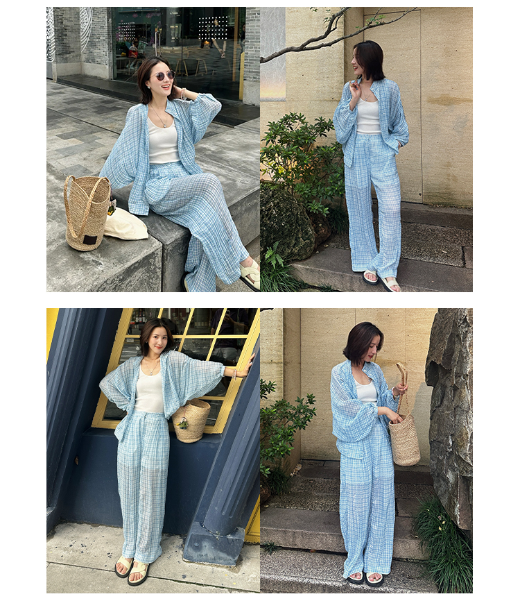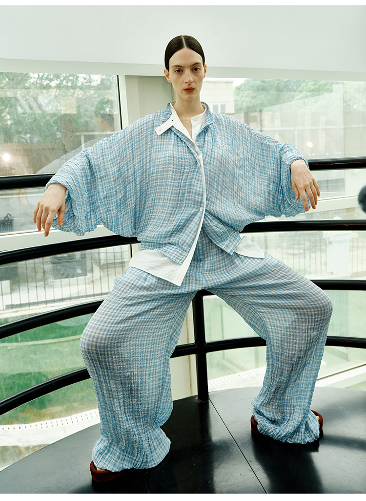 HIDEMI 度假系列色织海水蓝格纹清透感斜门襟设计压褶立领防晒款超薄外套衬衫套装 上衣/阔腿裤