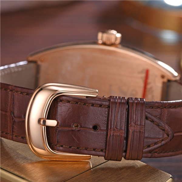 镜面材质 | 蓝宝石水晶玻璃 | 表盘 | 18K玫瑰金表壳 棕色酒桶型表盘 白色弧形阿拉伯数字时标 大三针 日期显示 密底 |
