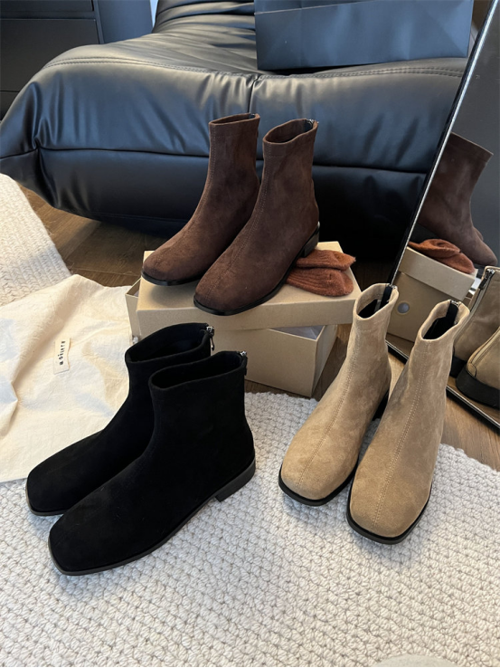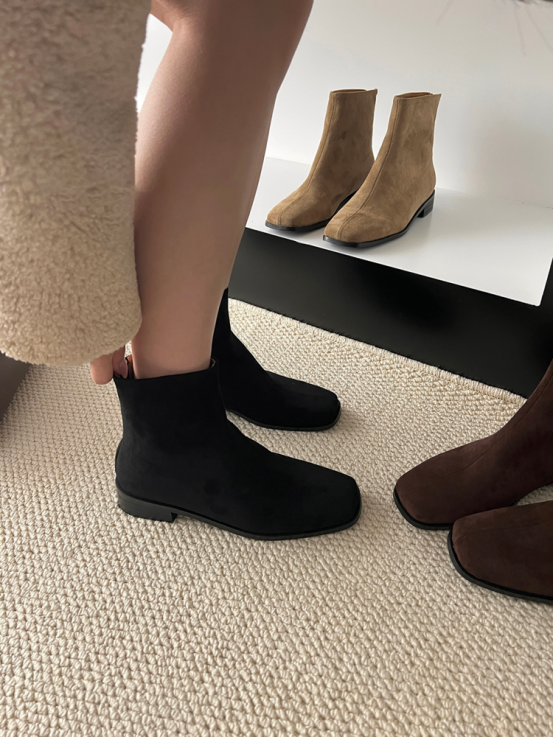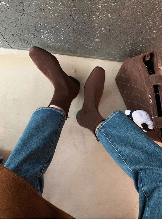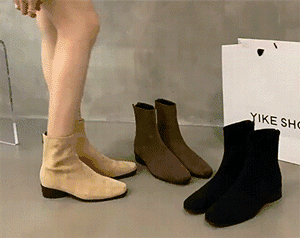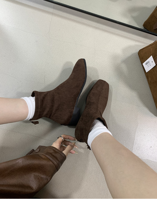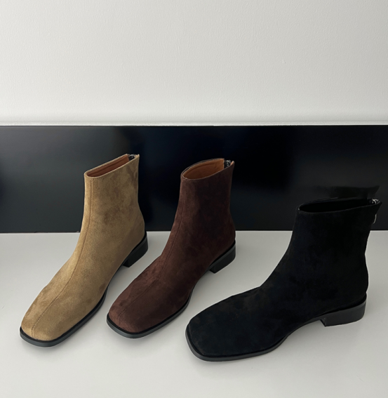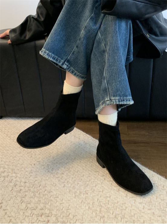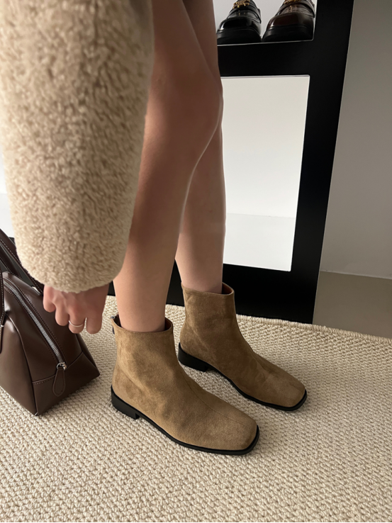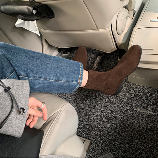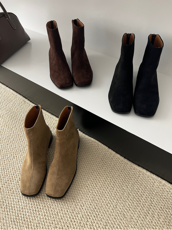 你离韩里韩气的氛围感穿搭只差这双小短靴! 🍂秋冬味道十足的绒面 整双靴都很软可暴走哦! 配上小方头和低跟 时髦气质配直筒牛仔裤 裙子 大衣 都很百搭!!