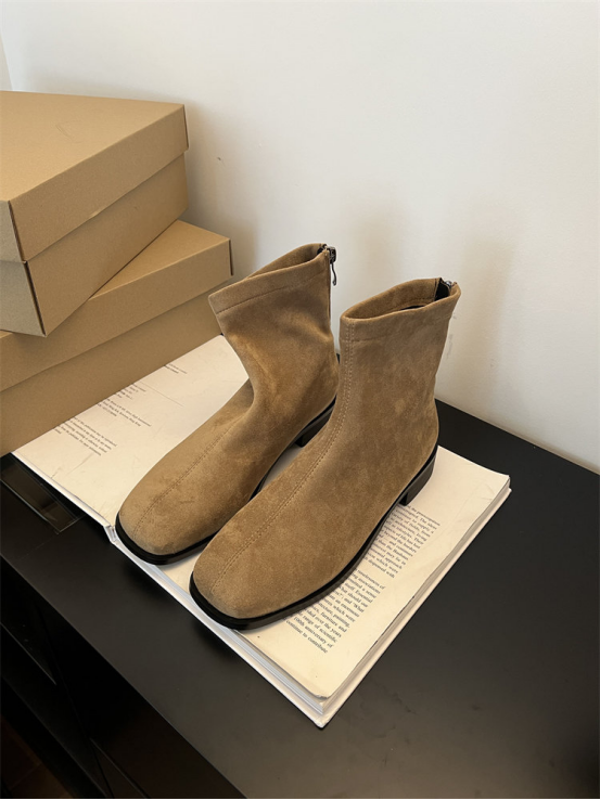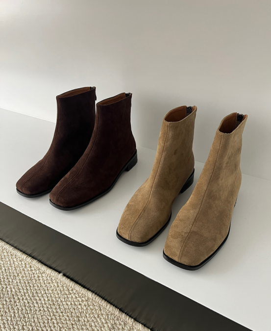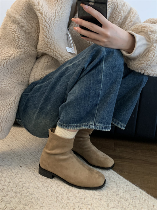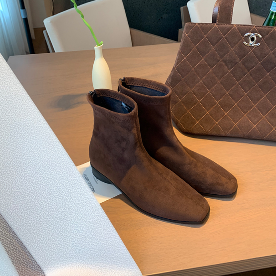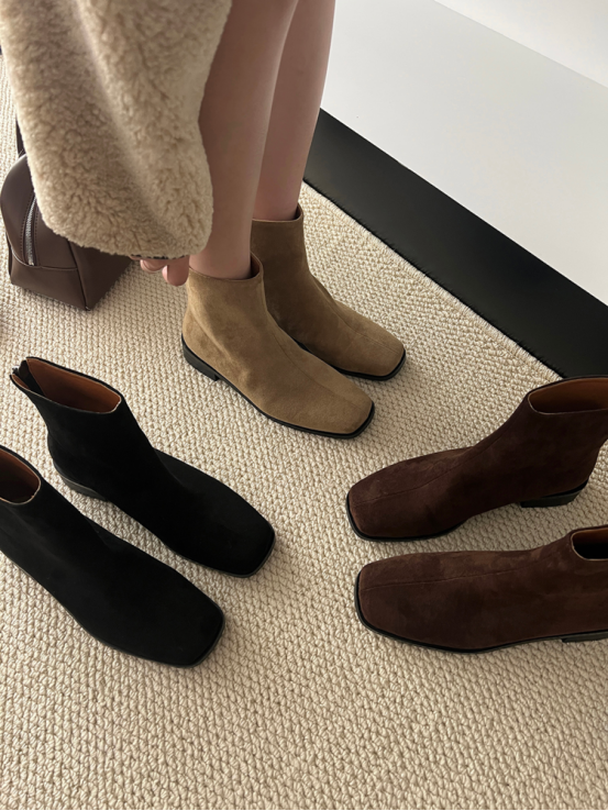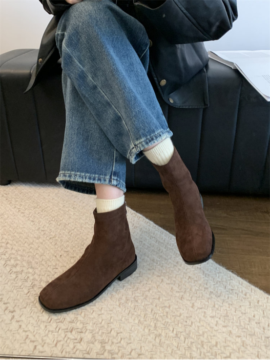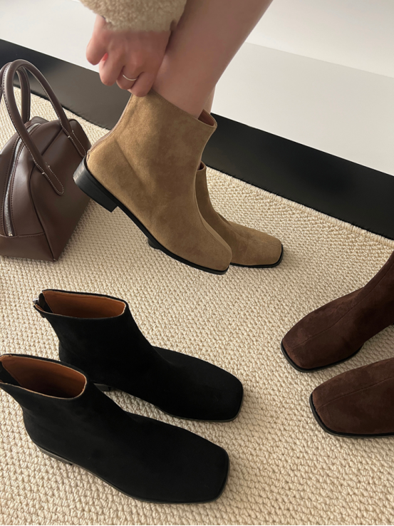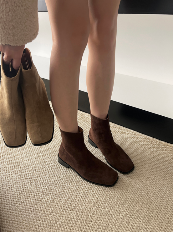 你离韩里韩气的氛围感穿搭只差这双小短靴! 🍂秋冬味道十足的绒面 整双靴都很软可暴走哦! 配上小方头和低跟 时髦气质配直筒牛仔裤 裙子 大衣 都很百搭!!