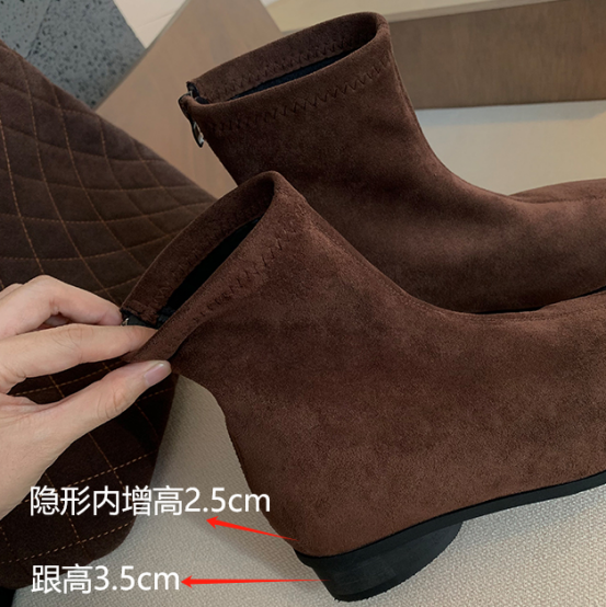 脚宽脚胖的女生请认准它 隐形内增高2.5cm噢!! 小方头设计时髦不挑人 内留空间充足,穿着也好秀气 名副其实瘦瘦靴 显瘦不止一点点!!
