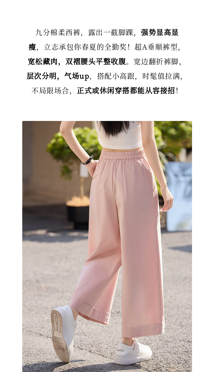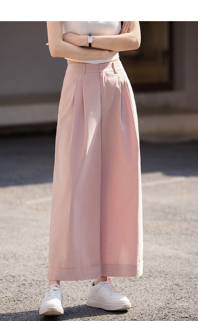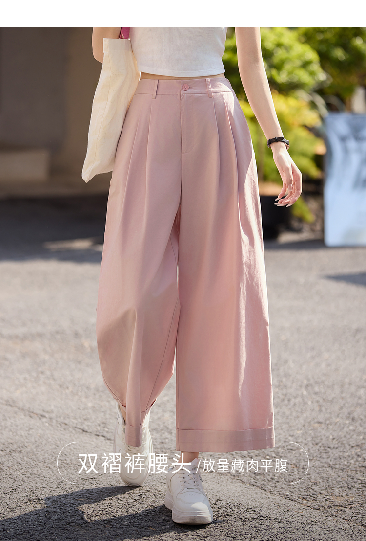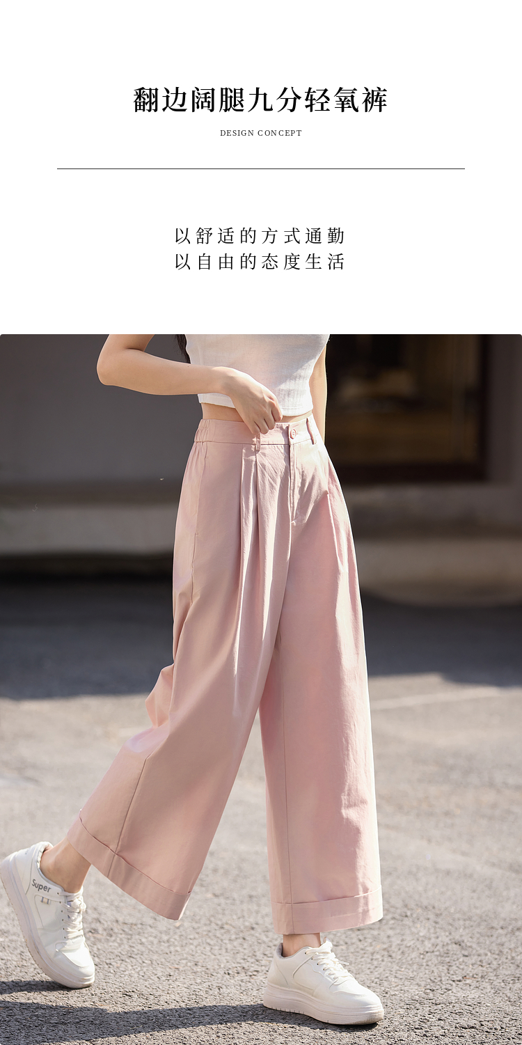 【专属特价】熙世界100%纯棉九分阔腿裤女夏季薄款通勤高腰宽松卷边直筒休闲裤