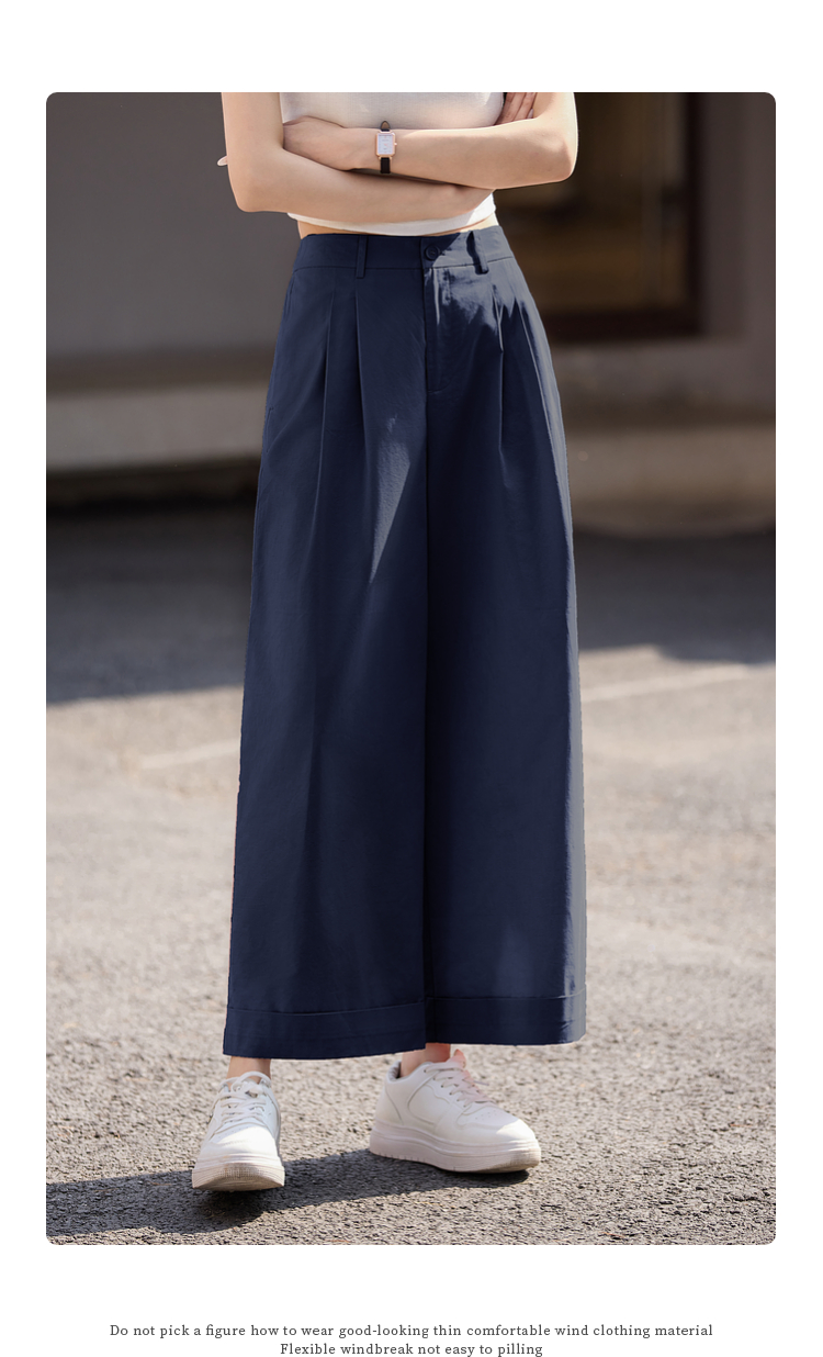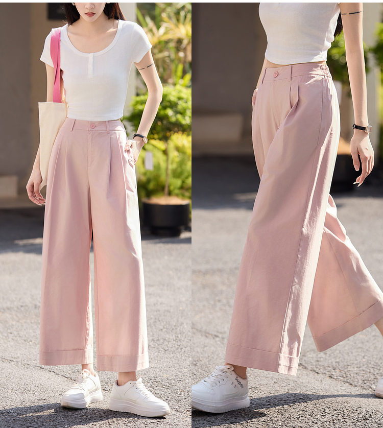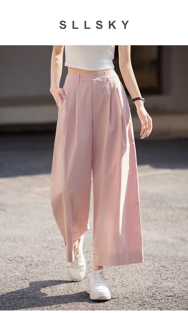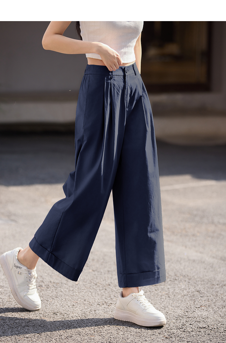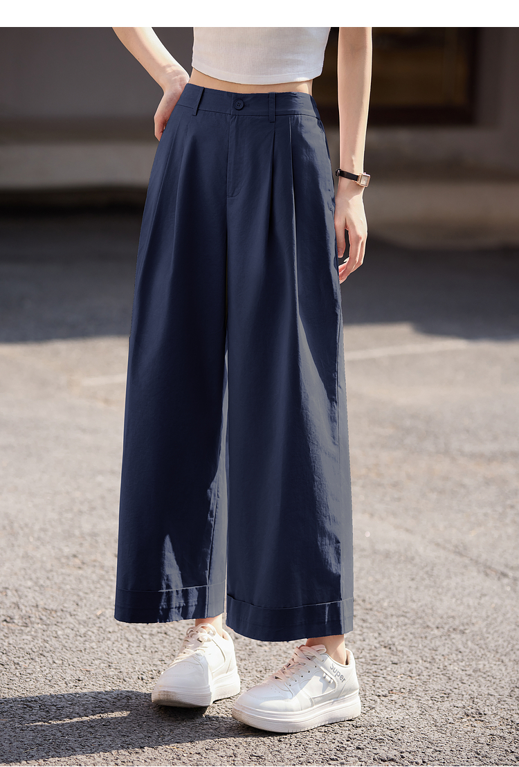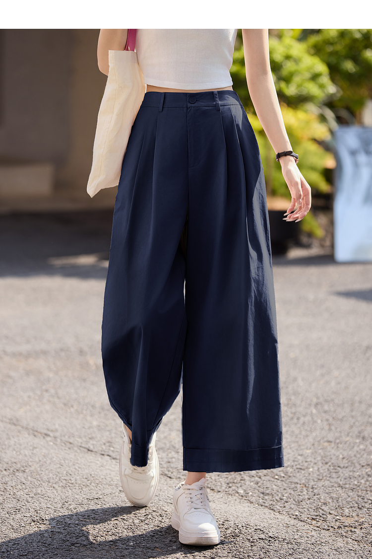 【专属特价】熙世界100%纯棉九分阔腿裤女夏季薄款通勤高腰宽松卷边直筒休闲裤