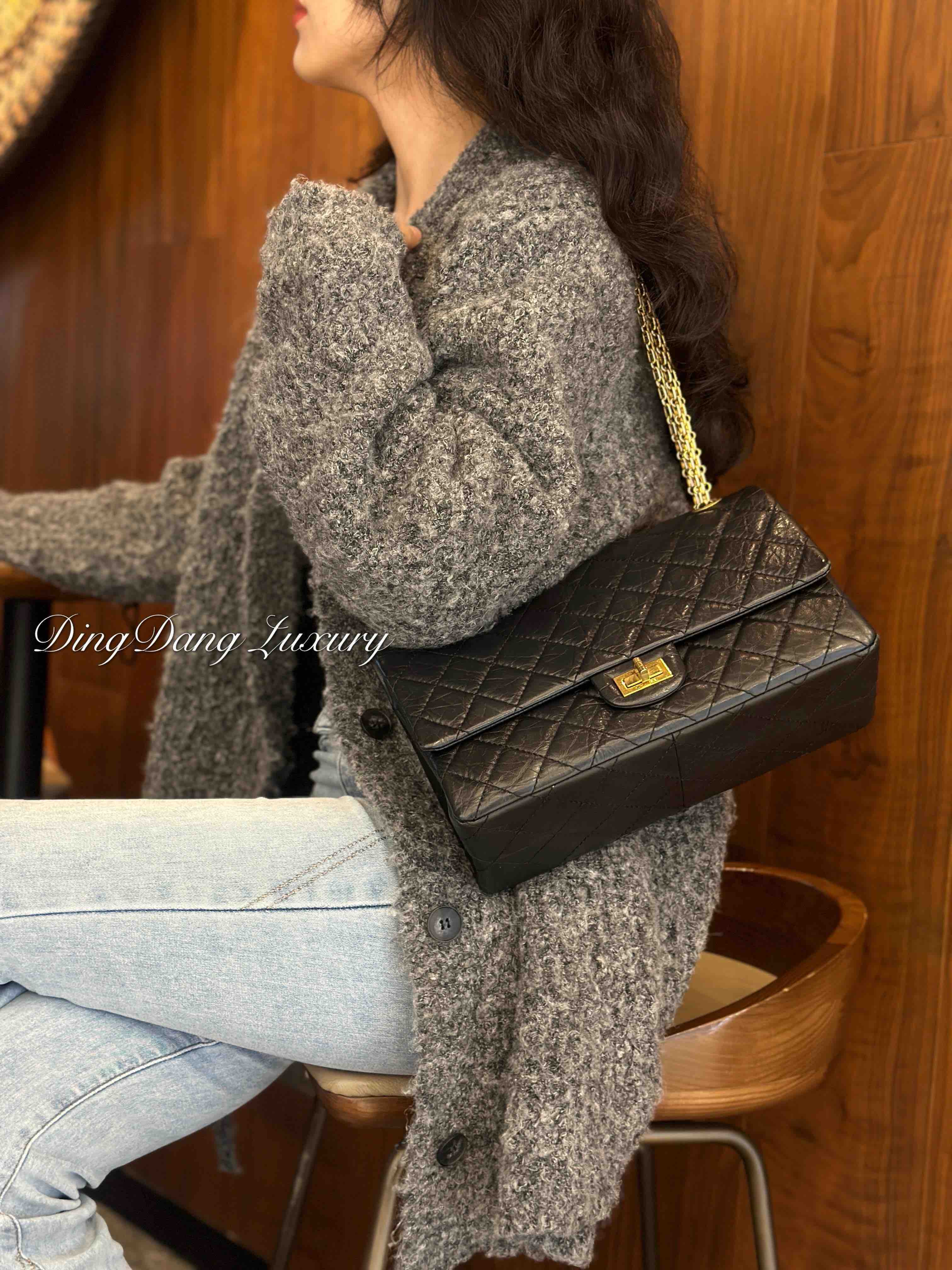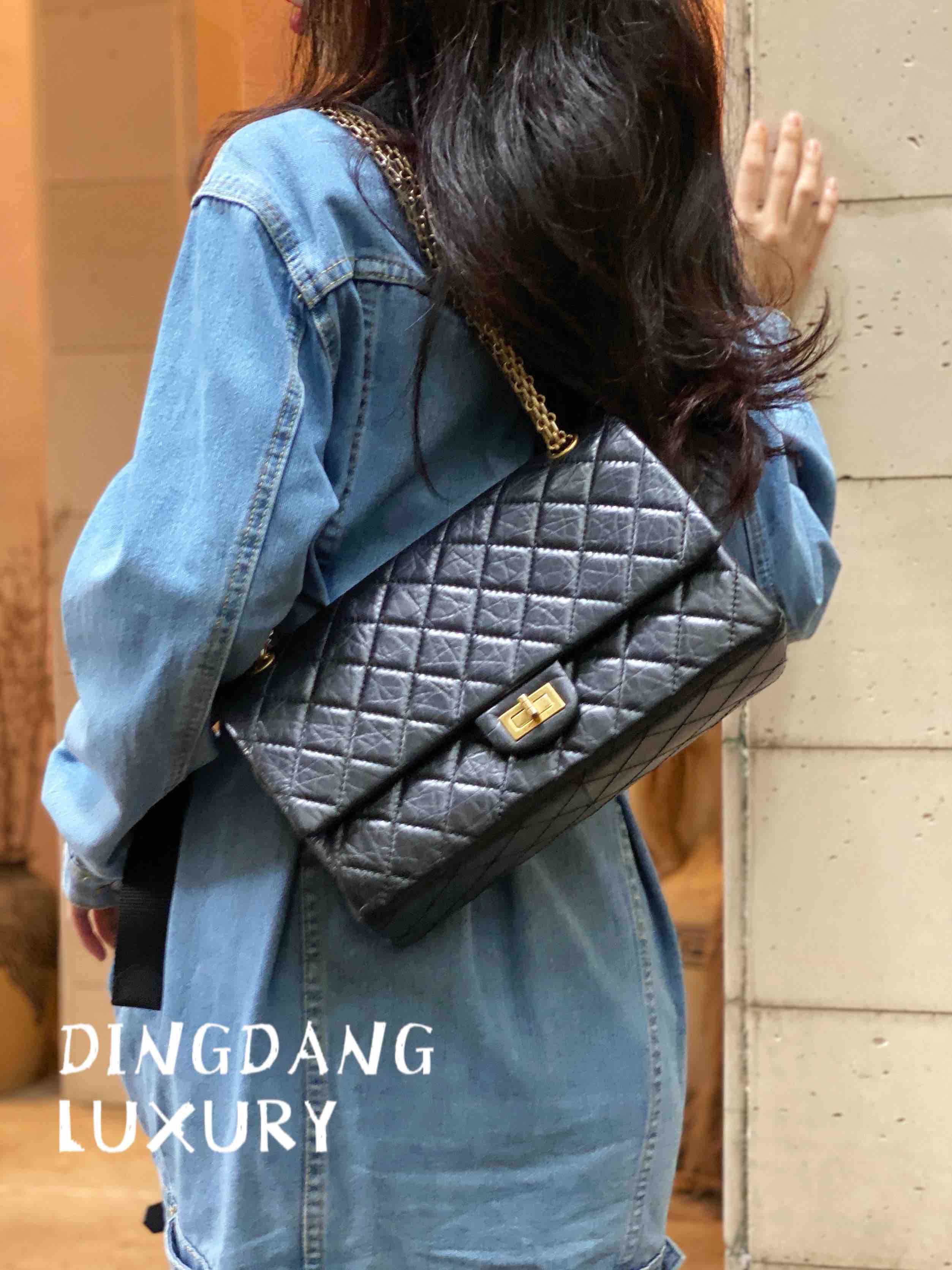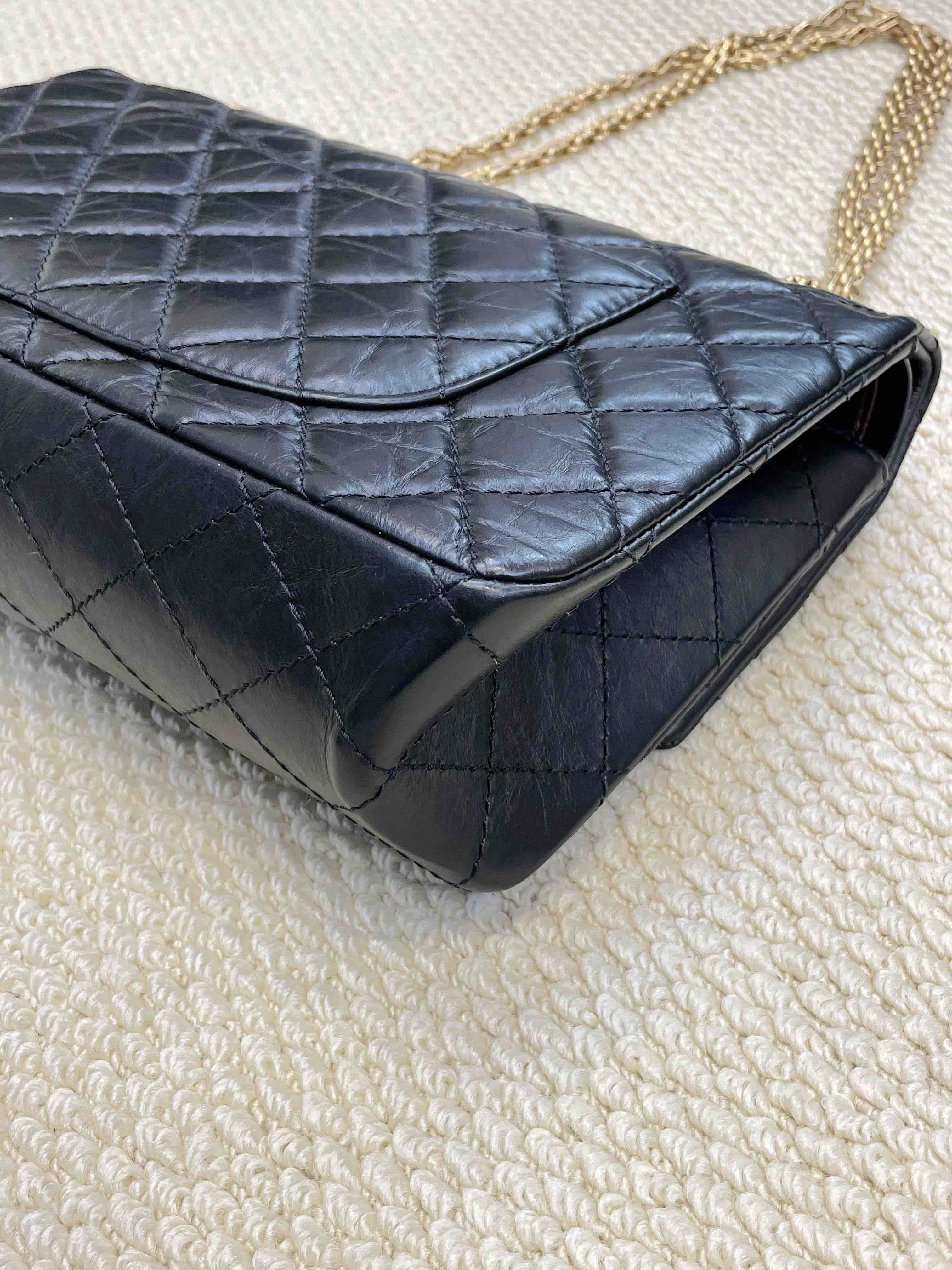 Chanel 2.55 油蜡牛皮 黑金 中号 单肩包
