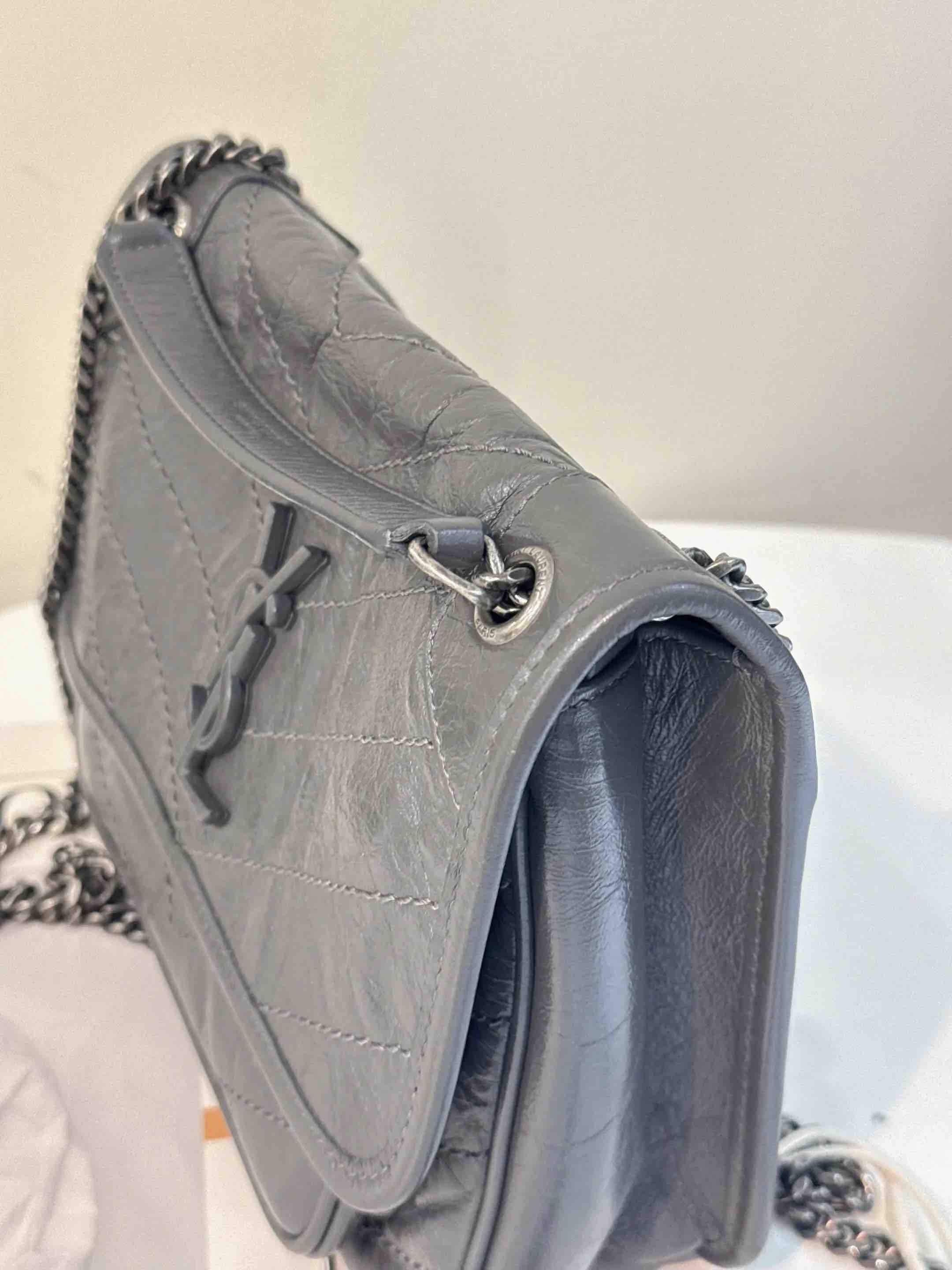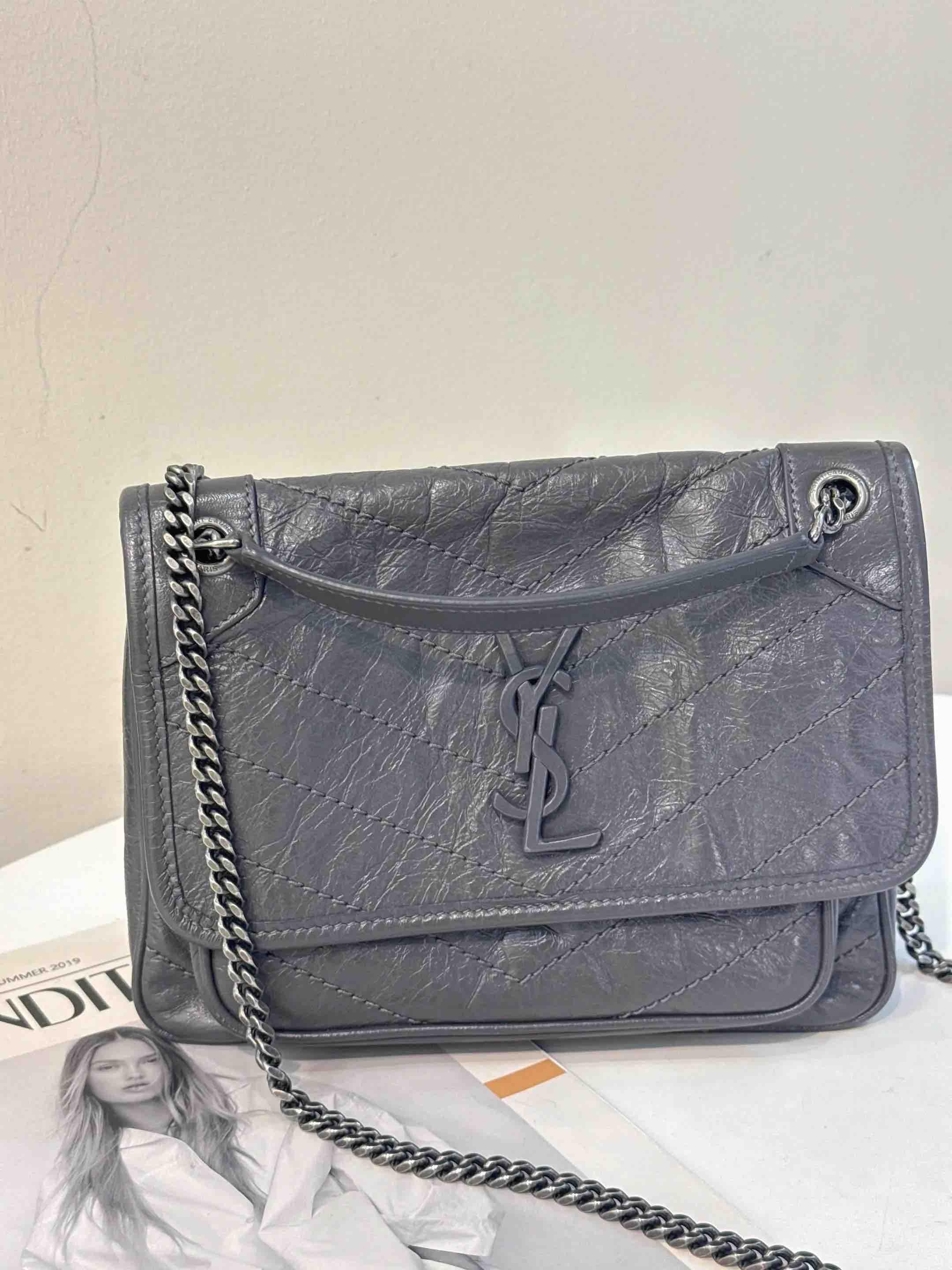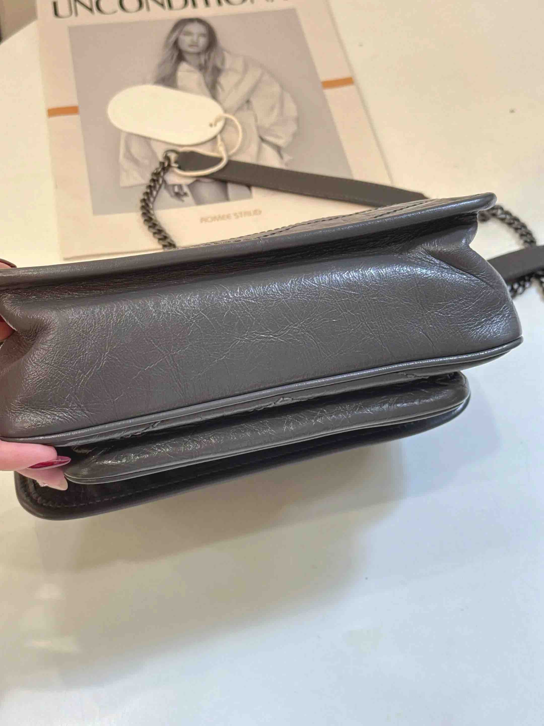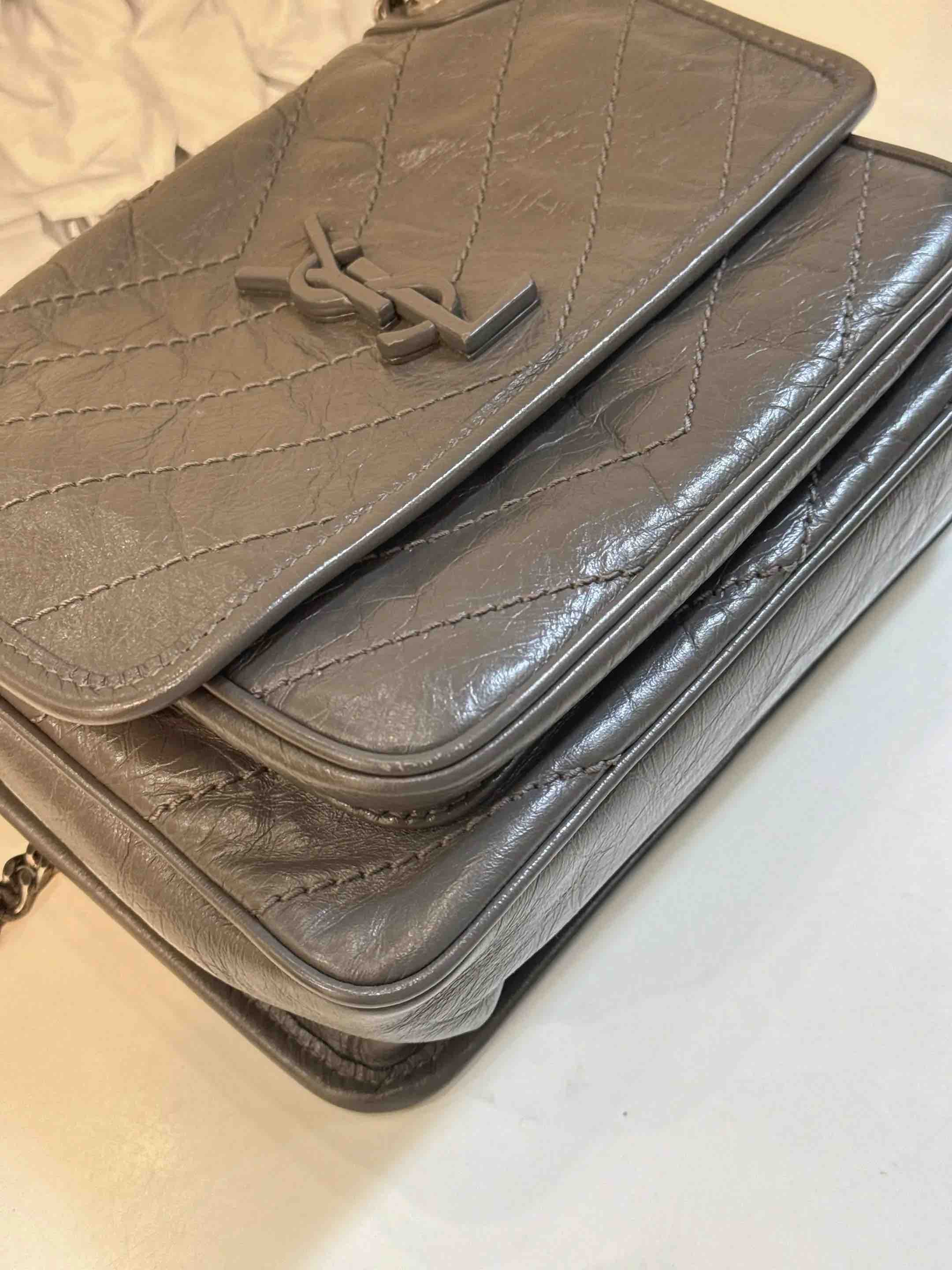 【商品详情】正品二手 YSL Niki 小号 灰色 D扣 油蜡牛皮 斜挎包🩶 98新 28×20 配件:卡 防尘袋。复古褶皱设计 街头感十足