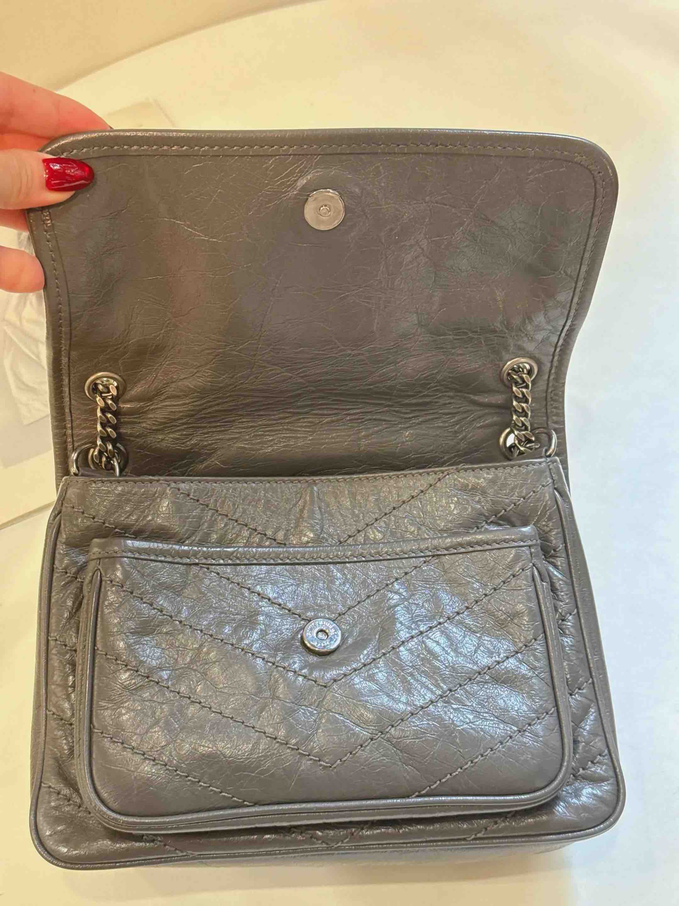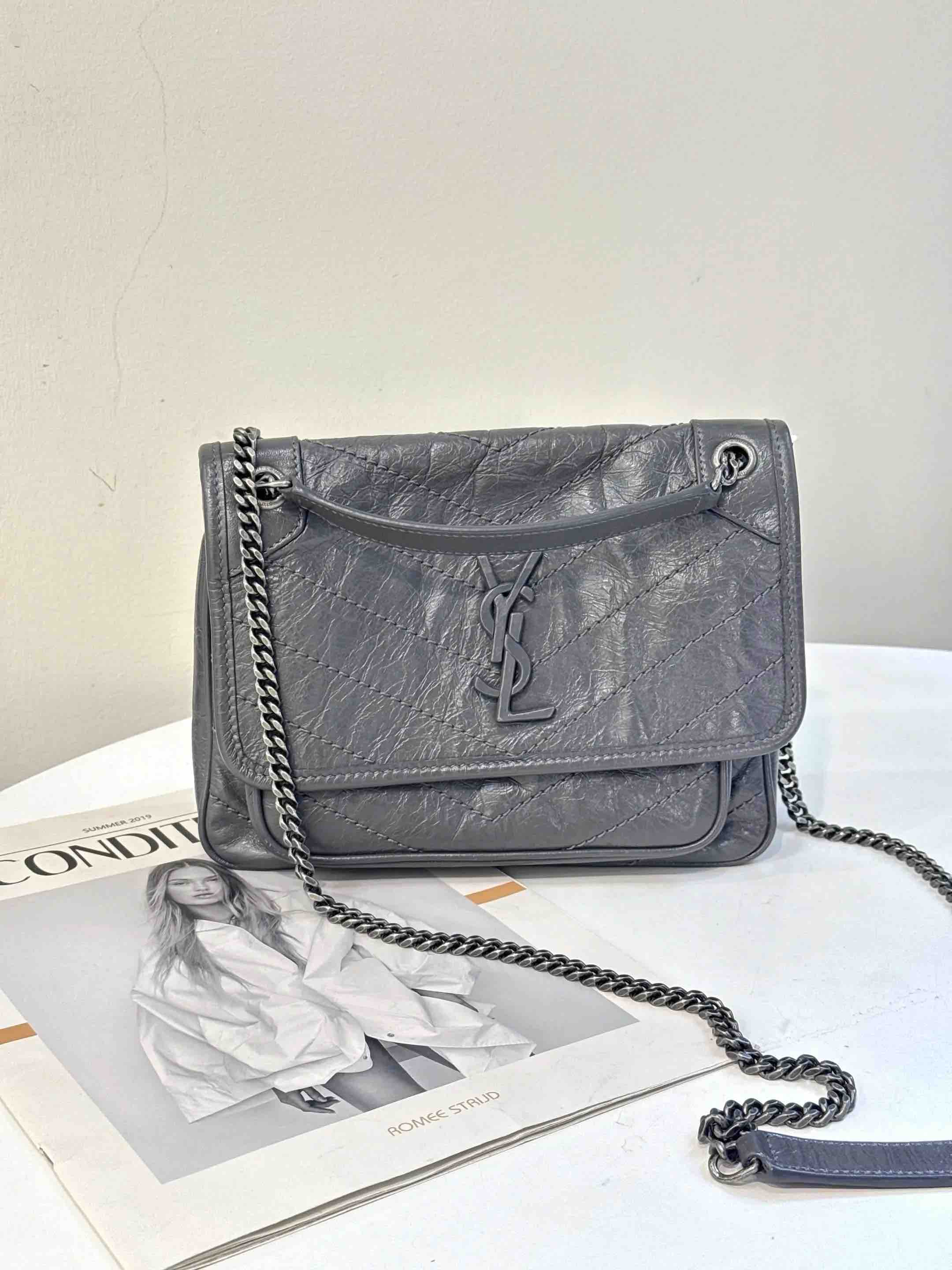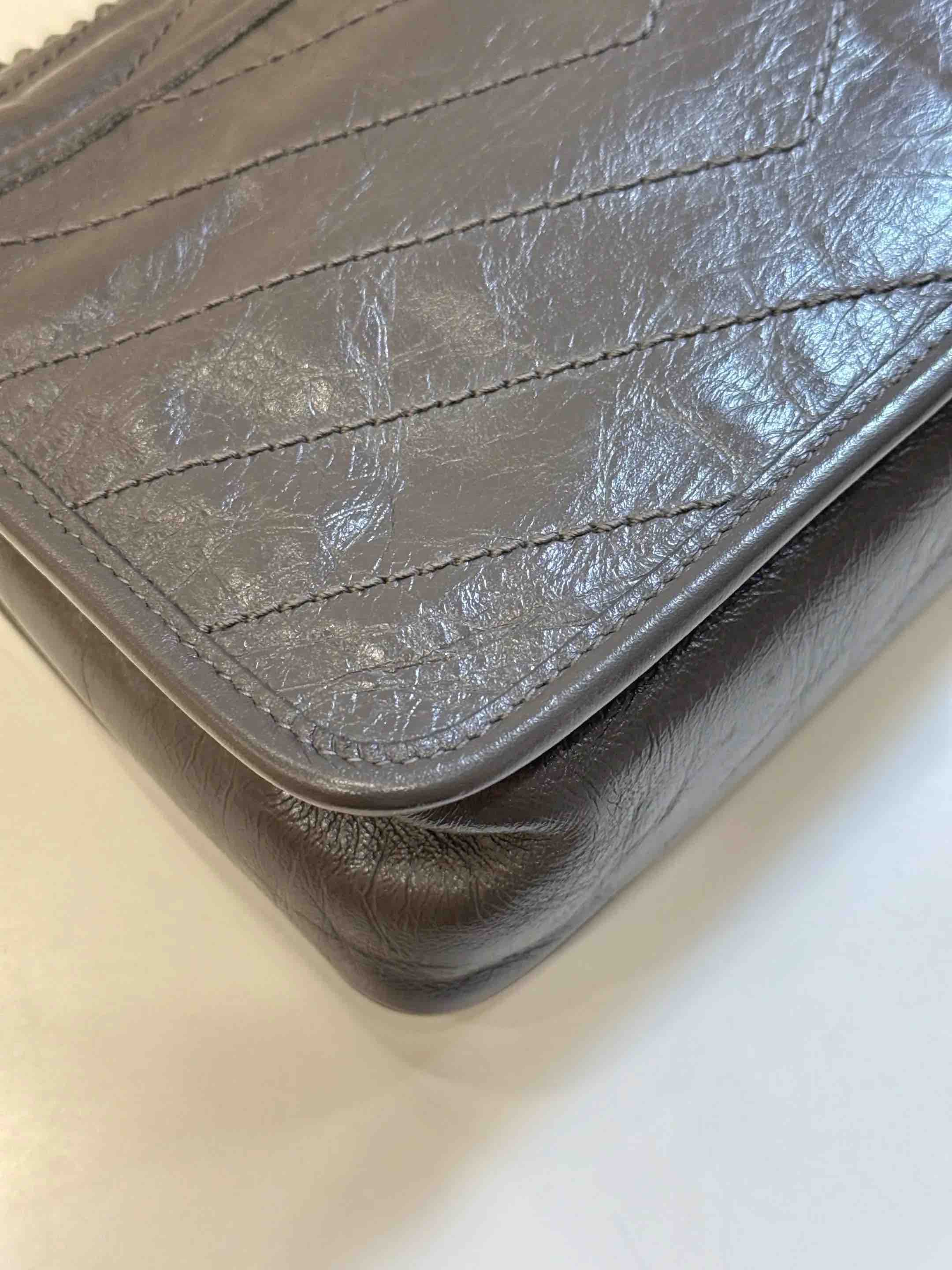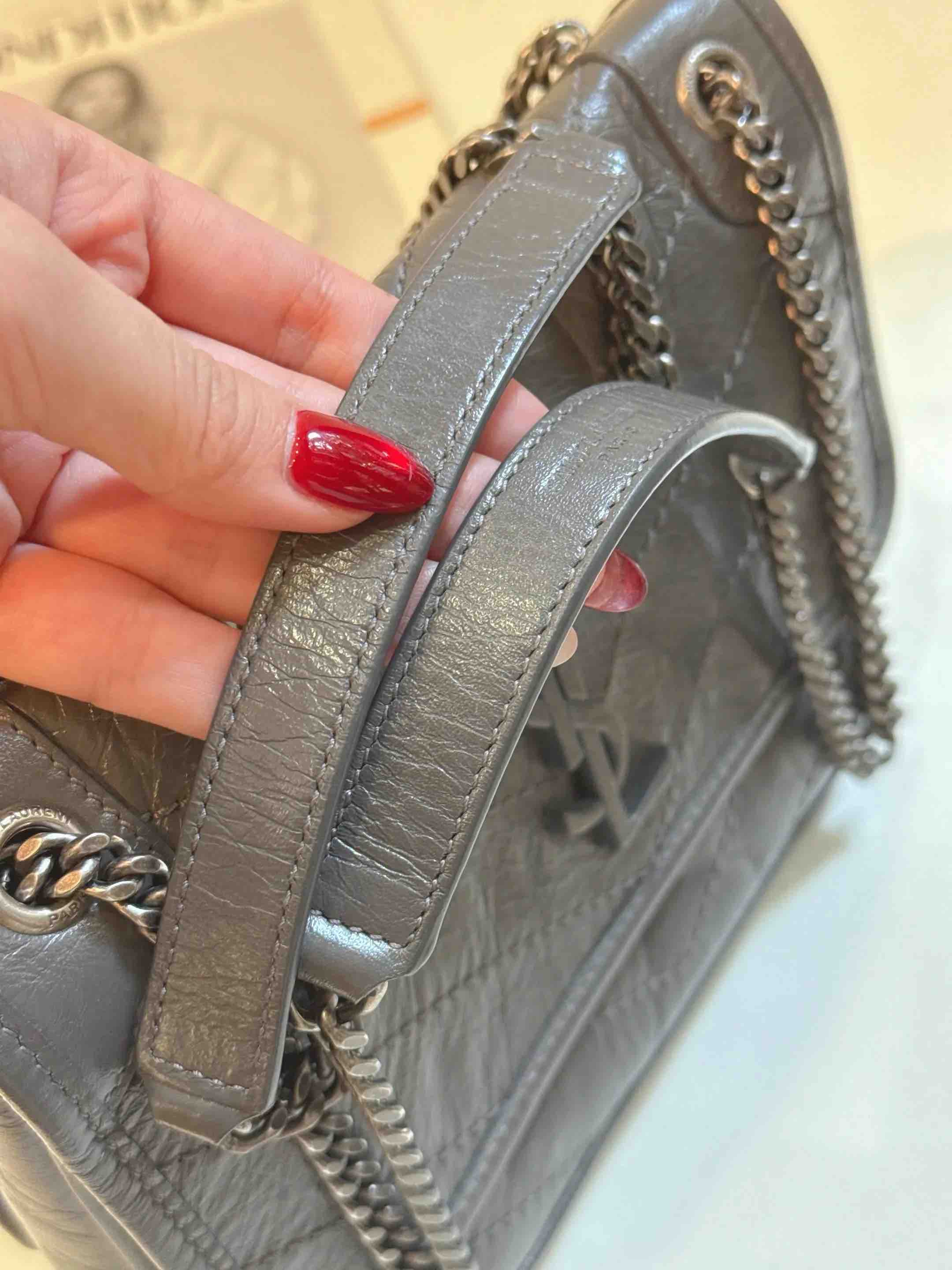 【商品详情】正品二手 YSL Niki 小号 灰色 D扣 油蜡牛皮 斜挎包🩶 98新 28×20 配件:卡 防尘袋。复古褶皱设计 街头感十足