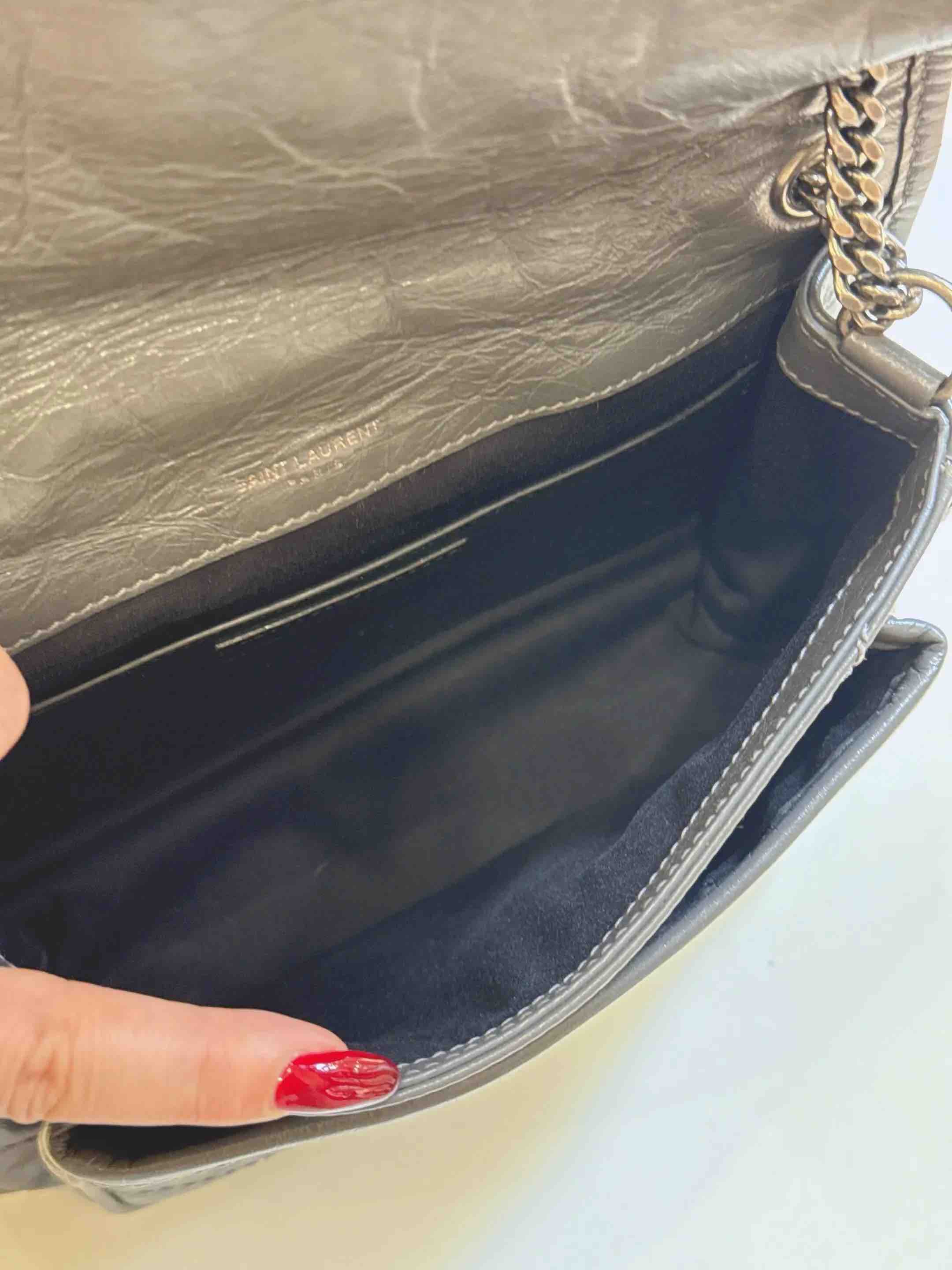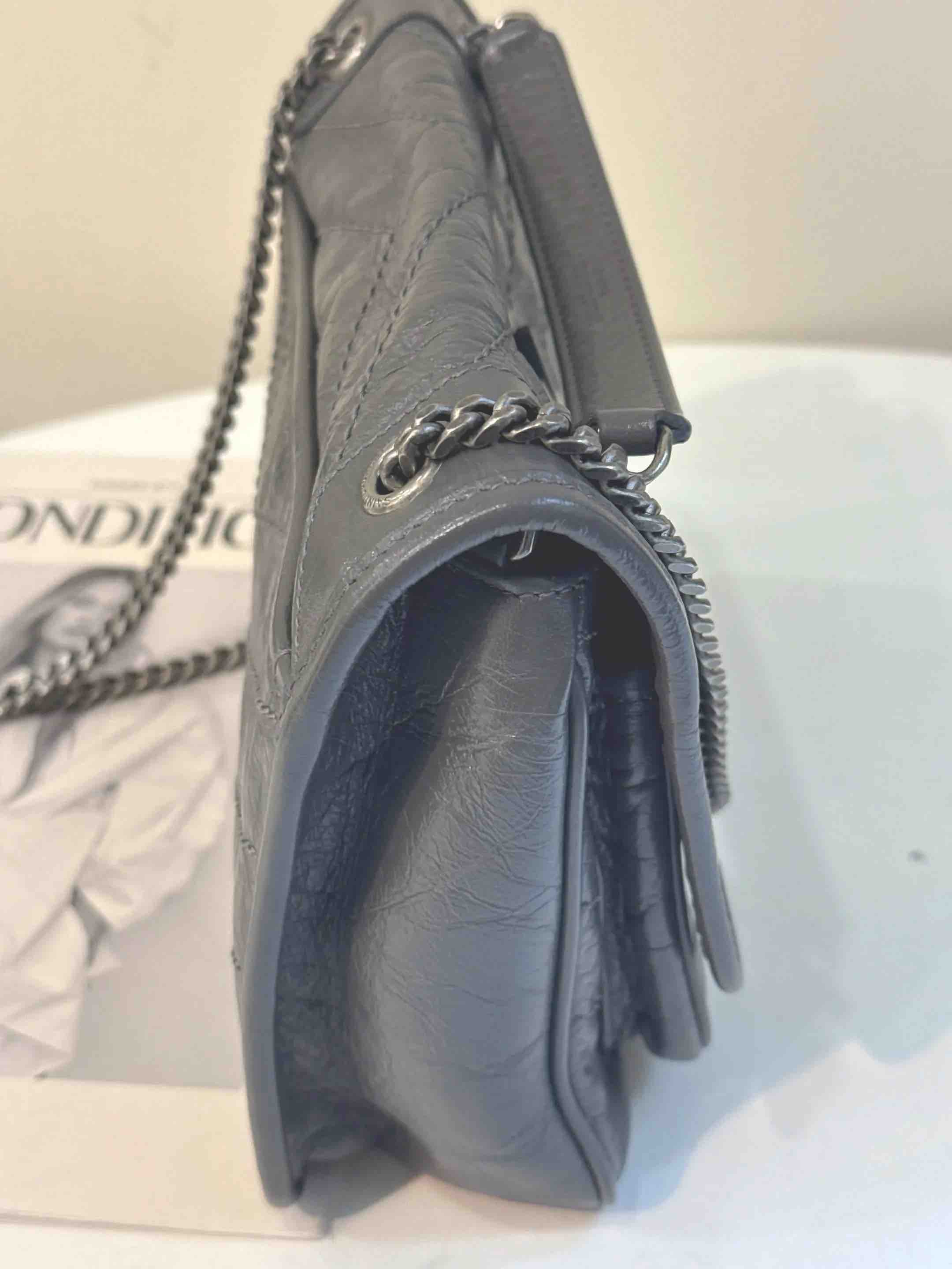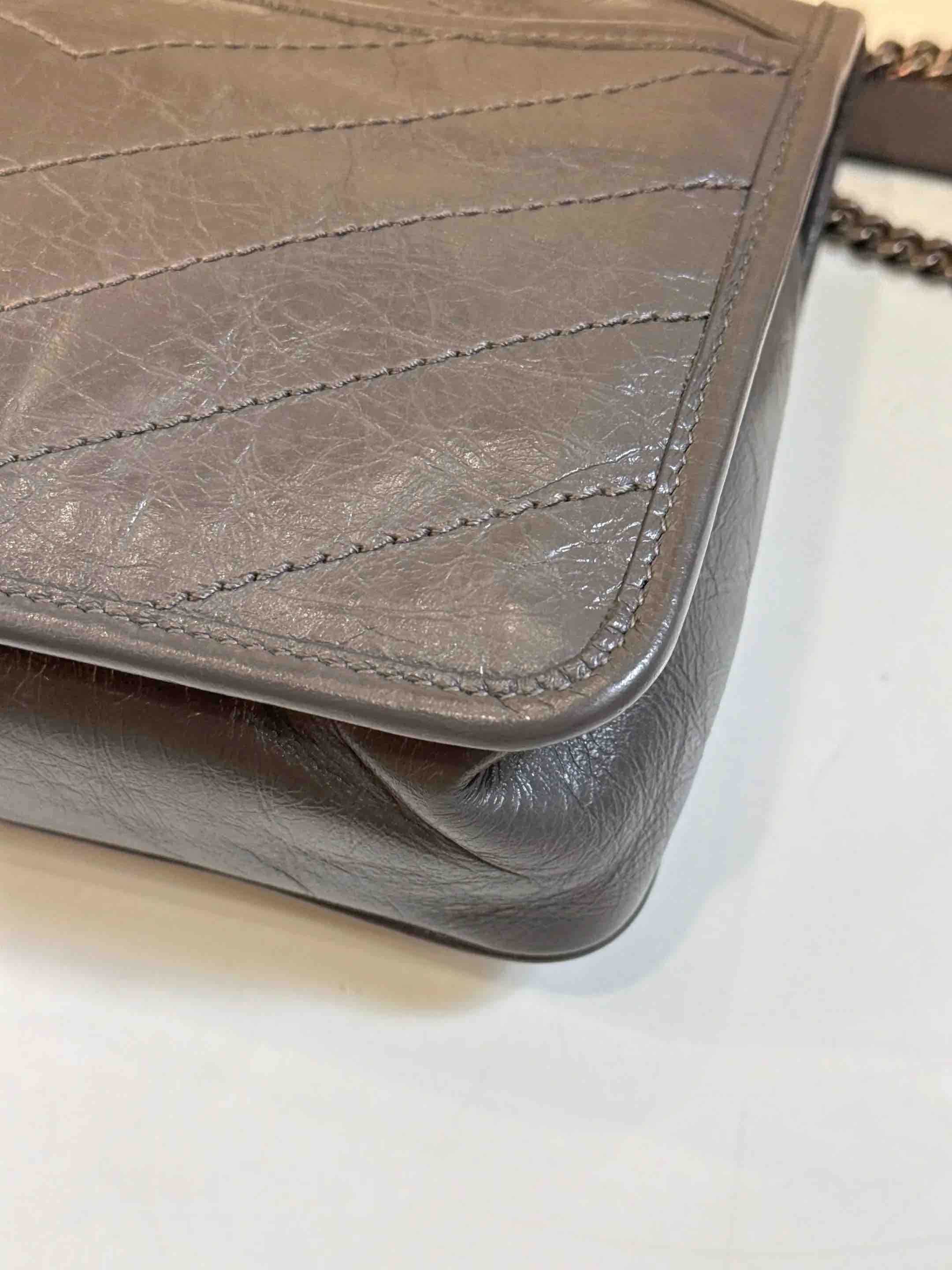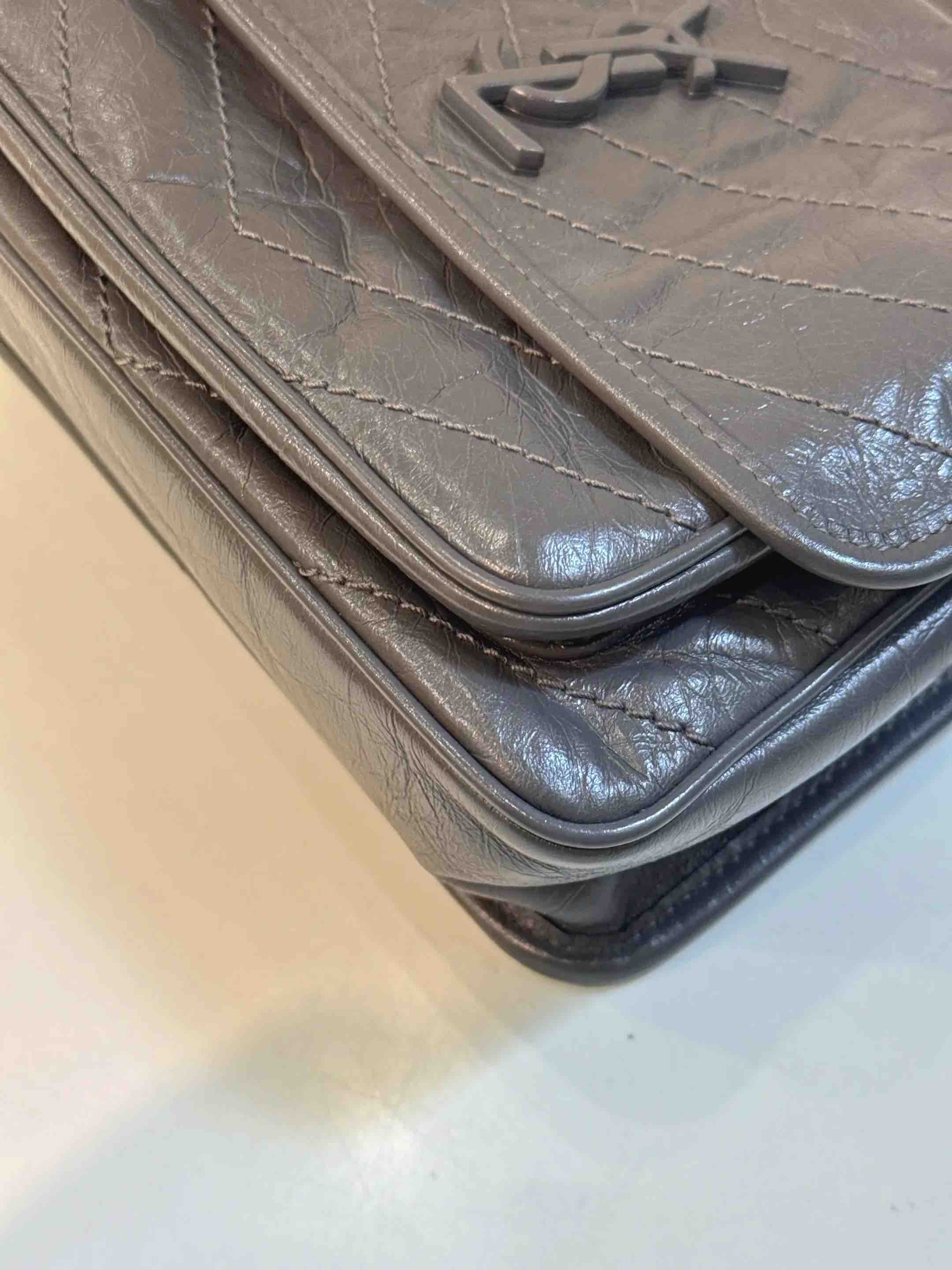 【商品详情】正品二手 YSL Niki 小号 灰色 D扣 油蜡牛皮 斜挎包🩶 98新 28×20 配件:卡 防尘袋。复古褶皱设计 街头感十足