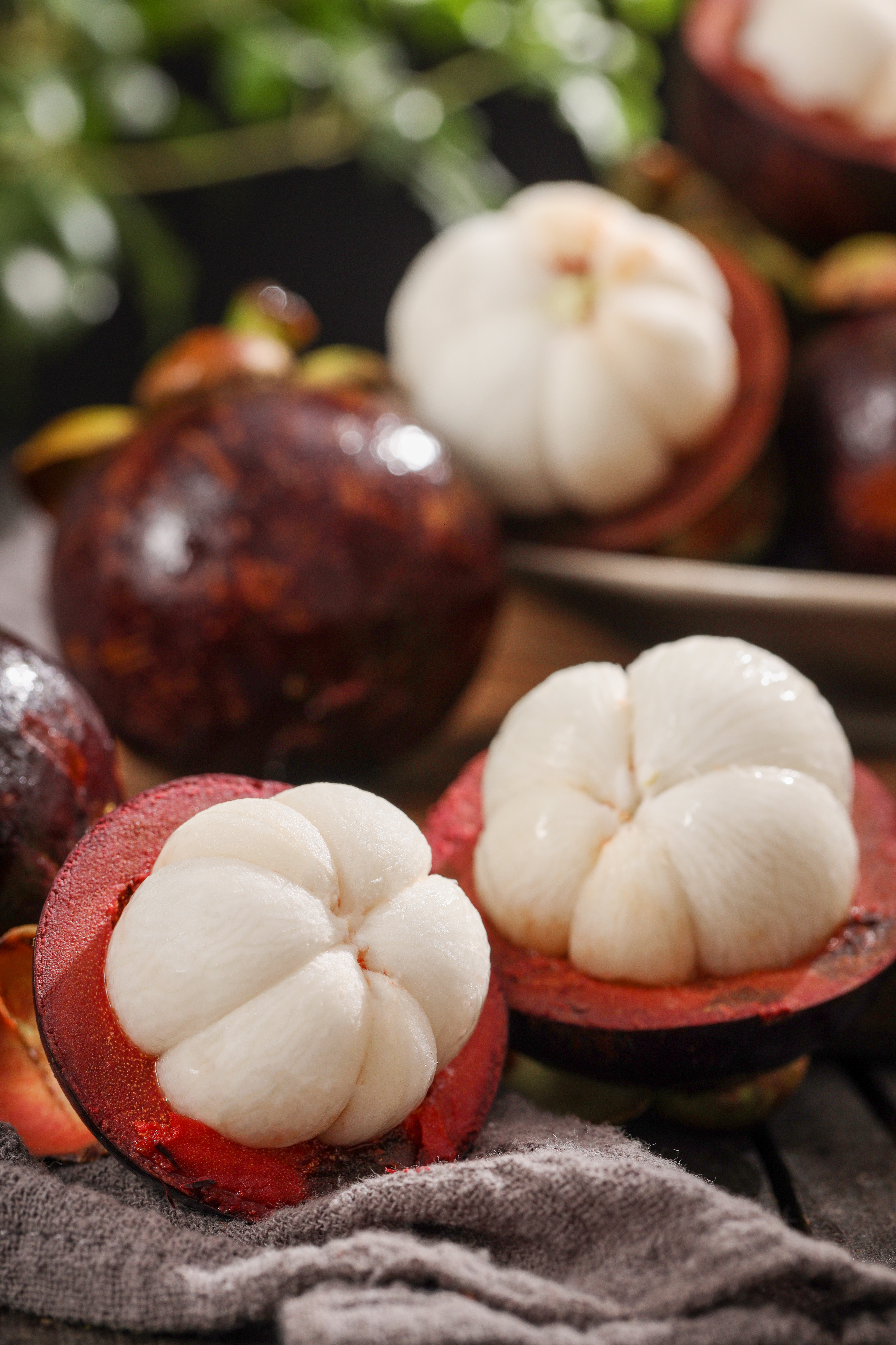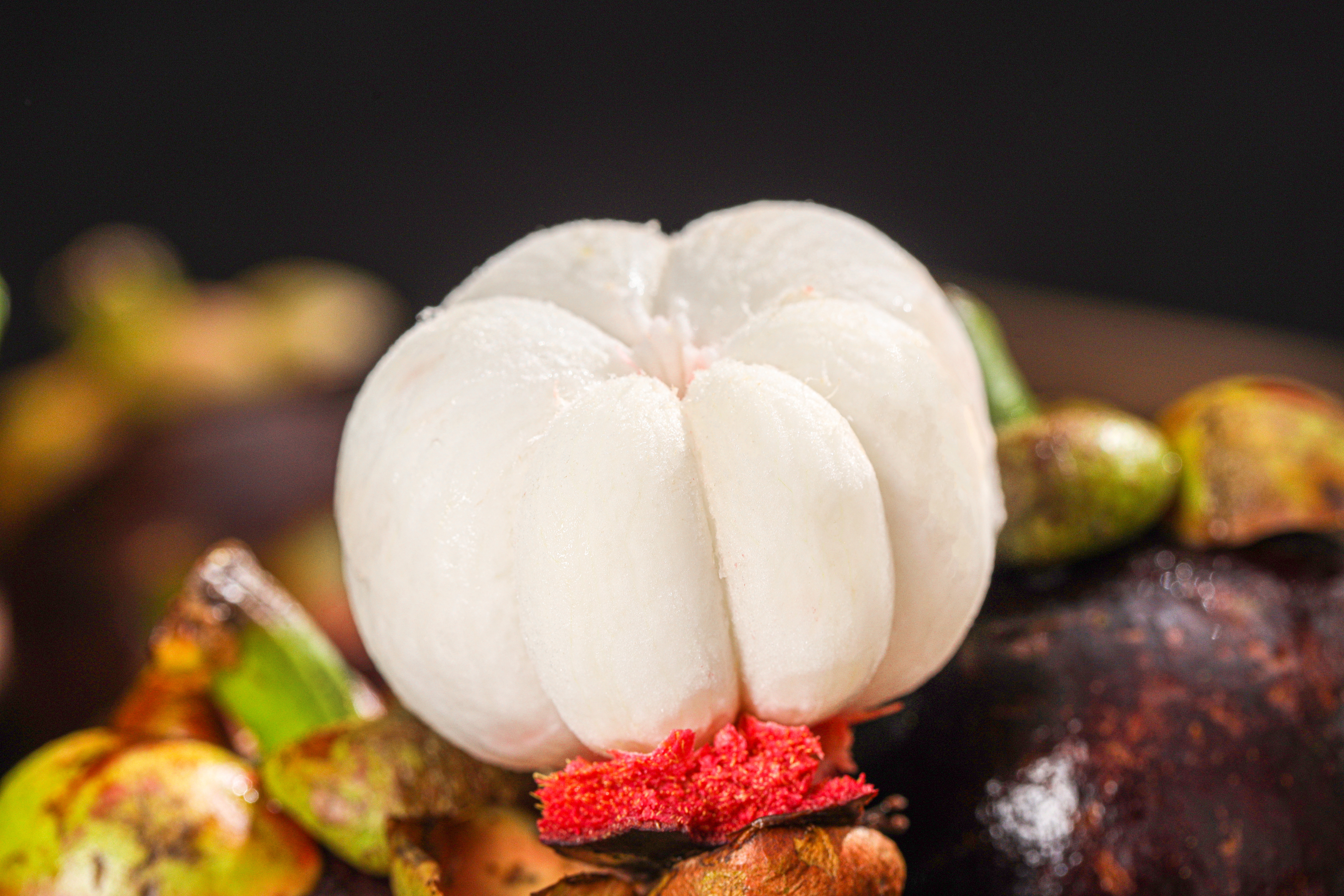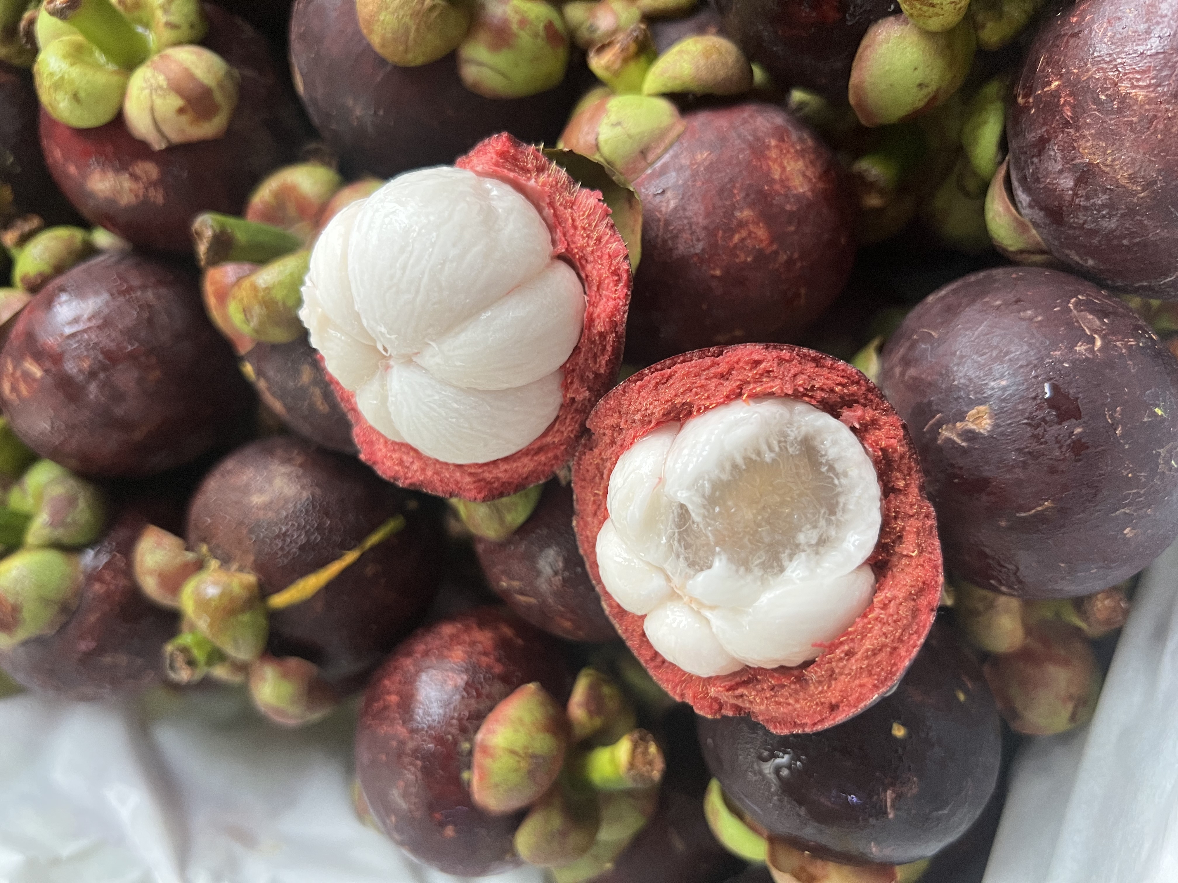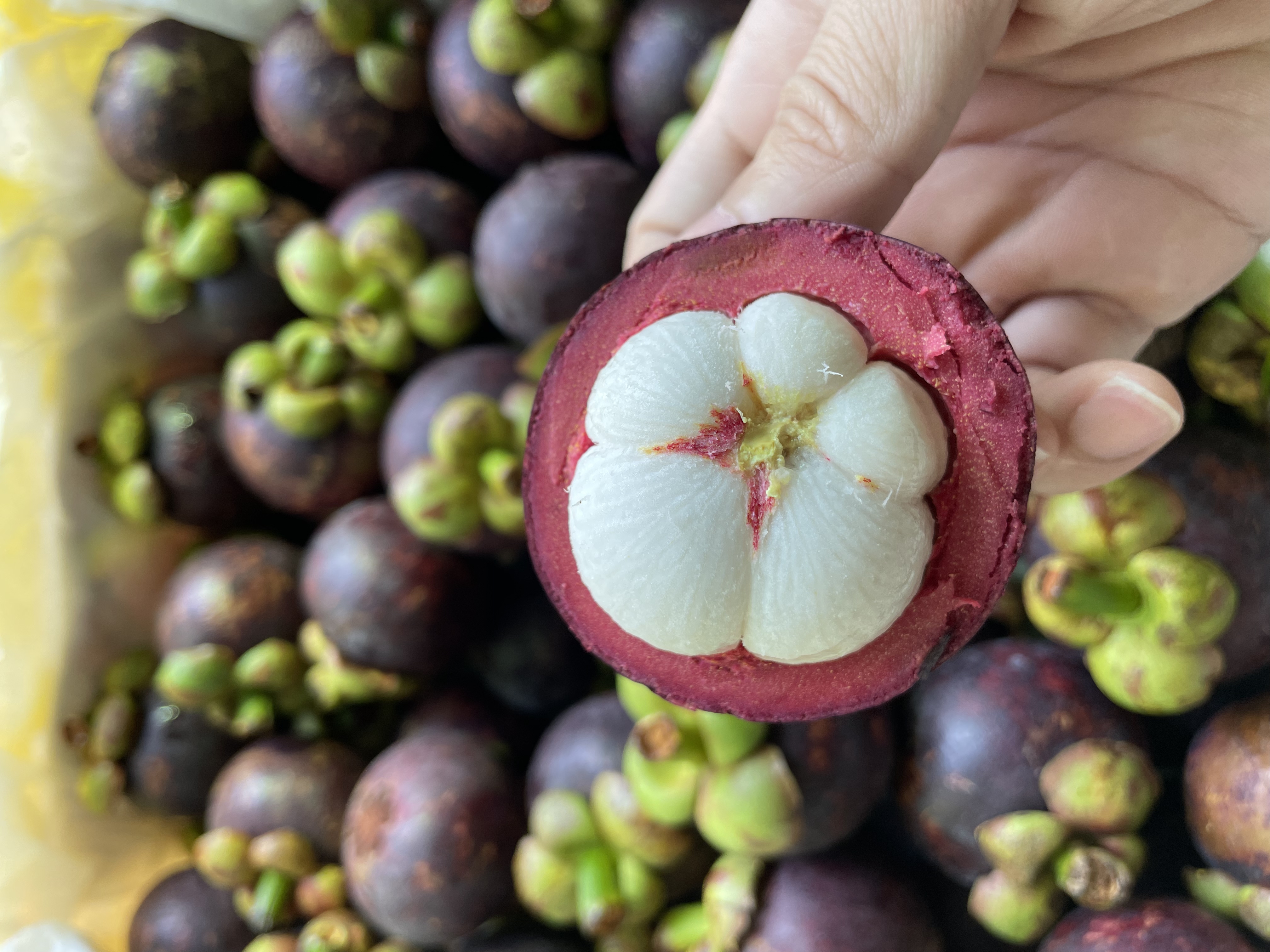 山竹屁股的花瓣有多少瓣就代表它有多少瓣肉,切开它就像一片片大白胖子,十分好看!