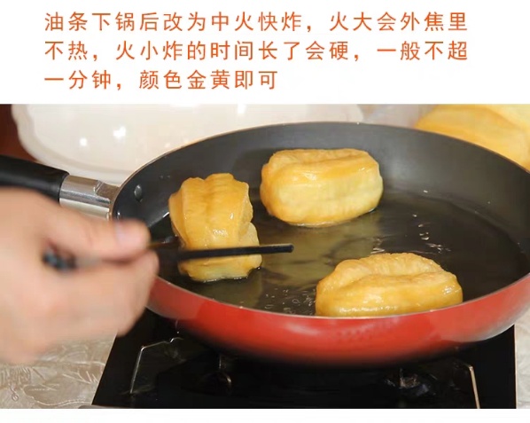 3、油条下锅后改中火快炸,火大会外焦里不热,火小炸的时间长会发硬,一般不超一分钟,颜色金黄即可。