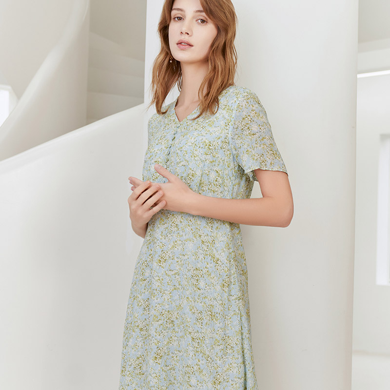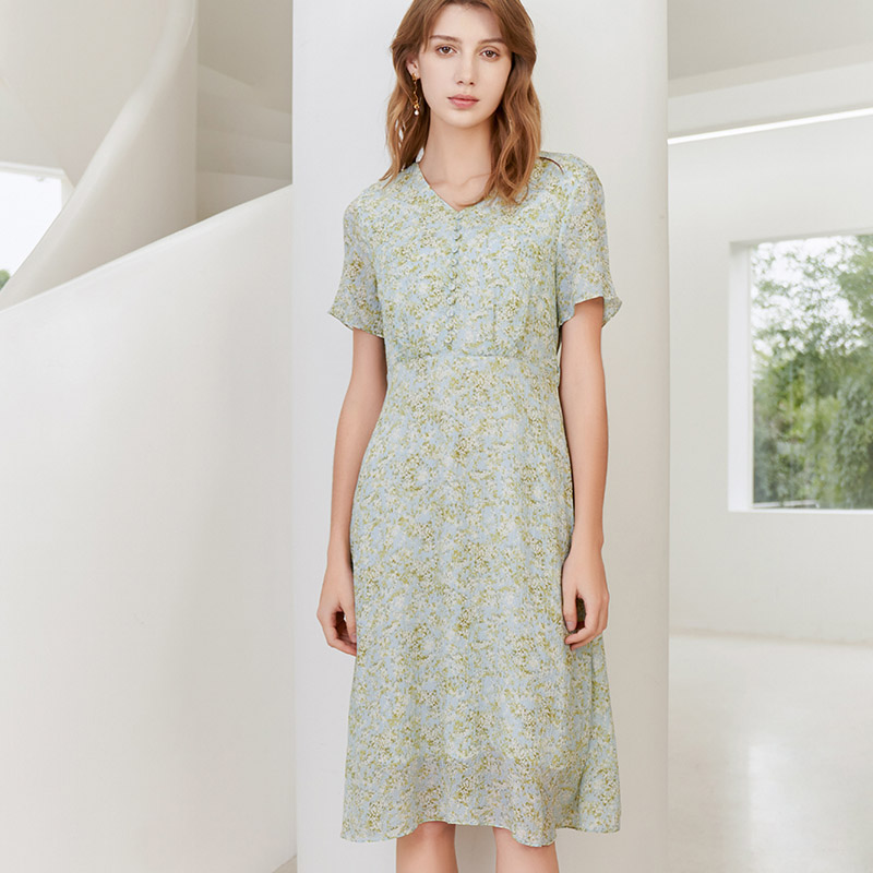 【桑蚕丝印花连衣裙】23年春夏新品女士100%真丝上衣时尚短袖中长款裙子