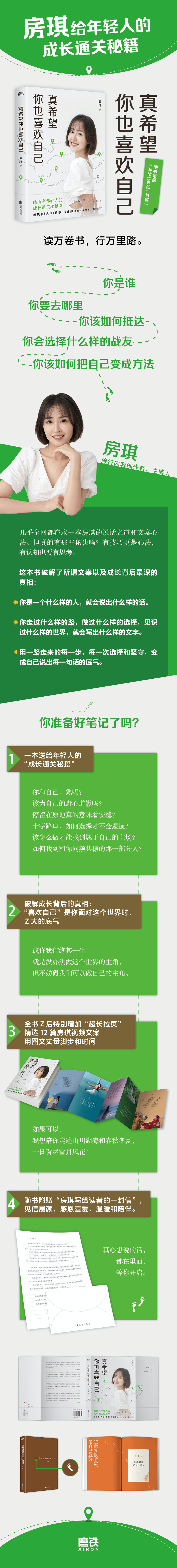 1、杨天真、大冰、鲁豫、张含韵诚意作序“房琪的这本书与其说是讲成长,不如说是讲生长。若你真认为自己正躺在白日不到处已经决定放弃发芽,那这本“生长路书”,应该翻阅一下。”2、一本送给所有年轻人的“成长通关秘籍”你和自己,熟吗?该为自己的野心道歉吗?停留在原地真的意味着安稳?十字路口,如何选择才不会遗憾?该怎么做才能找到属于自己的主场?如何找到和你同频共振的那一部分人?3、破解成长背后的底层逻辑:“喜欢自己”是你面对这个世界时,最大的底气? 或许我们终其一生就是没办法做这个世界的主角,但不妨碍我们可以做自己的主角。4、全书最后特别增加“超长拉页”,精选12篇房琪视频文案,用图文丈量脚步和时间。如果可以,我想陪你走遍山川湖海和春秋冬夏,一日看尽雪月风花!5、随书附赠“房琪写给读者的一封信”,见信展颜,感恩所有的喜爱、温暖和陪伴。所有真心想说的话,都在里面,等你开启。6、精致双封面设计,专色印刷,呼应“读万卷书,行万里路”的特别意向。无论是身体还是灵魂,总要有一个在路上。