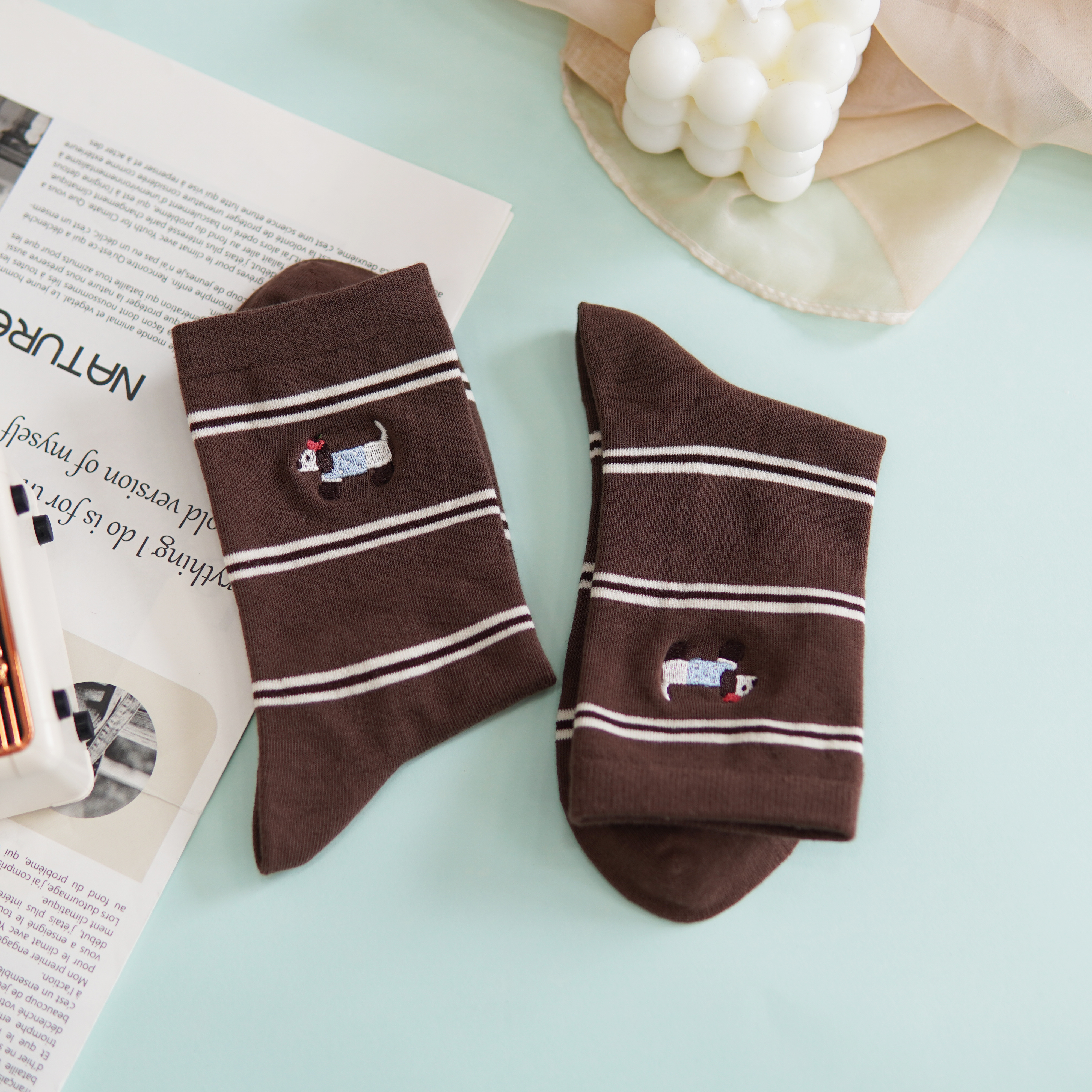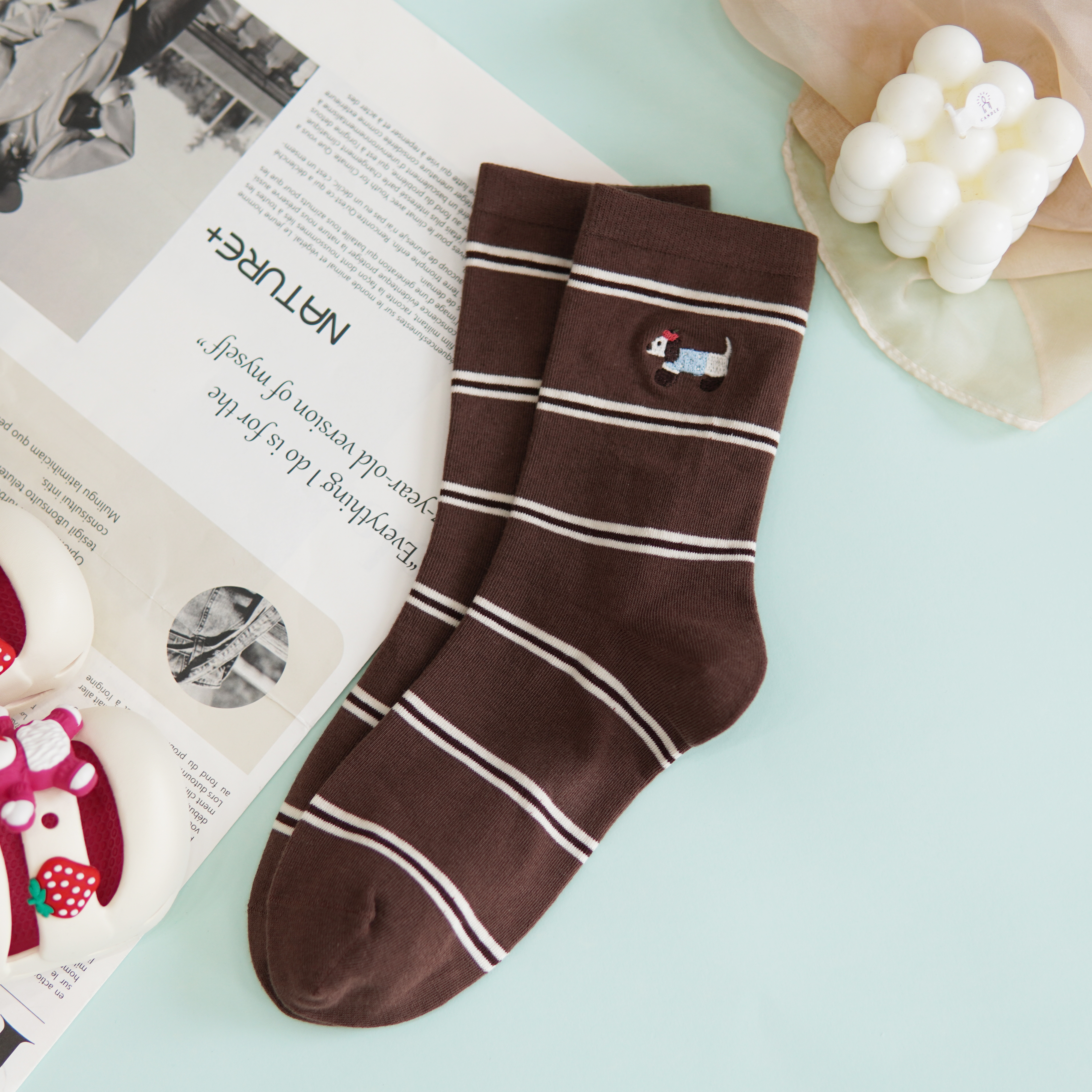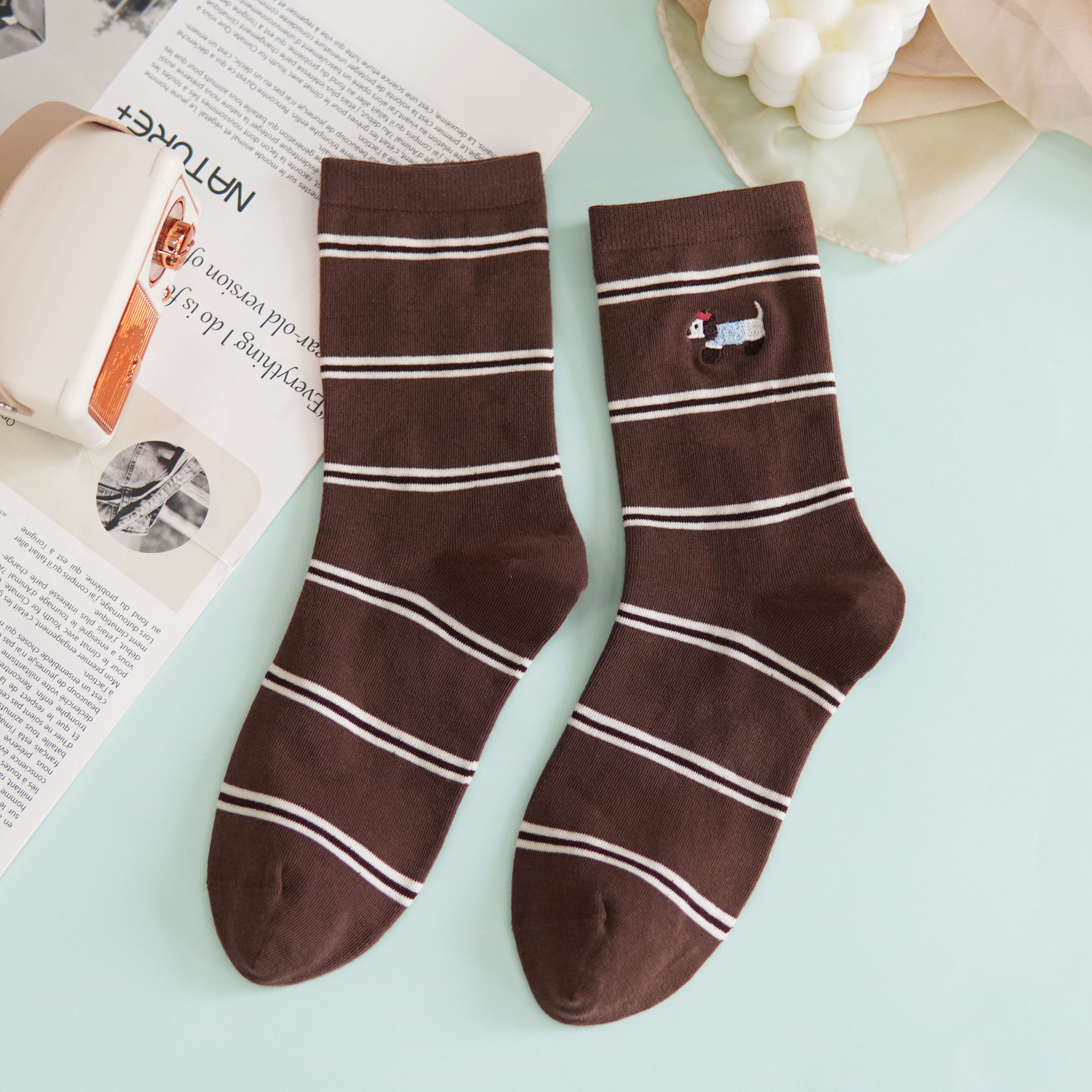 【59元3双】【1双装】女丨女士时尚咖条中长筒袜子时尚棉袜刺绣狗狗可爱女袜【2522509】