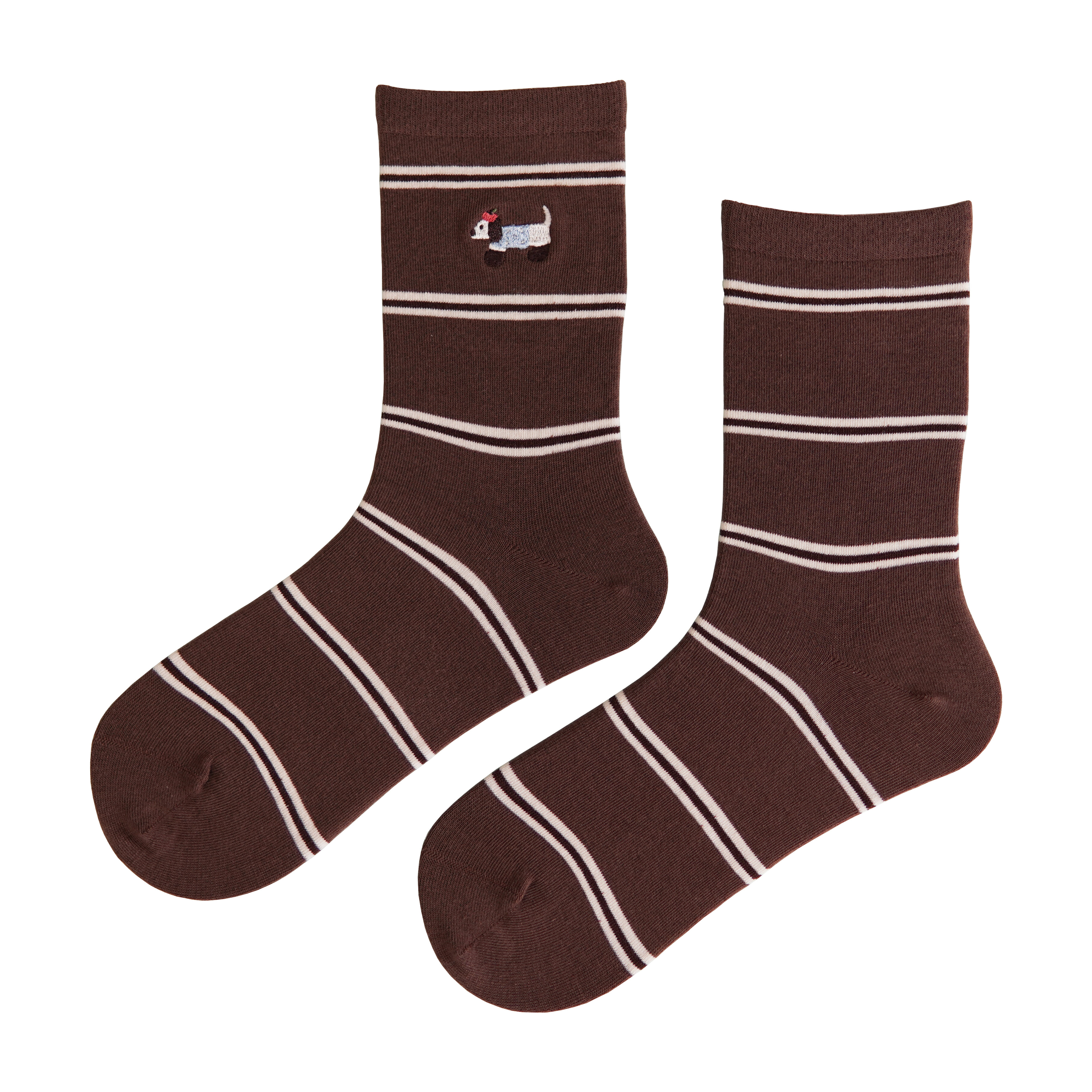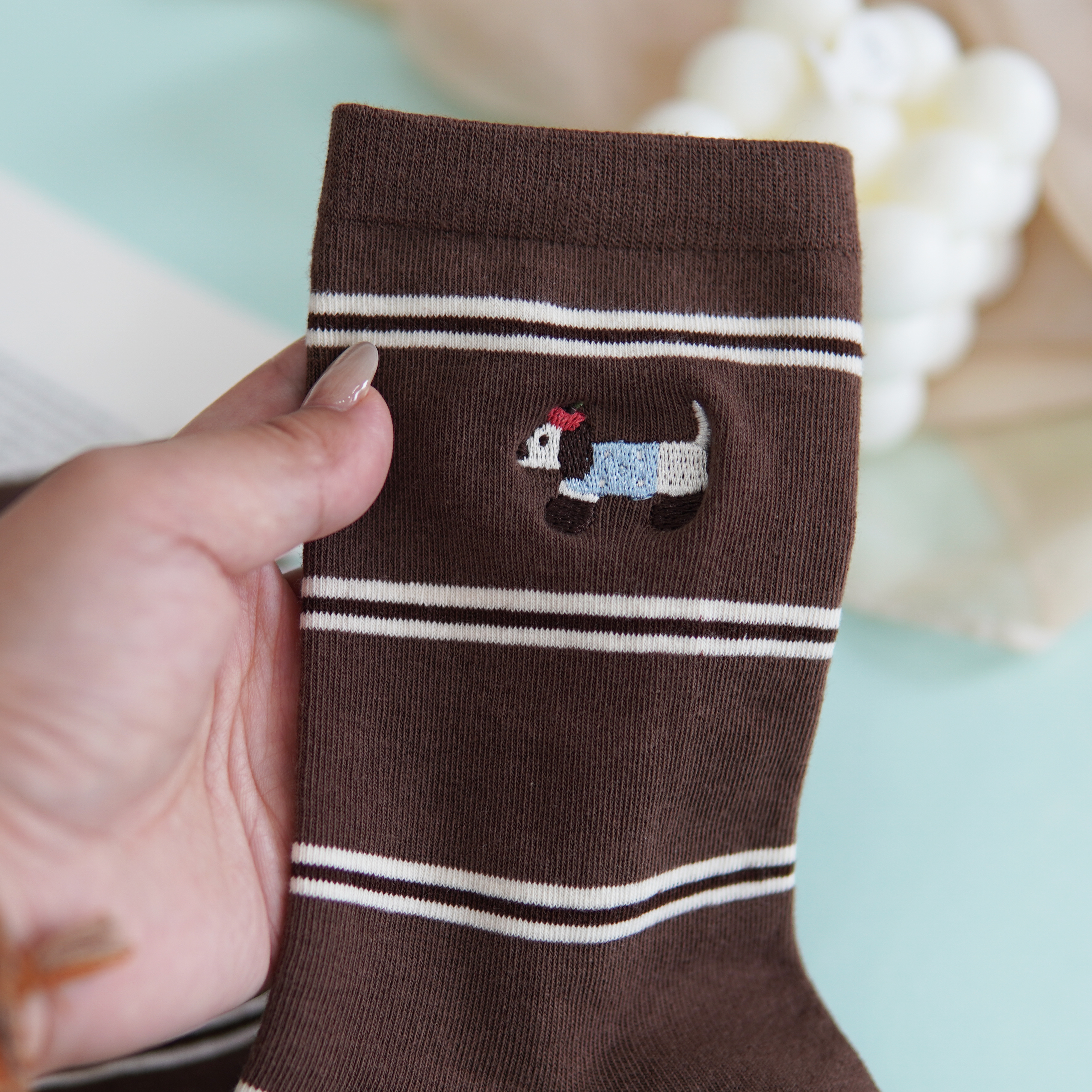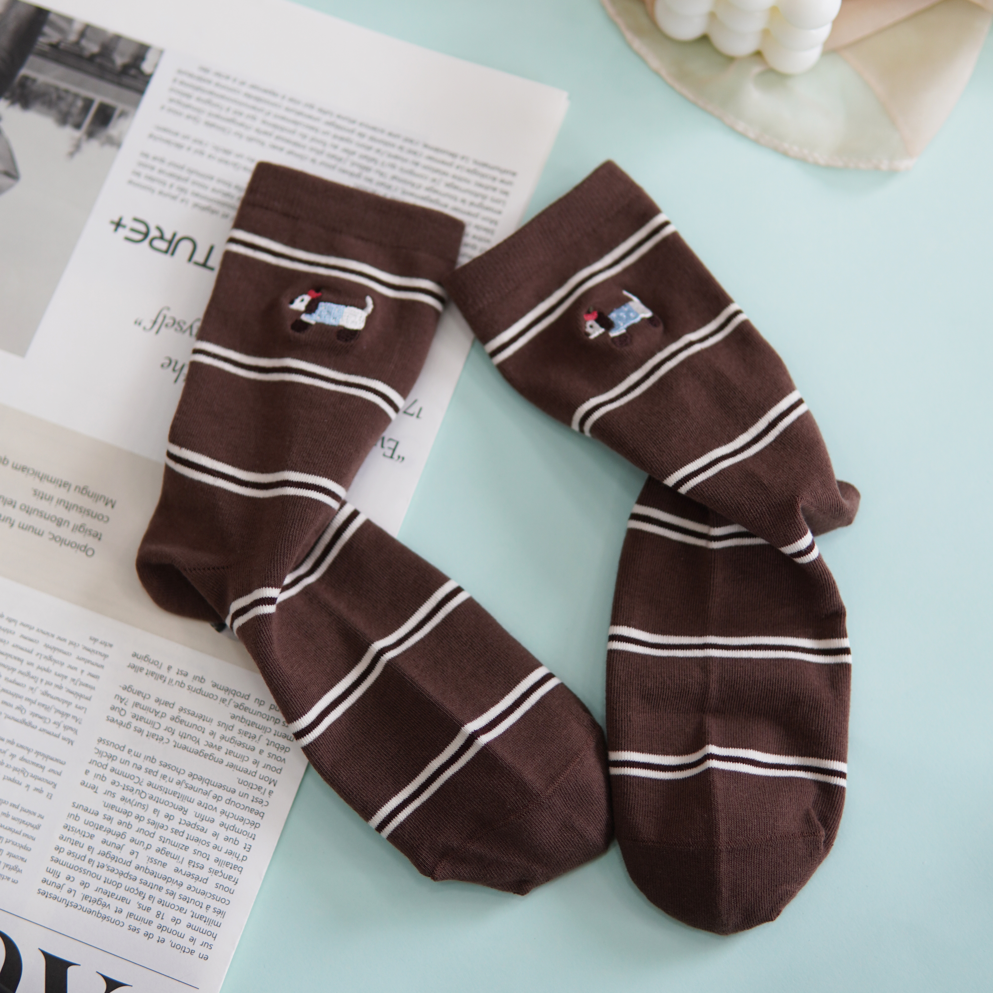 【59元3双】【1双装】女丨女士时尚咖条中长筒袜子时尚棉袜刺绣狗狗可爱女袜【2522509】