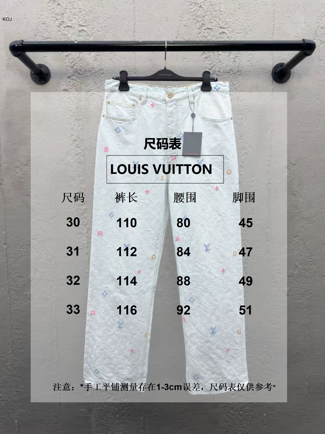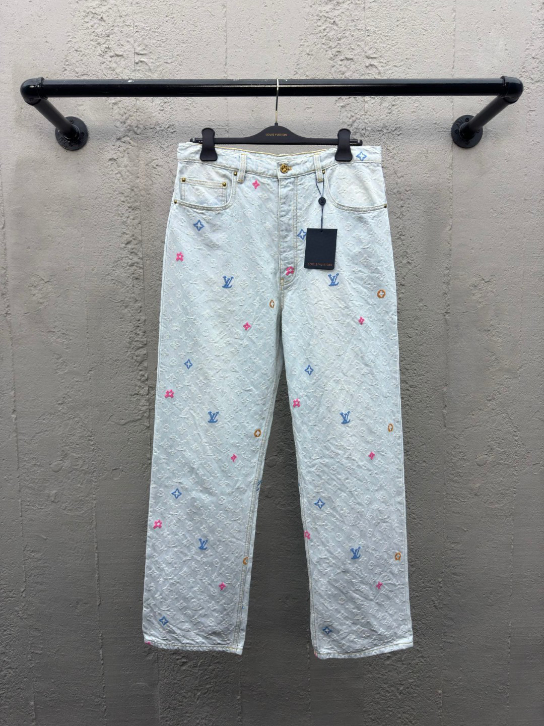 工艺说明:糖果色图案 定制YB斜纹全棉提花牛仔材质 质感十足水洗做旧复古浅灰蓝 整体饰以老花图案装饰 简约高级 口袋皮革章仔呼应腰头处直筒常规长裤剪裁 呈现随意的洋气风格