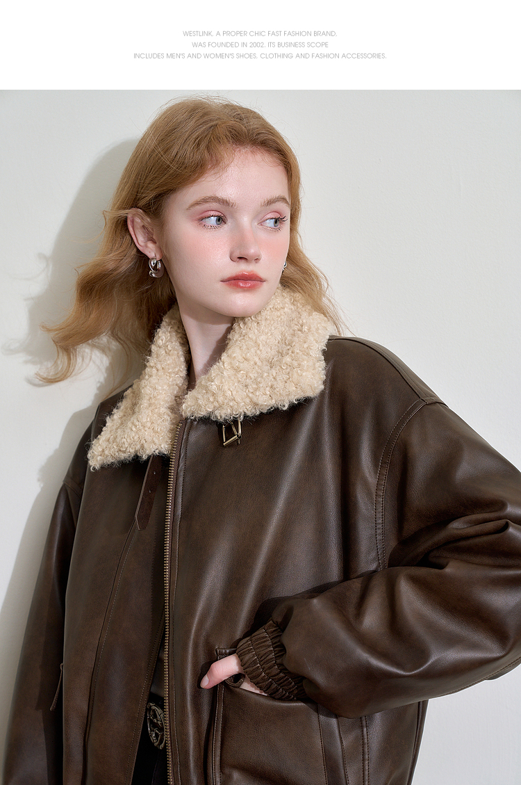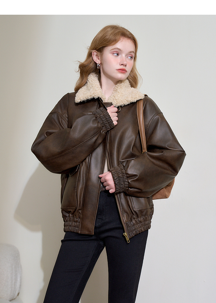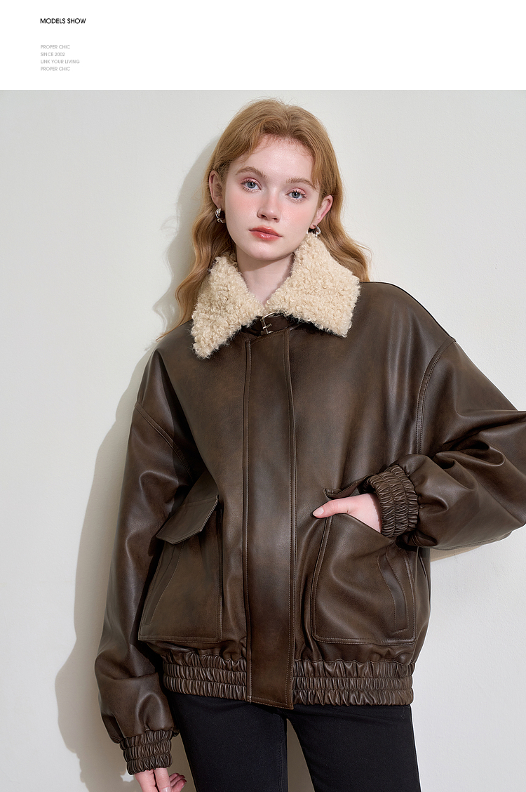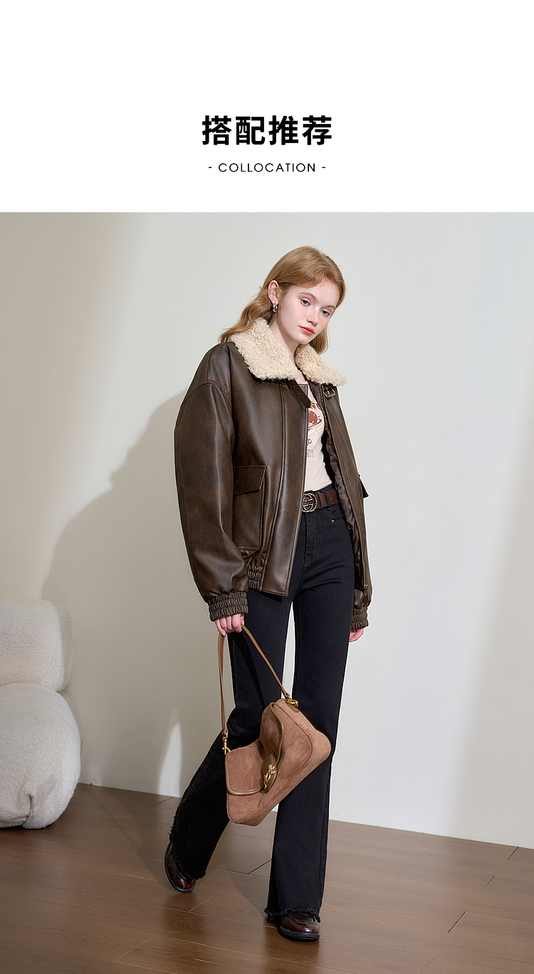 西遇皮衣加绒短外套女冬季新款翻领拼接皮毛一体加厚夹克D0044082