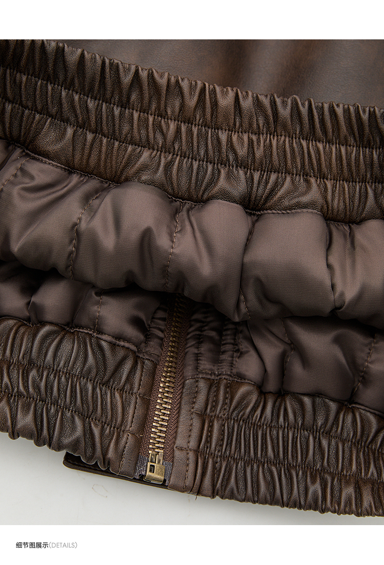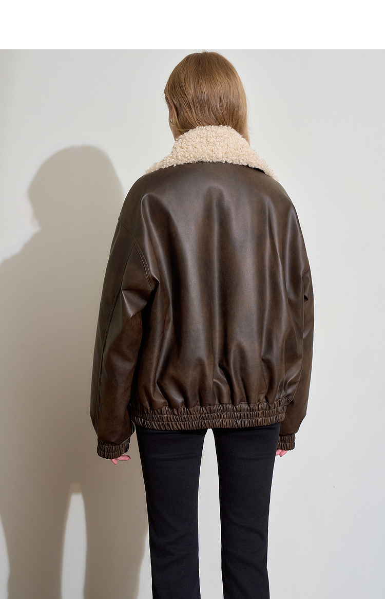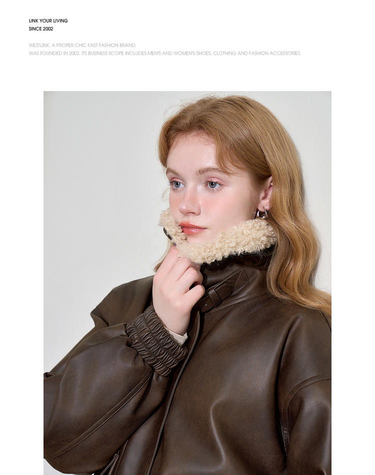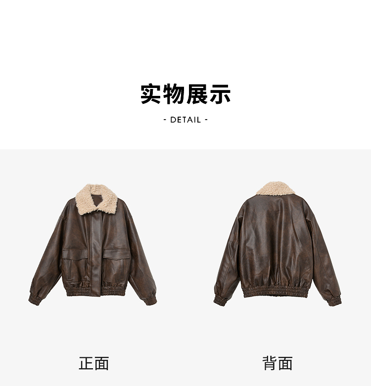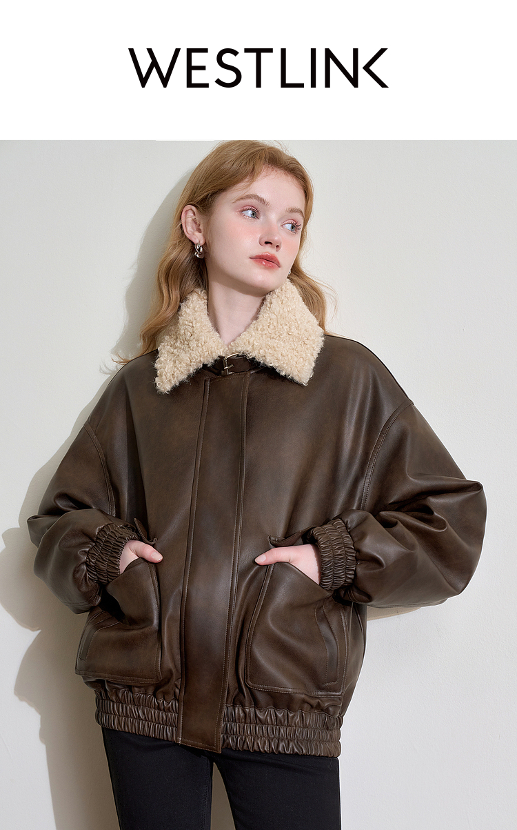 西遇皮衣加绒短外套女冬季新款翻领拼接皮毛一体加厚夹克D0044082