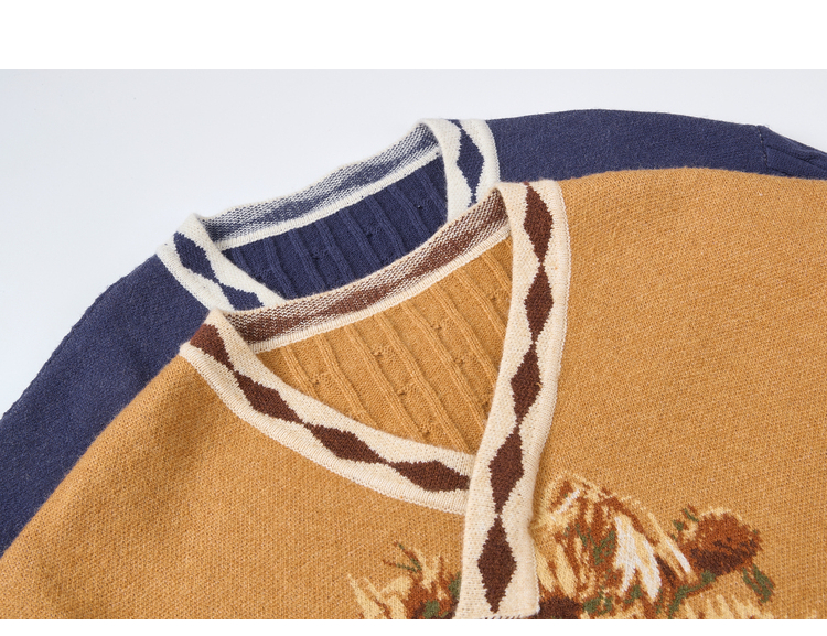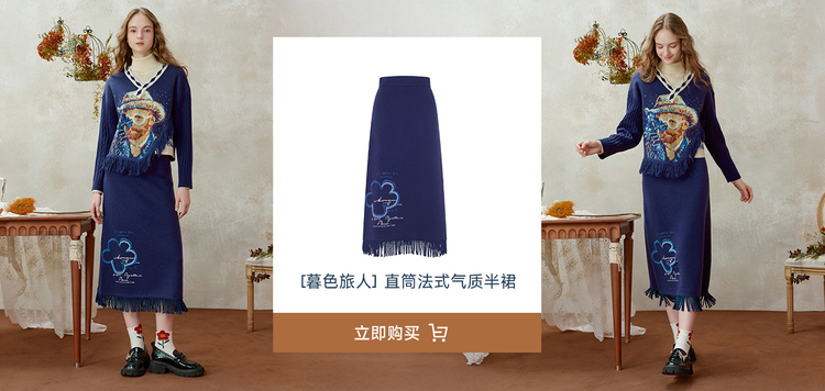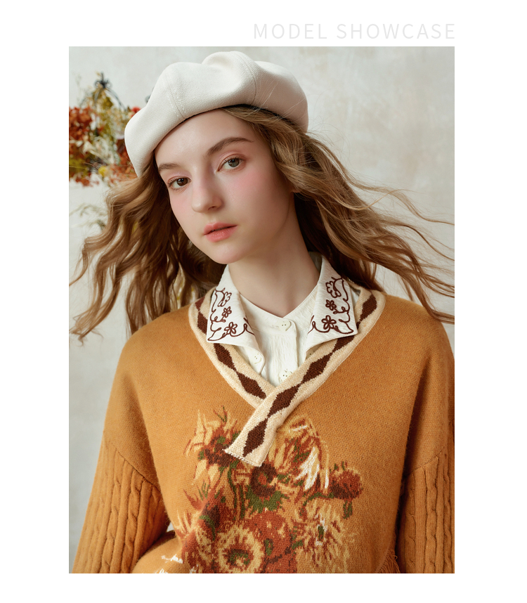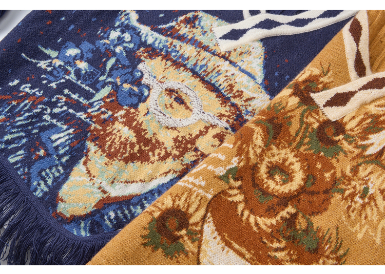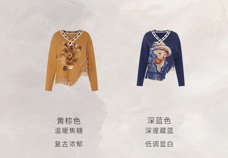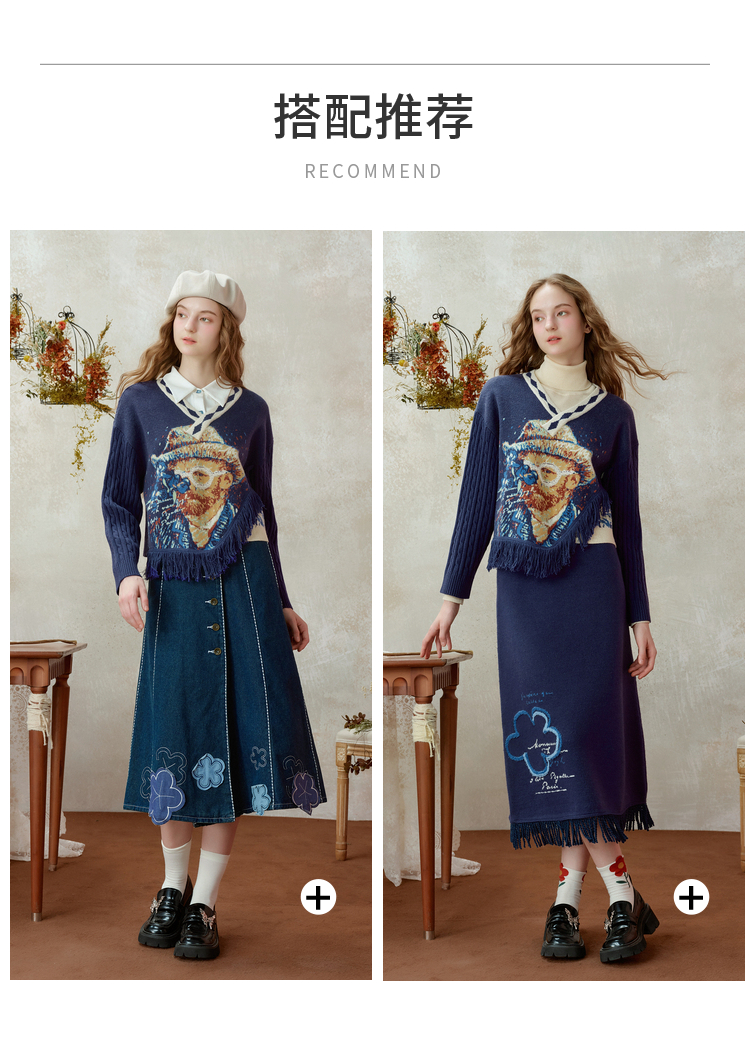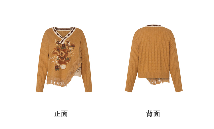 两三事梵高文艺光年影纪2025冬新款油画图案流苏不对称下摆毛衣女