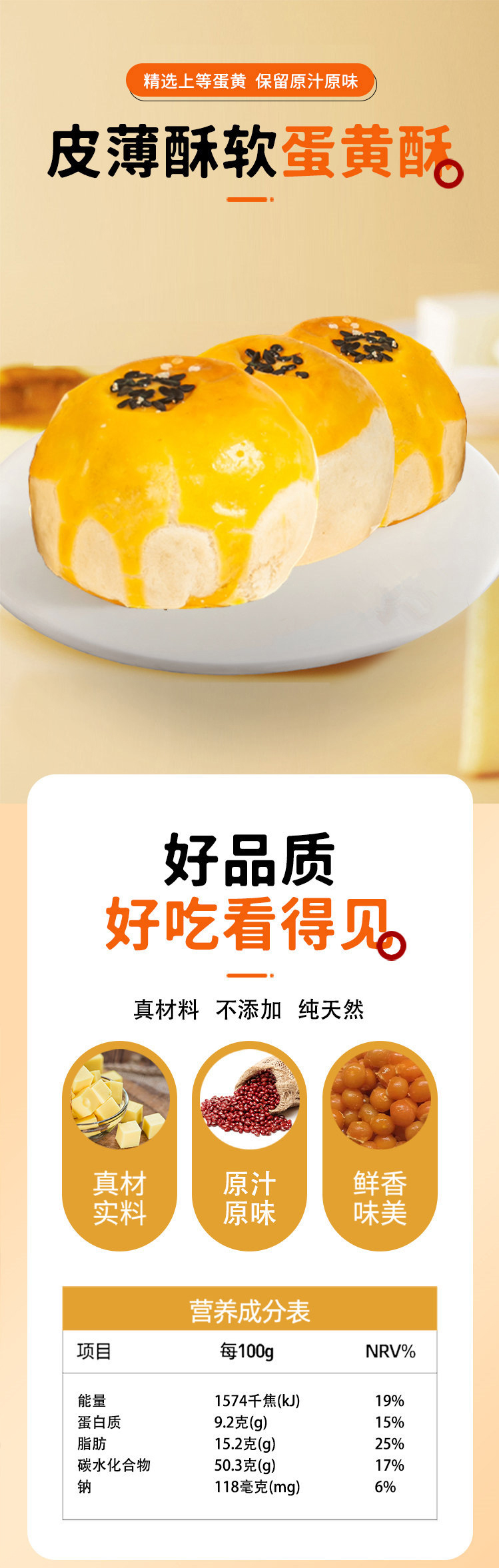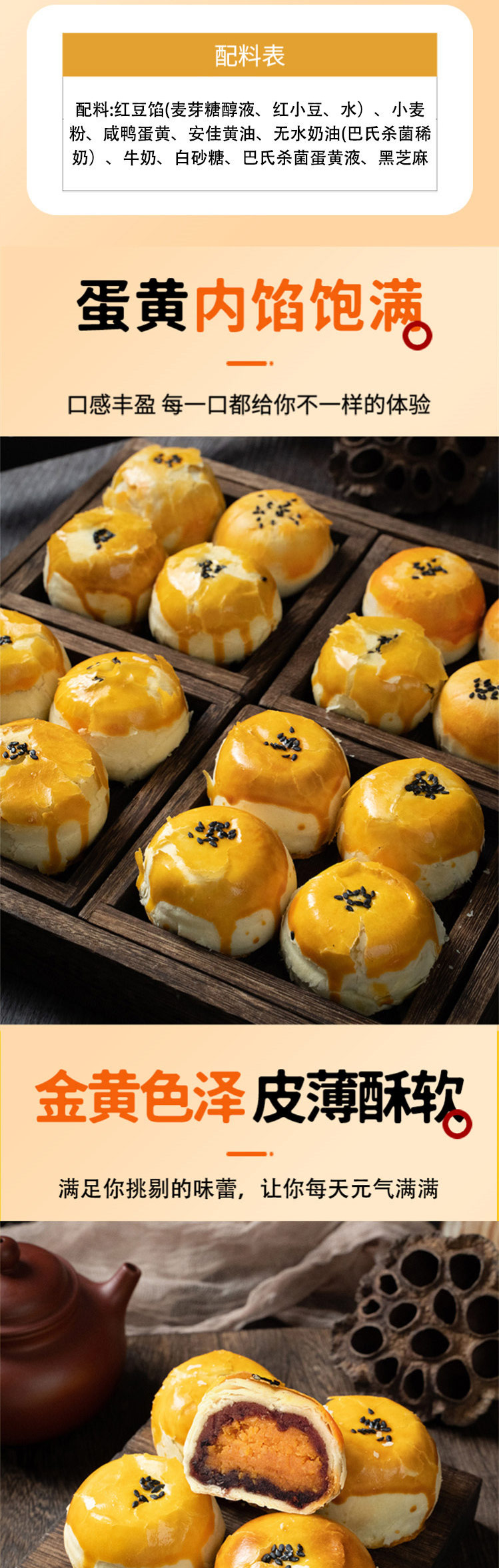 原味蛋黄酥配料:红豆馅(麦芽糖醇液、红小豆、水)、小麦粉、咸蛋黄、安佳黄油、无水奶油(巴氏杀菌稀奶)、白砂糖、巴氏杀菌蛋黄液、黑芝麻