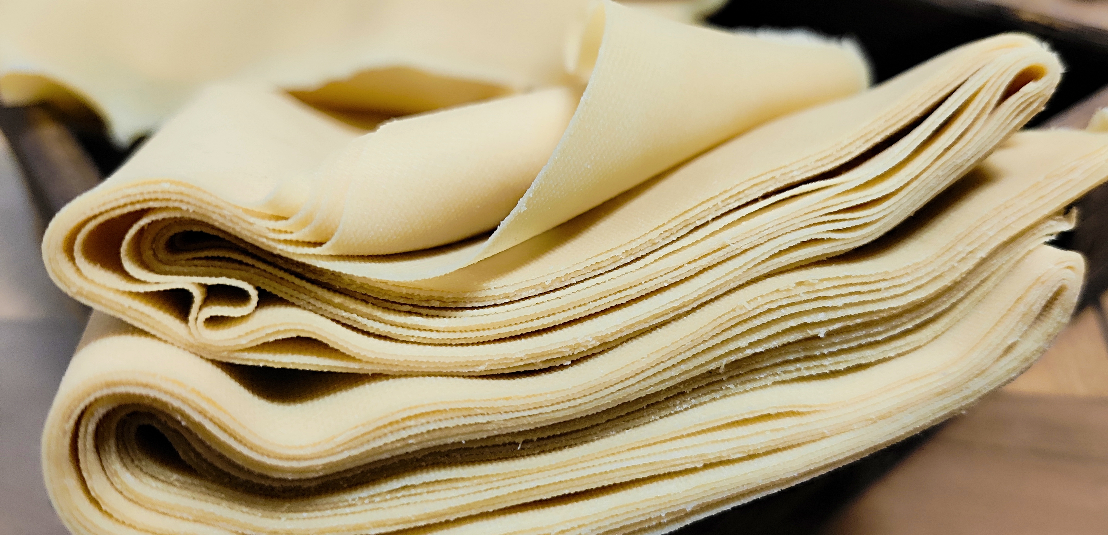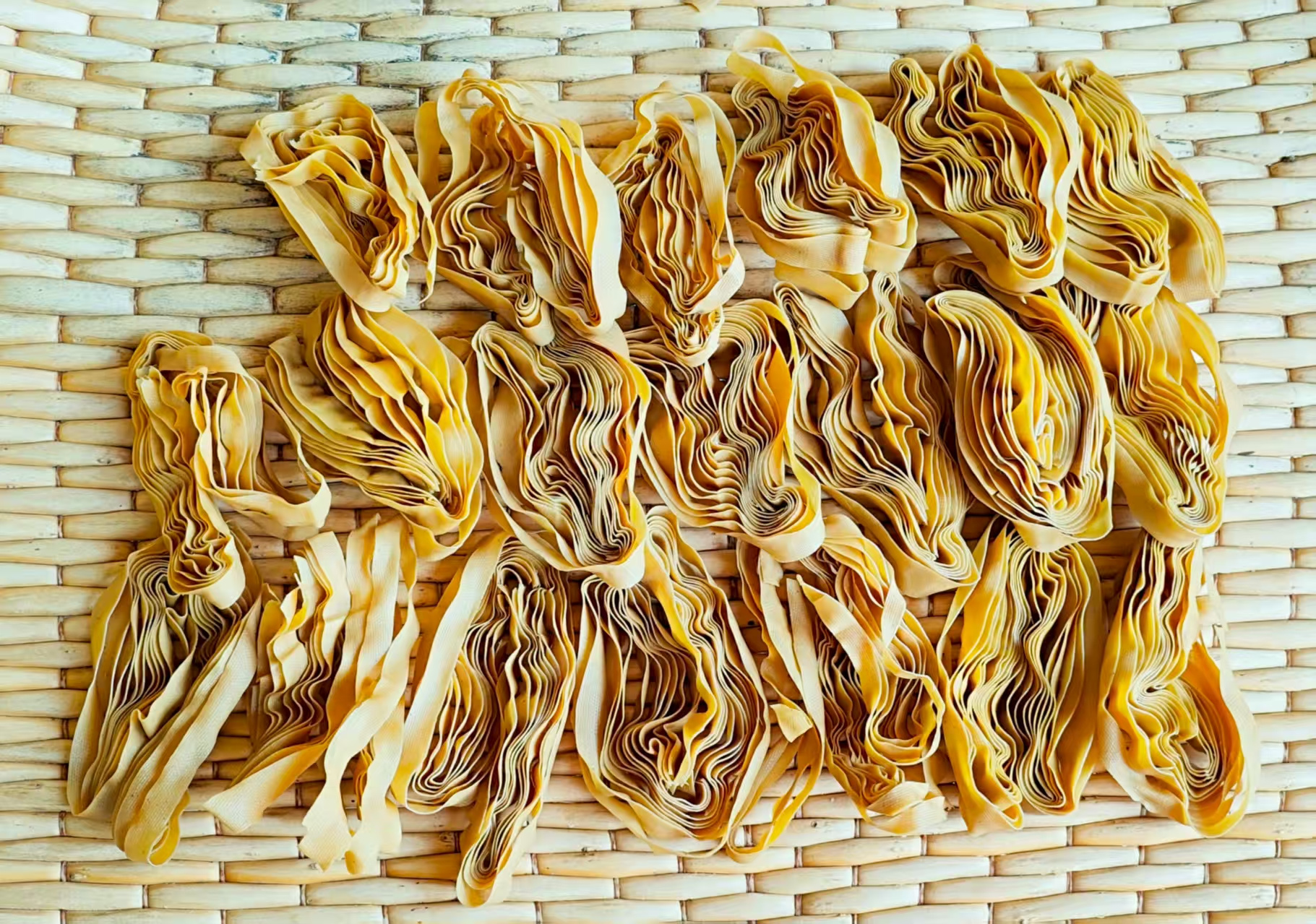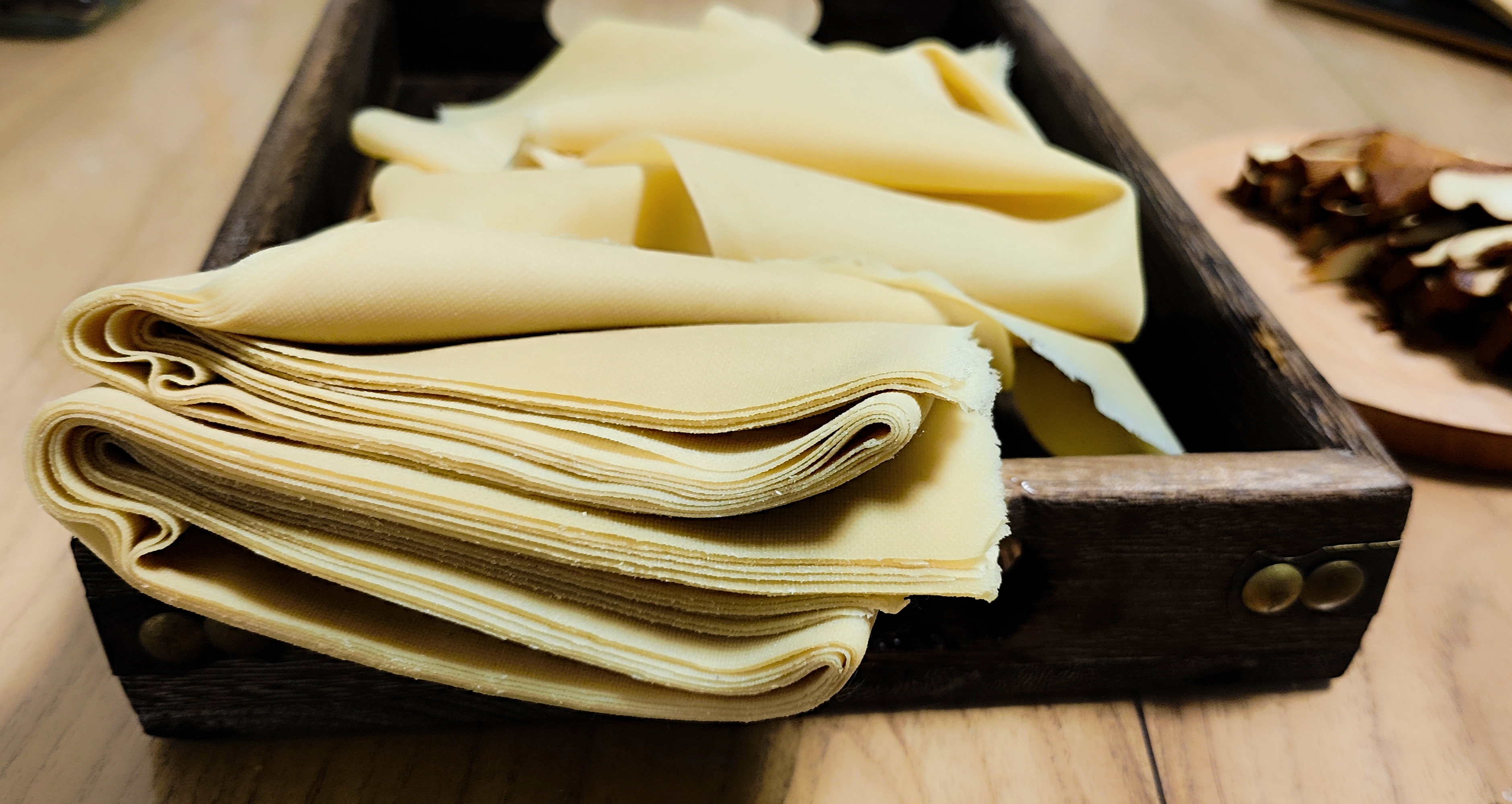 晒干后的卜页,卜页有了太阳的味道,豆香也更加浓郁,可直接当零食用,也可以温水泡发一下,凉拌、或炒、或煮、多了一份与湿千张别样的风味哦
