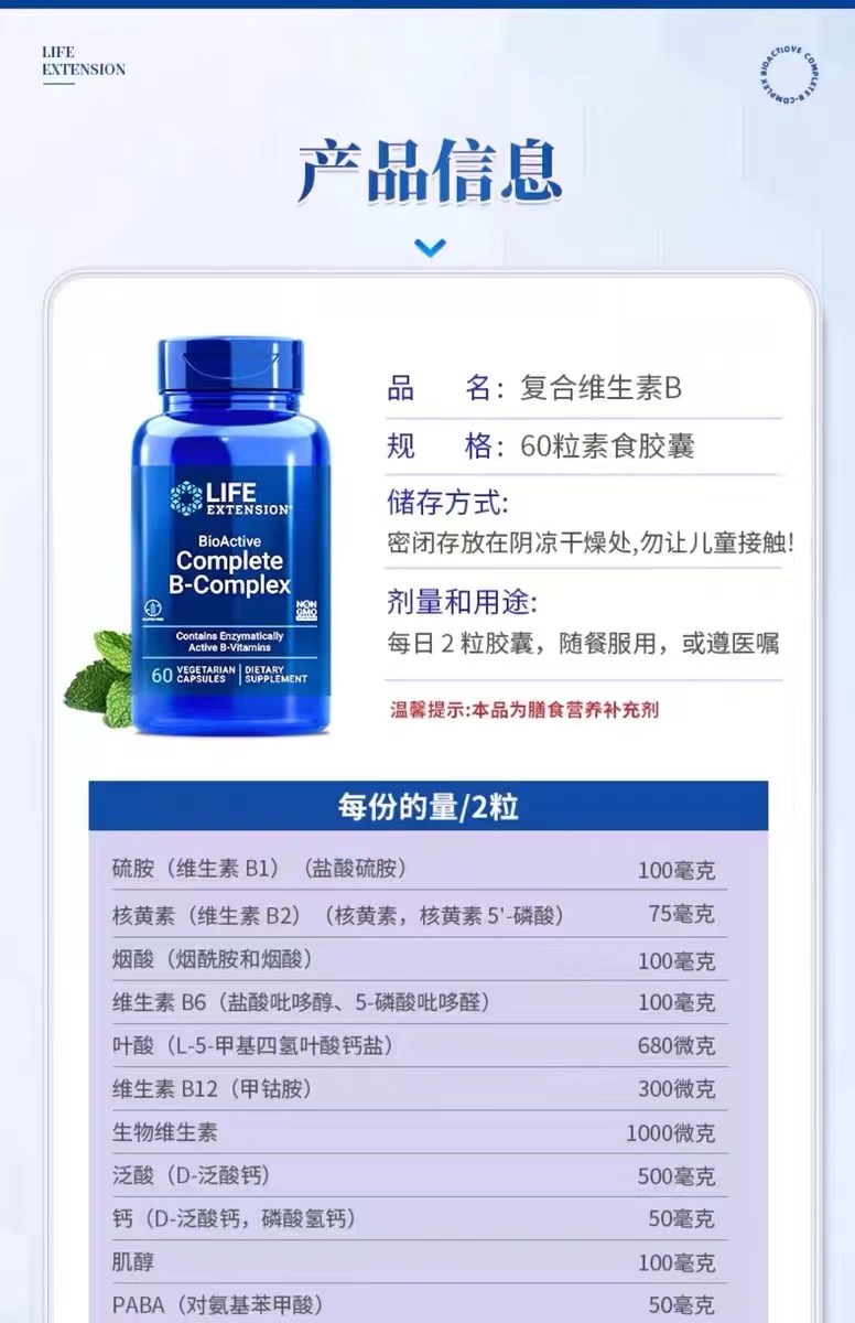 沿寿LIFE EXTENSION 复合维生素B族 60粒( BioActive Complete B-Complex)