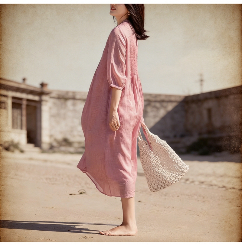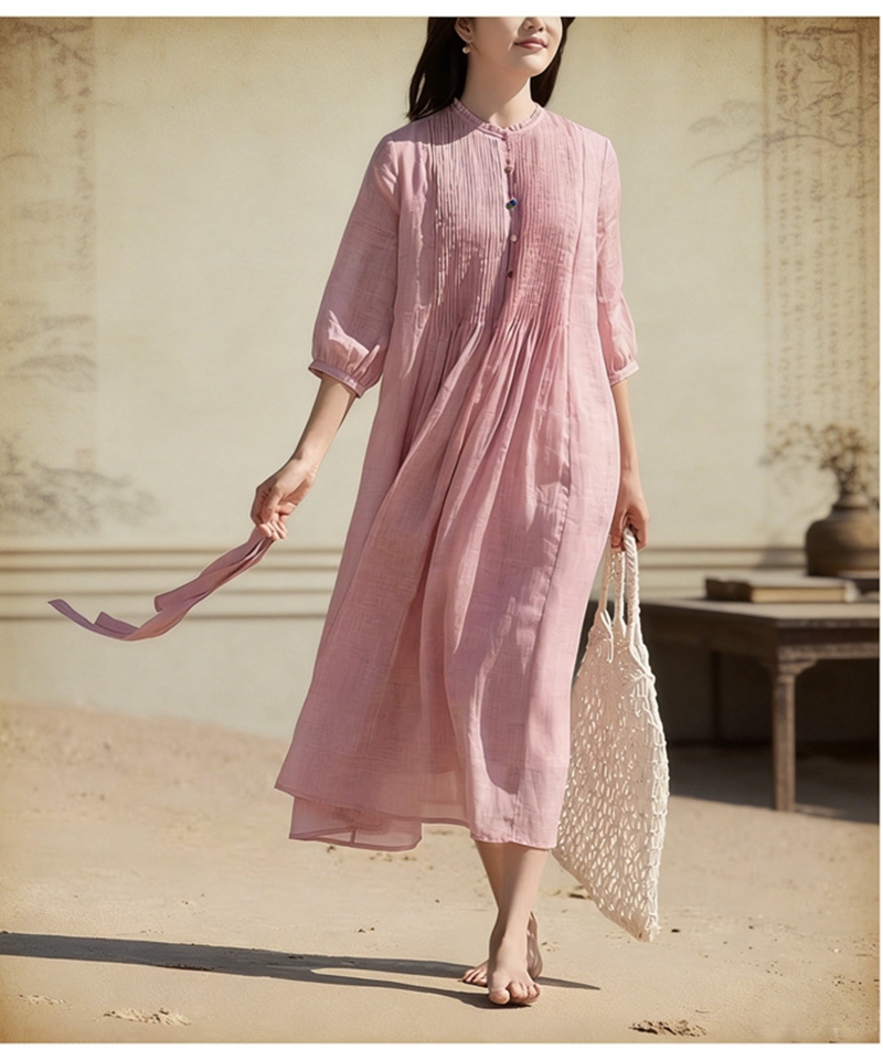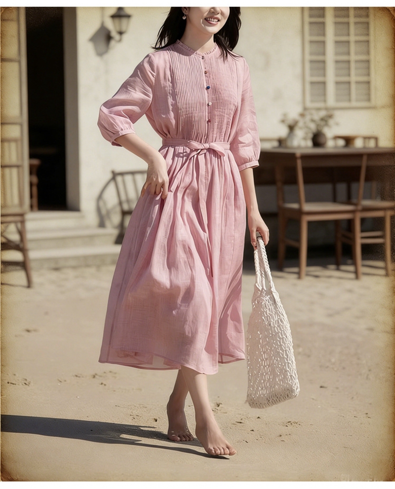 高端苎麻打条圆领七分袖单排扣系带连衣裙
