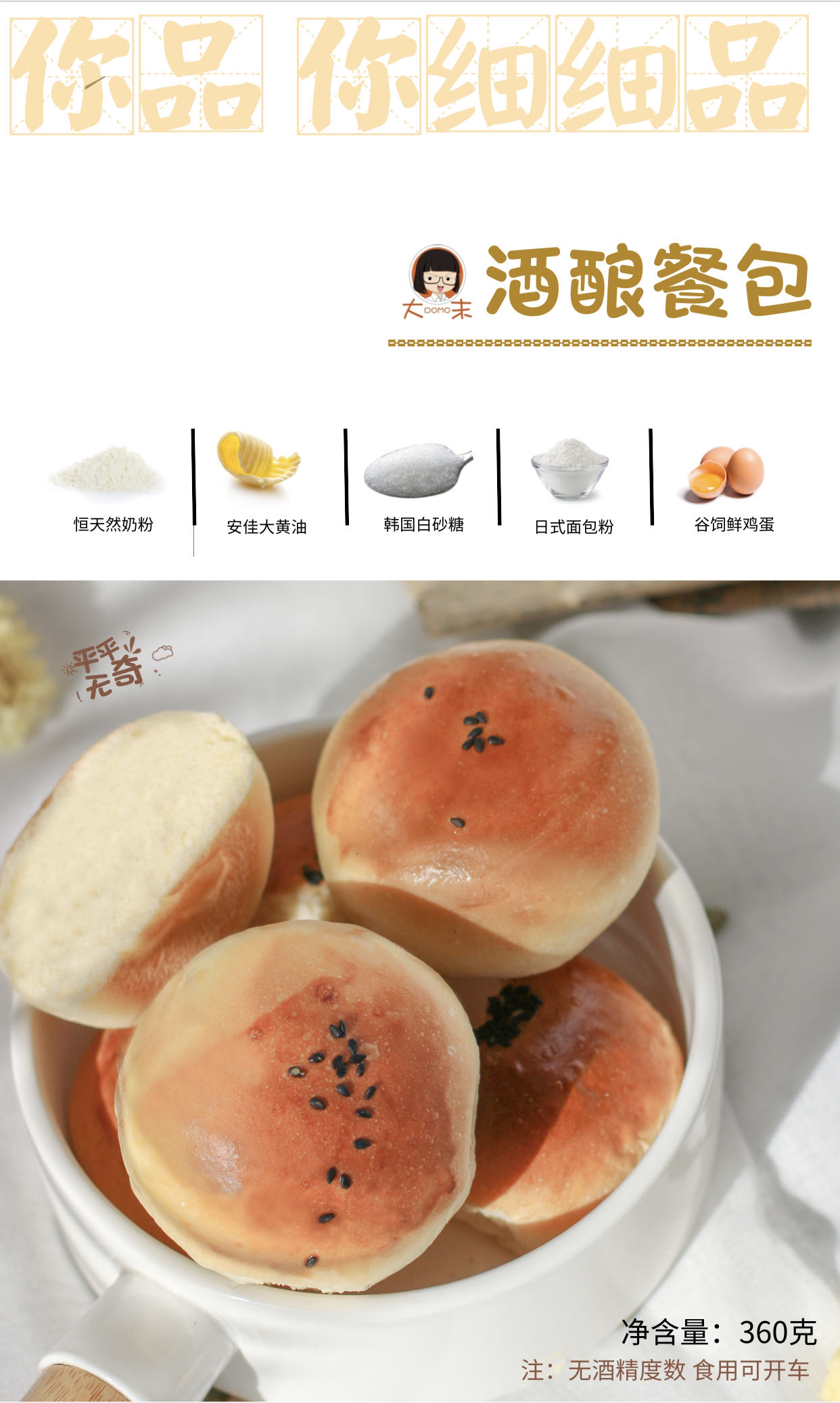 1、严选原料:日式面包粉、安佳进口黄油、新西兰恒天然奶粉、法国燕子鲜酵母,用好料,只为做出最好的味道