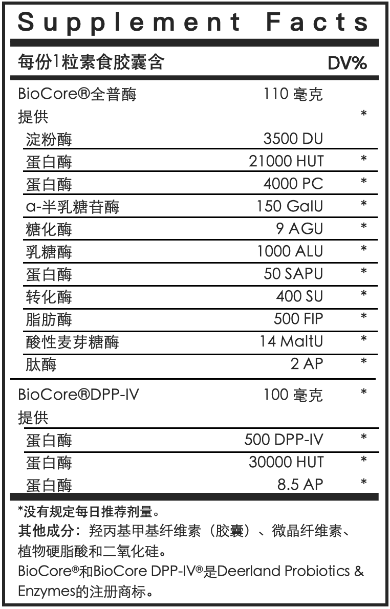 一款含有所有必要胃肠消化酶的全普酶产品,包含二肽酶IV(DPP-IV)、乳糖酶和α-半乳糖苷酶在内的全系酶,有助于蛋白质、脂肪、淀粉、乳制品和麸质的分解。配方在广泛的PH值范围内提供酶活性。