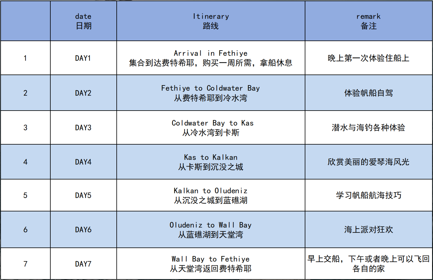 行程中我们会途经冷水湾、卡斯、沉没之城卡尔坎、蓝礁湖与天堂湾,每日都能邂逅不同的地中海风情。除了帆船驾驶,还可体验潜水、海钓、浮潜,探索古希腊水下遗迹与珊瑚礁。
