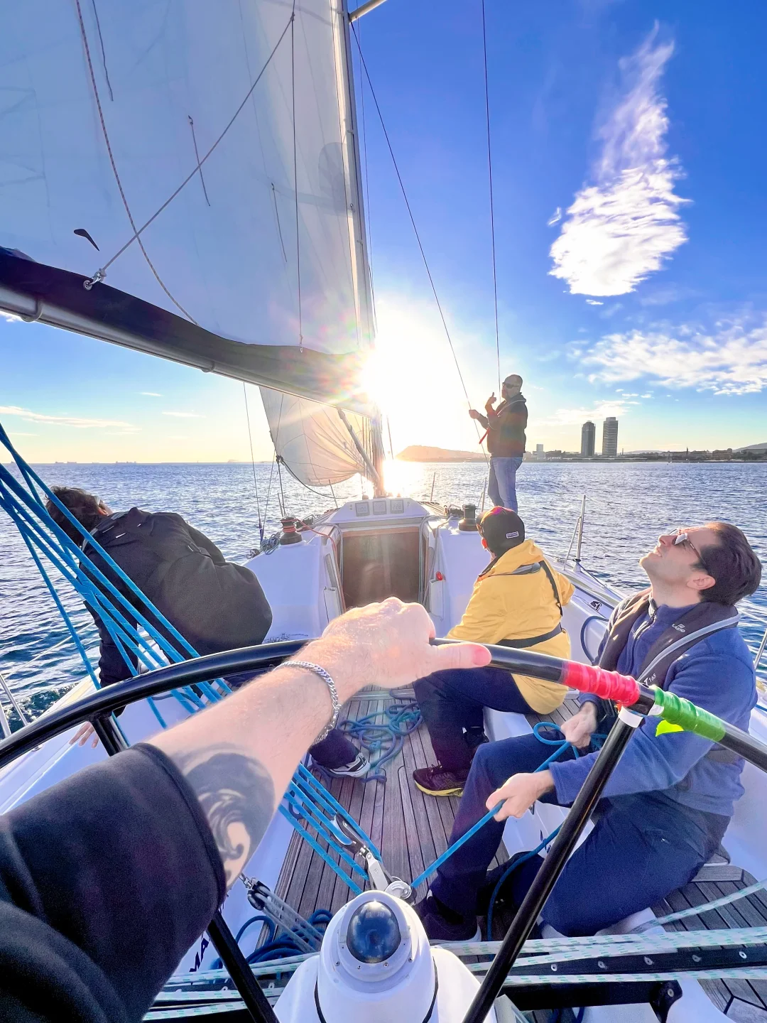 今日是航海生活的开端。学习将是全面的基础准备:熟悉帆船的每一个部件、掌握帆船专用术语。在教练指导下,你将首次作为团队的一员,实践上下船的安全规程、救生衣正确穿戴,并学习最重要的船艺开端:绳结。全天在墨西拿海峡的平静水域进行迎风、横风转向等基础操控练习,为后续航行建立肌肉记忆和信心。