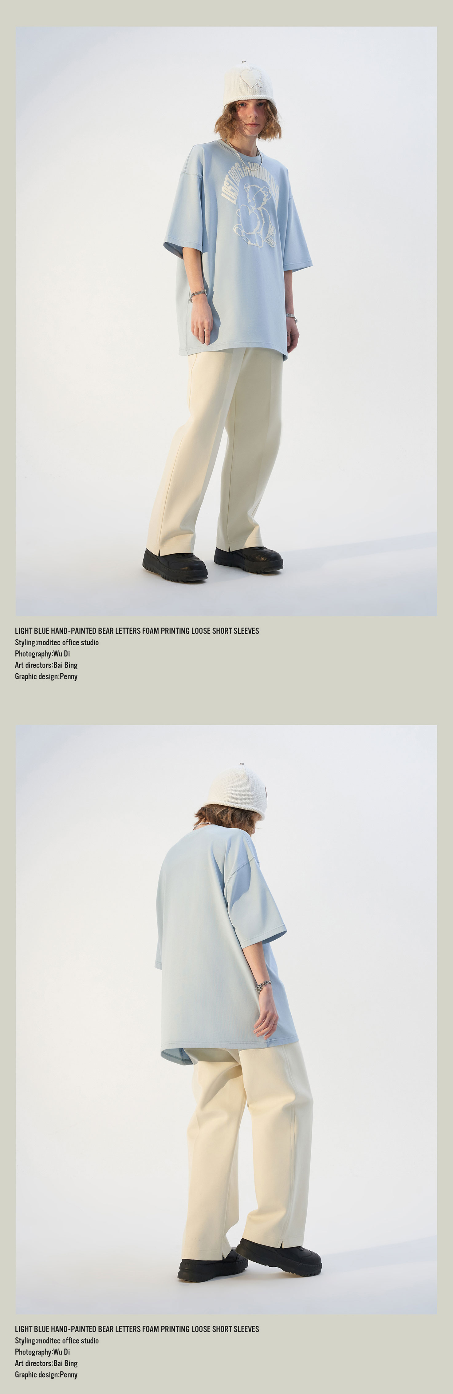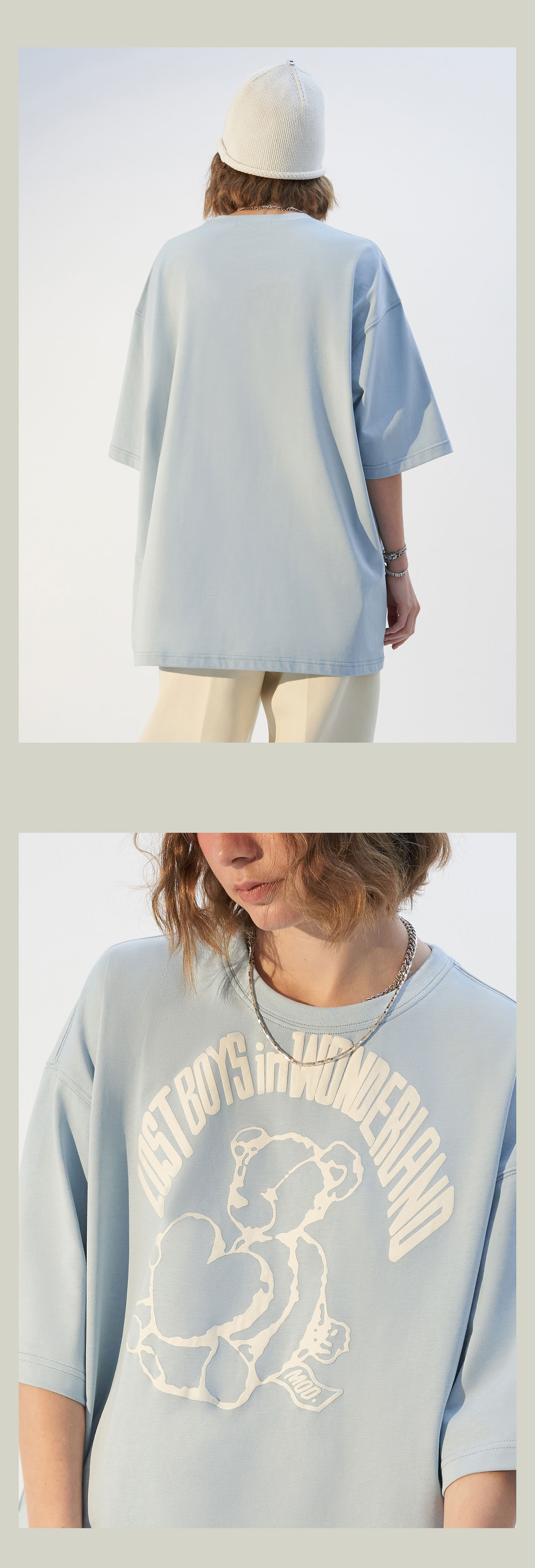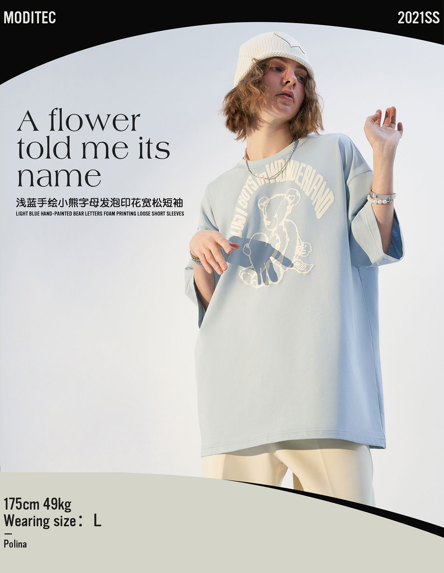 MODITEC21春夏浅蓝手绘小熊字母发泡印花宽松短袖纯棉休闲宽松T恤