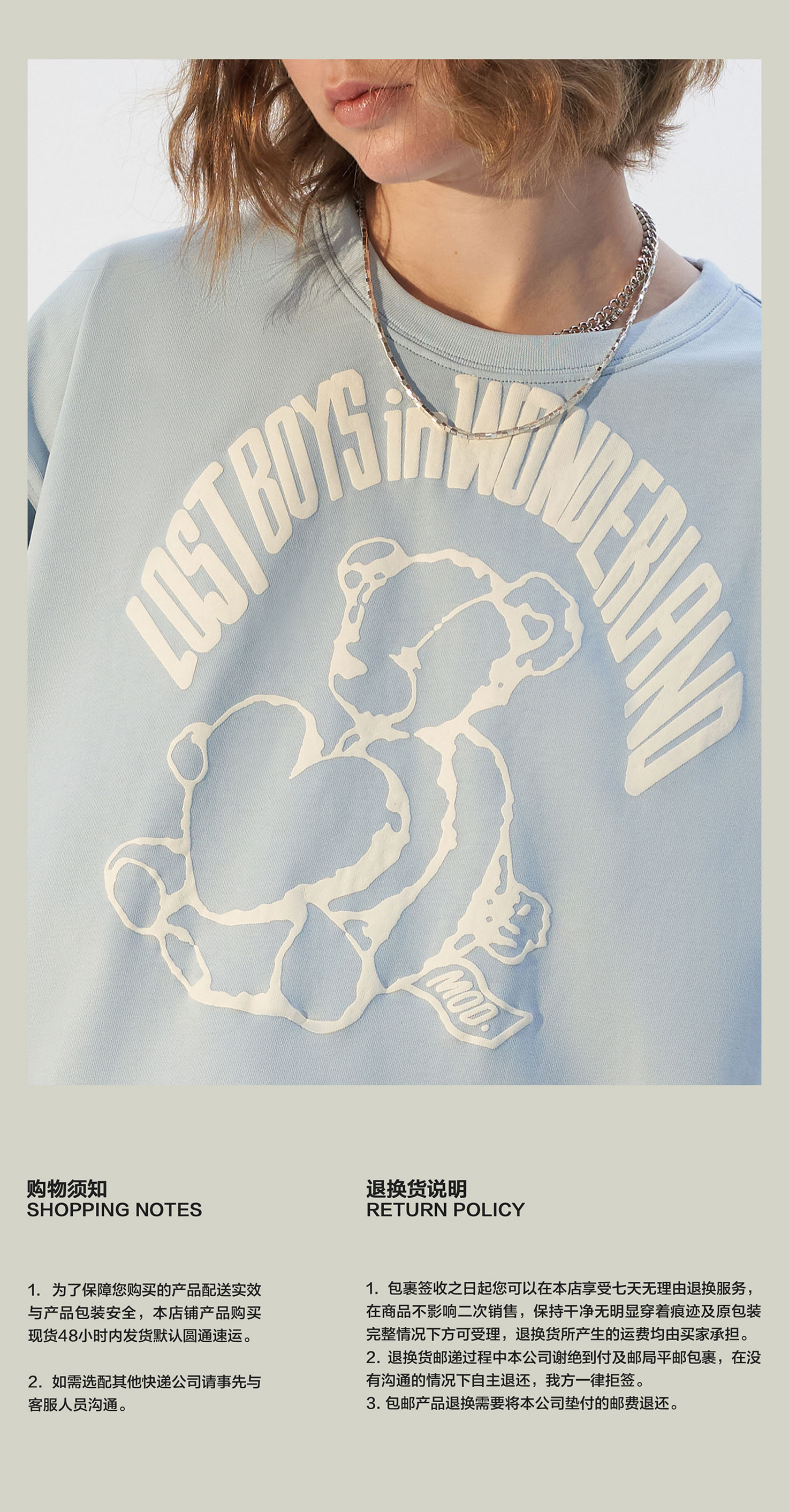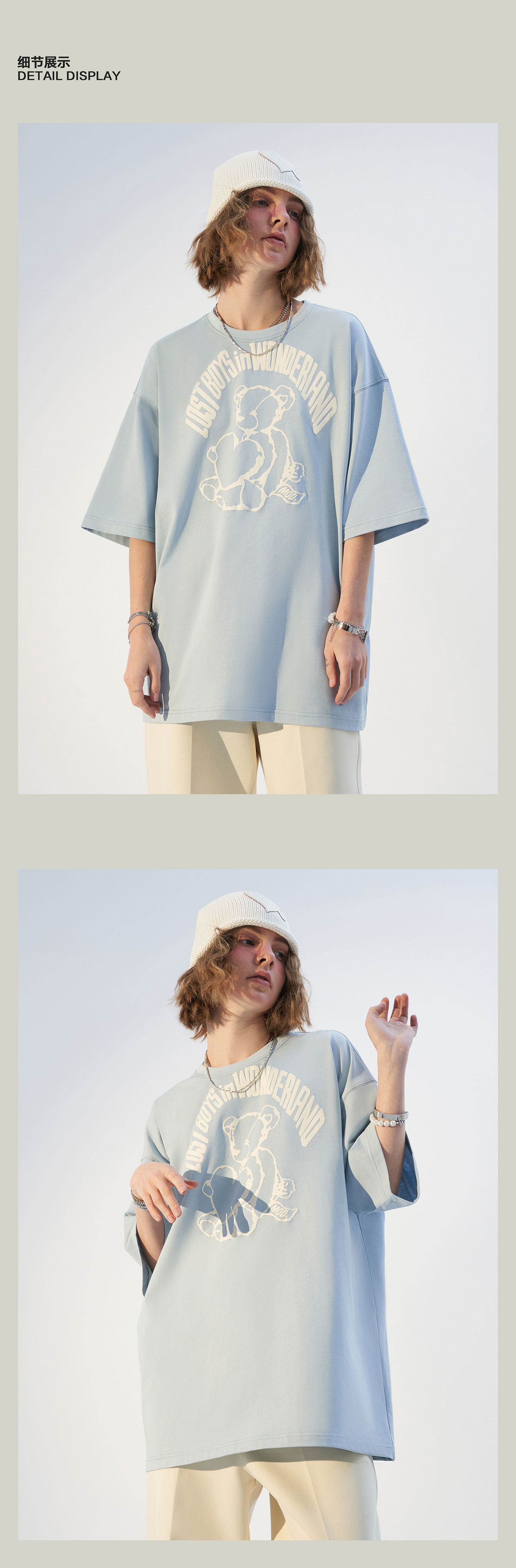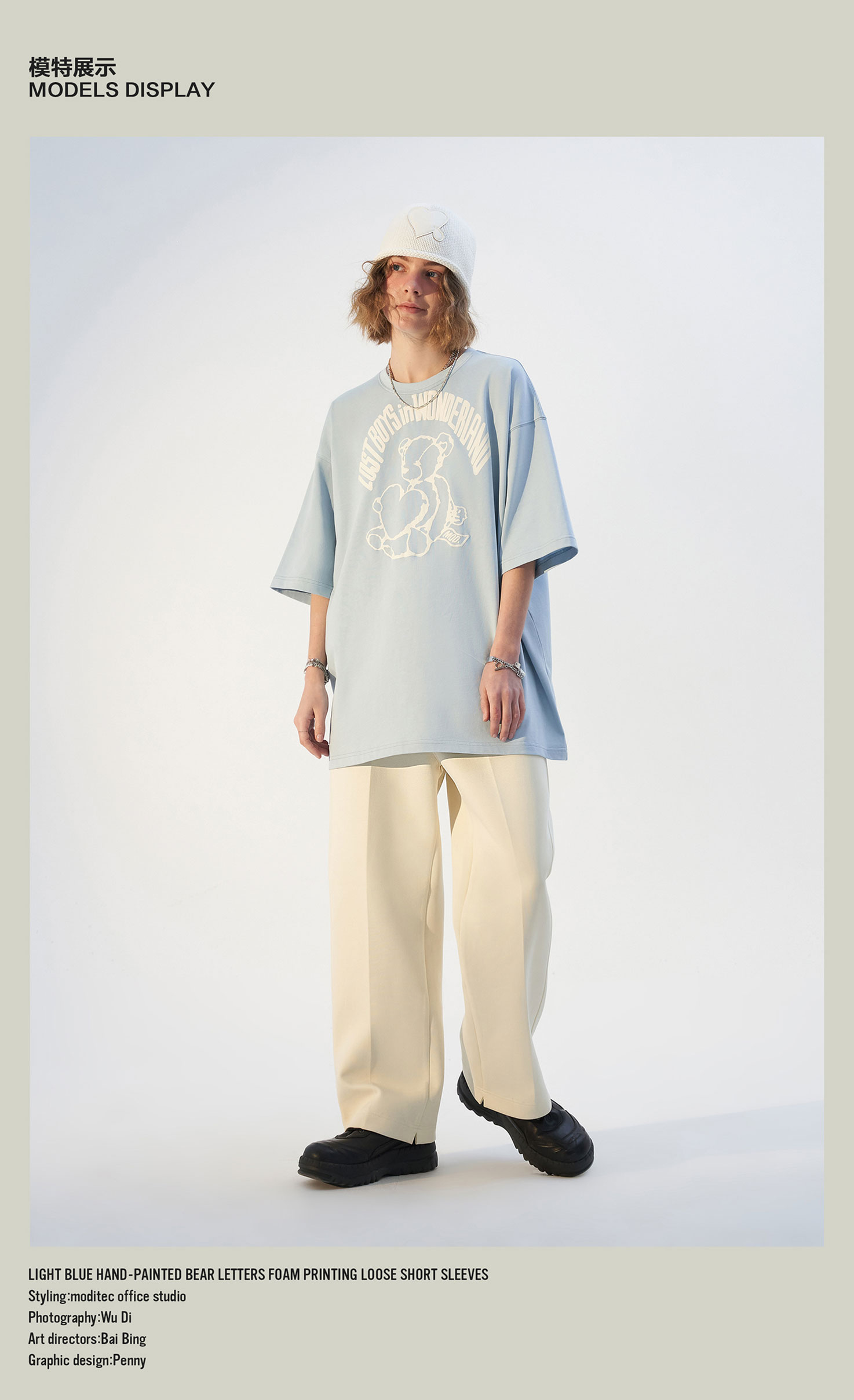 MODITEC21春夏浅蓝手绘小熊字母发泡印花宽松短袖纯棉休闲宽松T恤