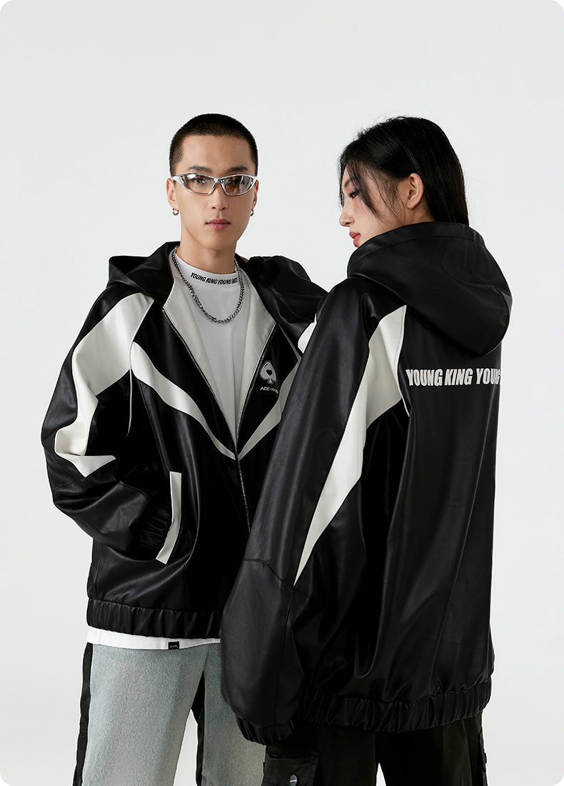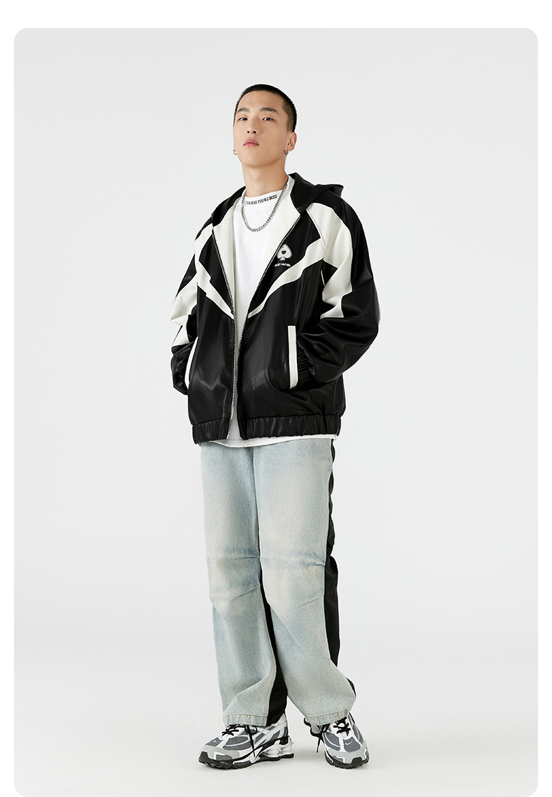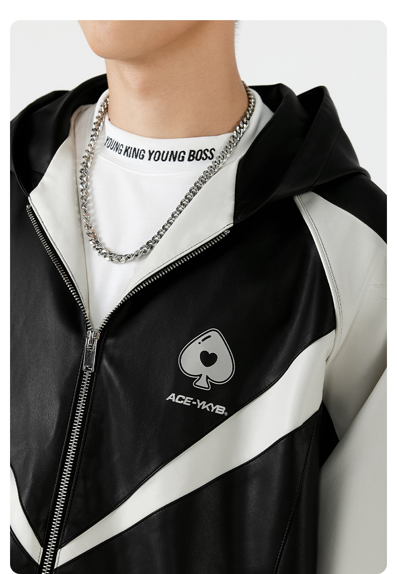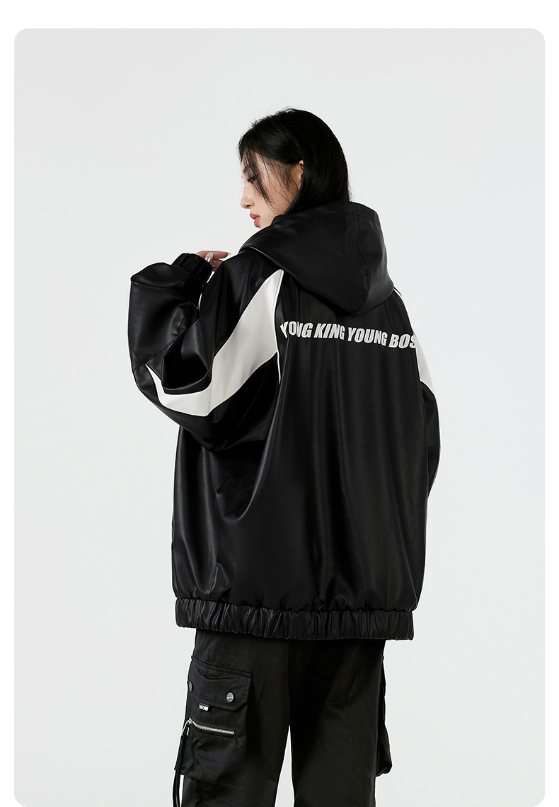 YKYB 黑白拼接撞色连帽夹克潮牌秋季新款上衣美式街头宽松PU外套