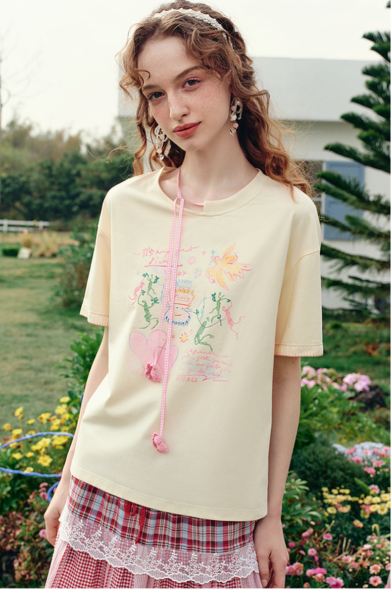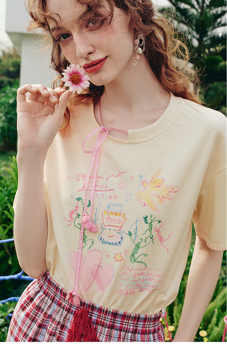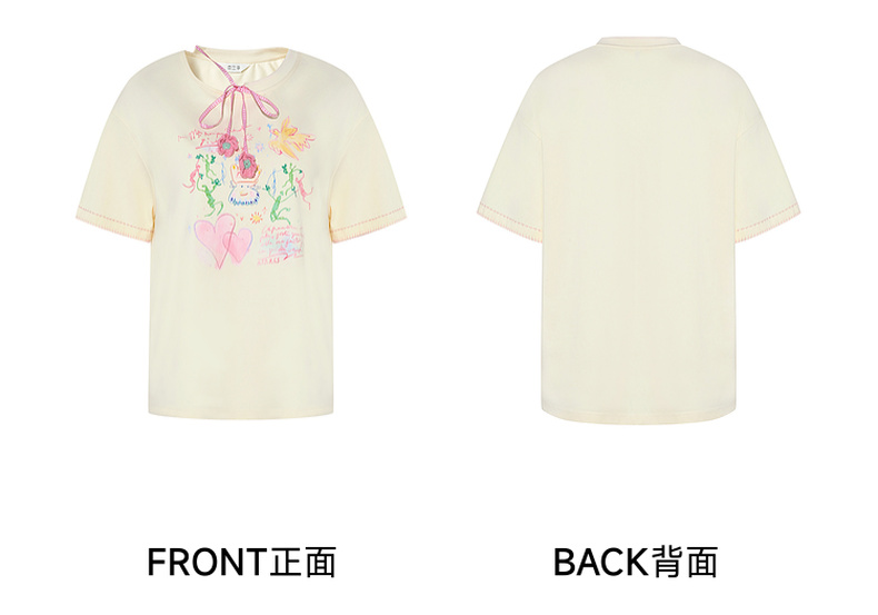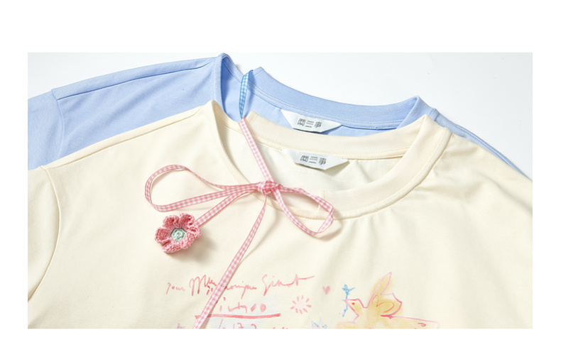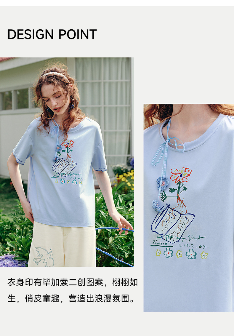两三事虚线与实2025夏季新款小清新印花手钩花绑带短袖t恤女宽松