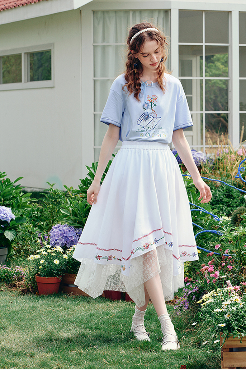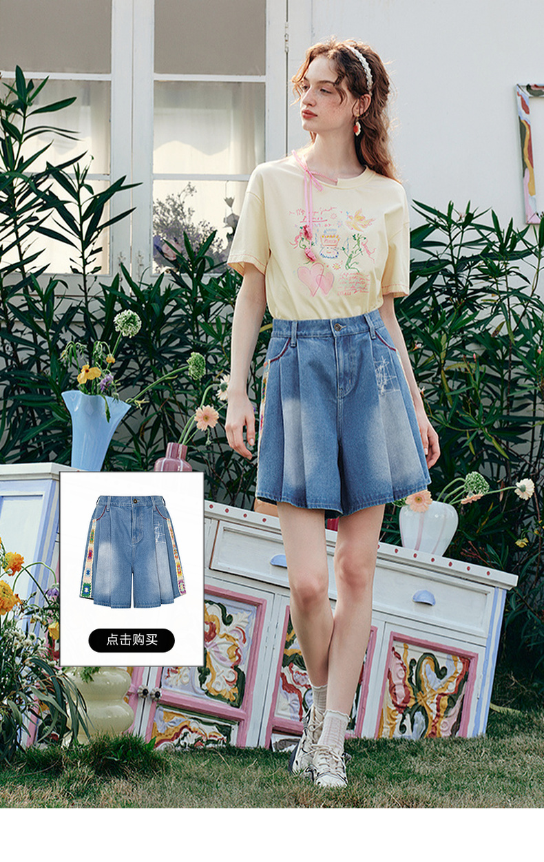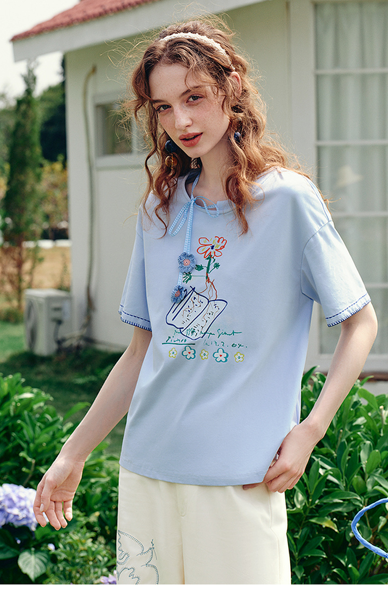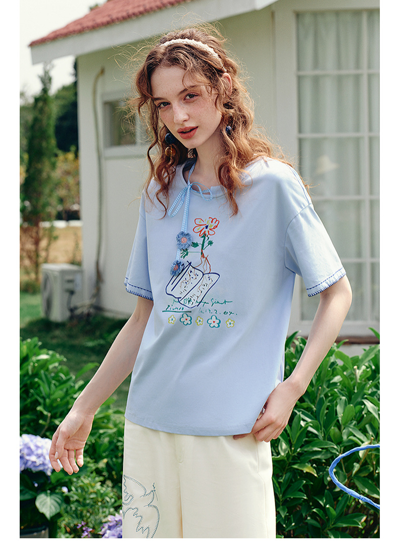 两三事虚线与实2025夏季新款小清新印花手钩花绑带短袖t恤女宽松