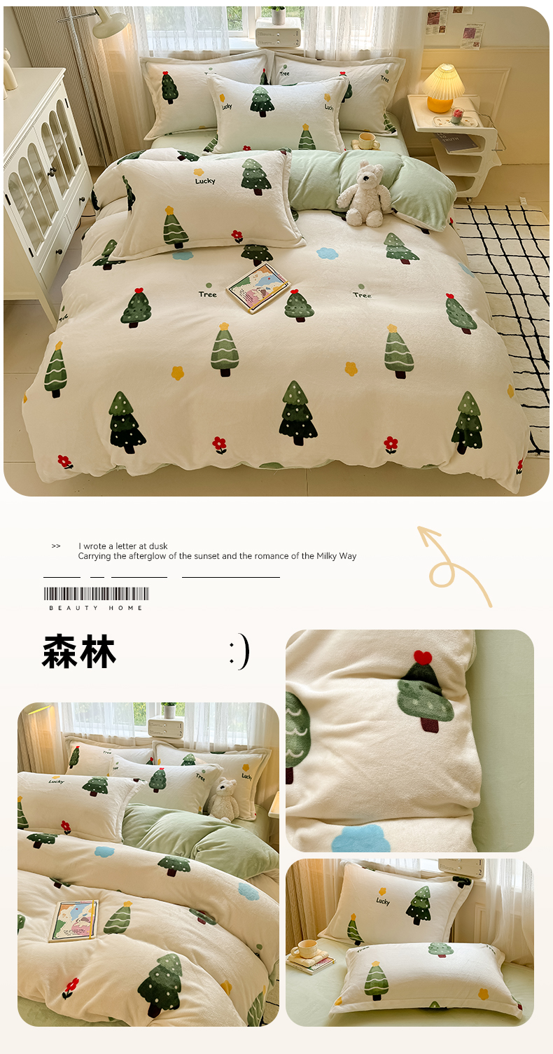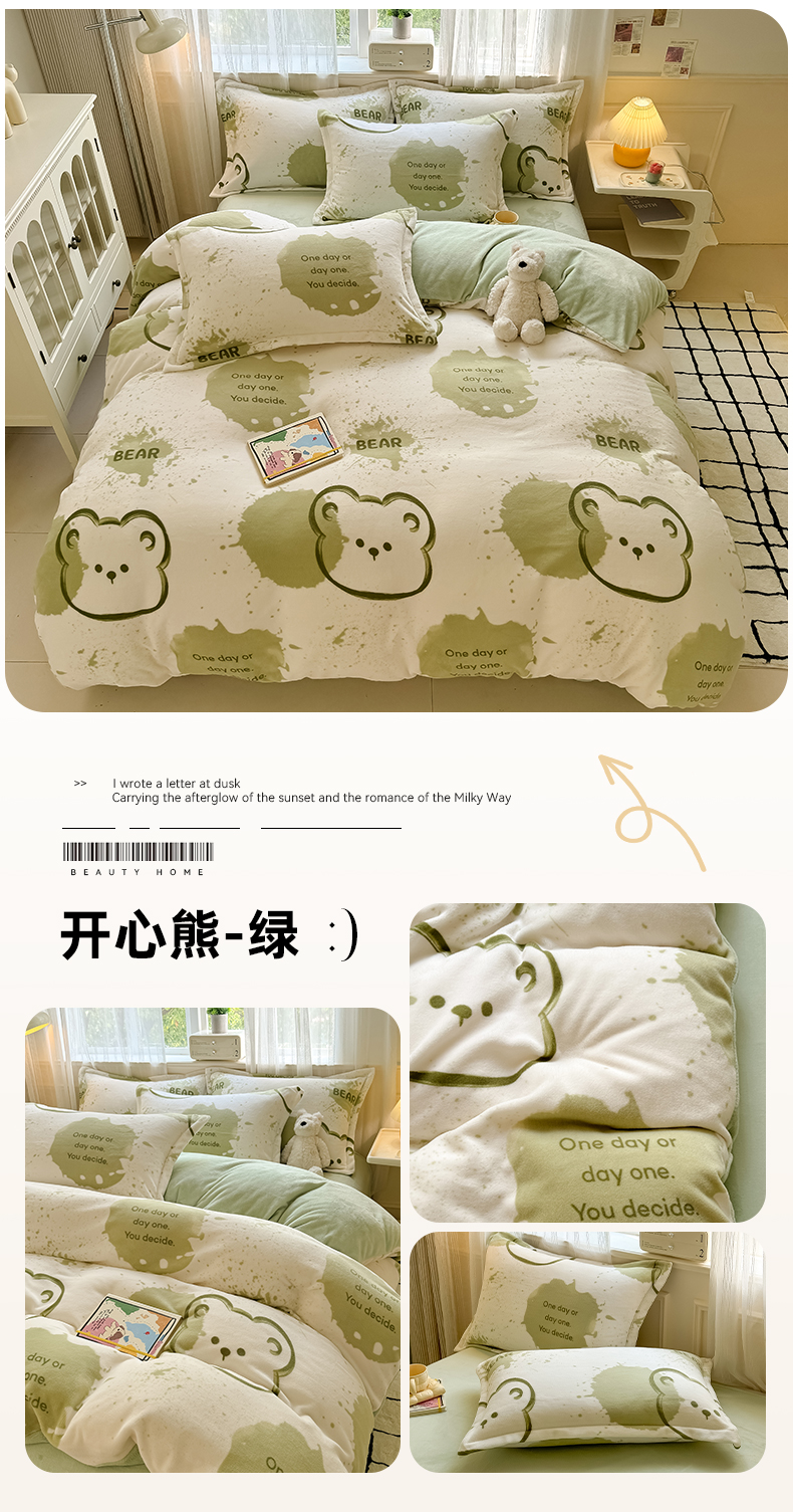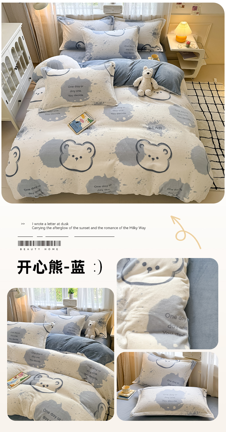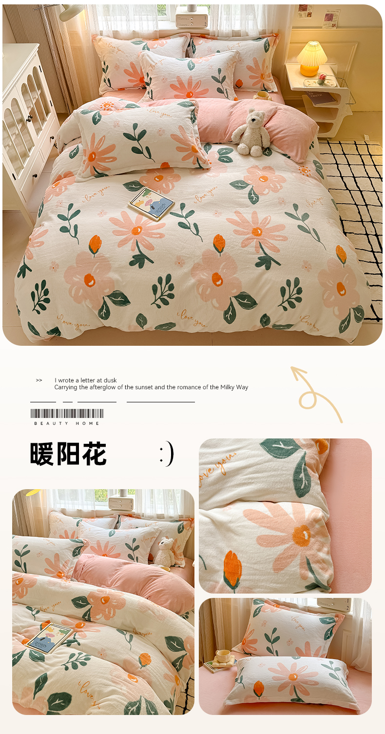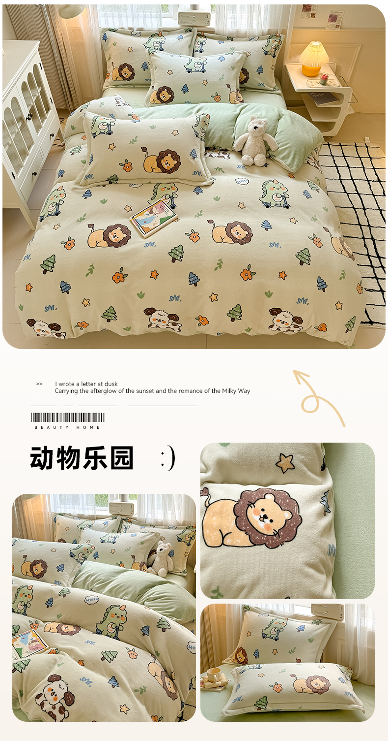 【热卖推荐】自然醒秋冬款A类小清新印花牛奶绒四件套卡通加厚加绒冬季法兰珊瑚绒床品被套三件套QJ