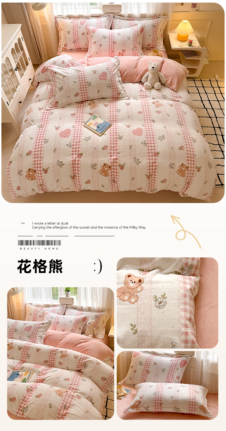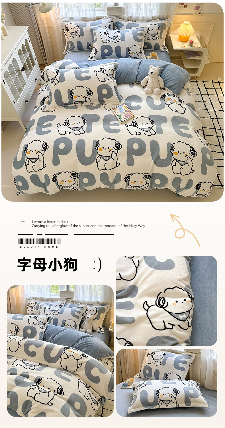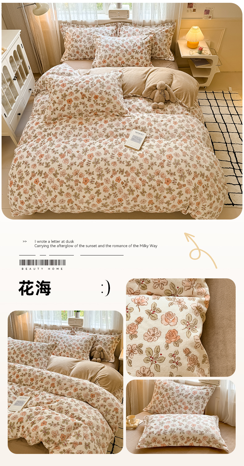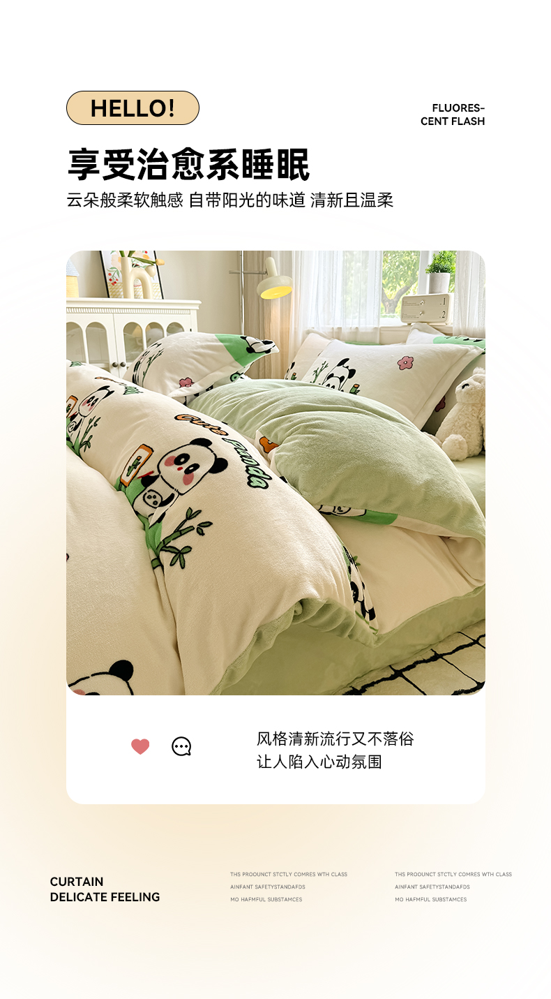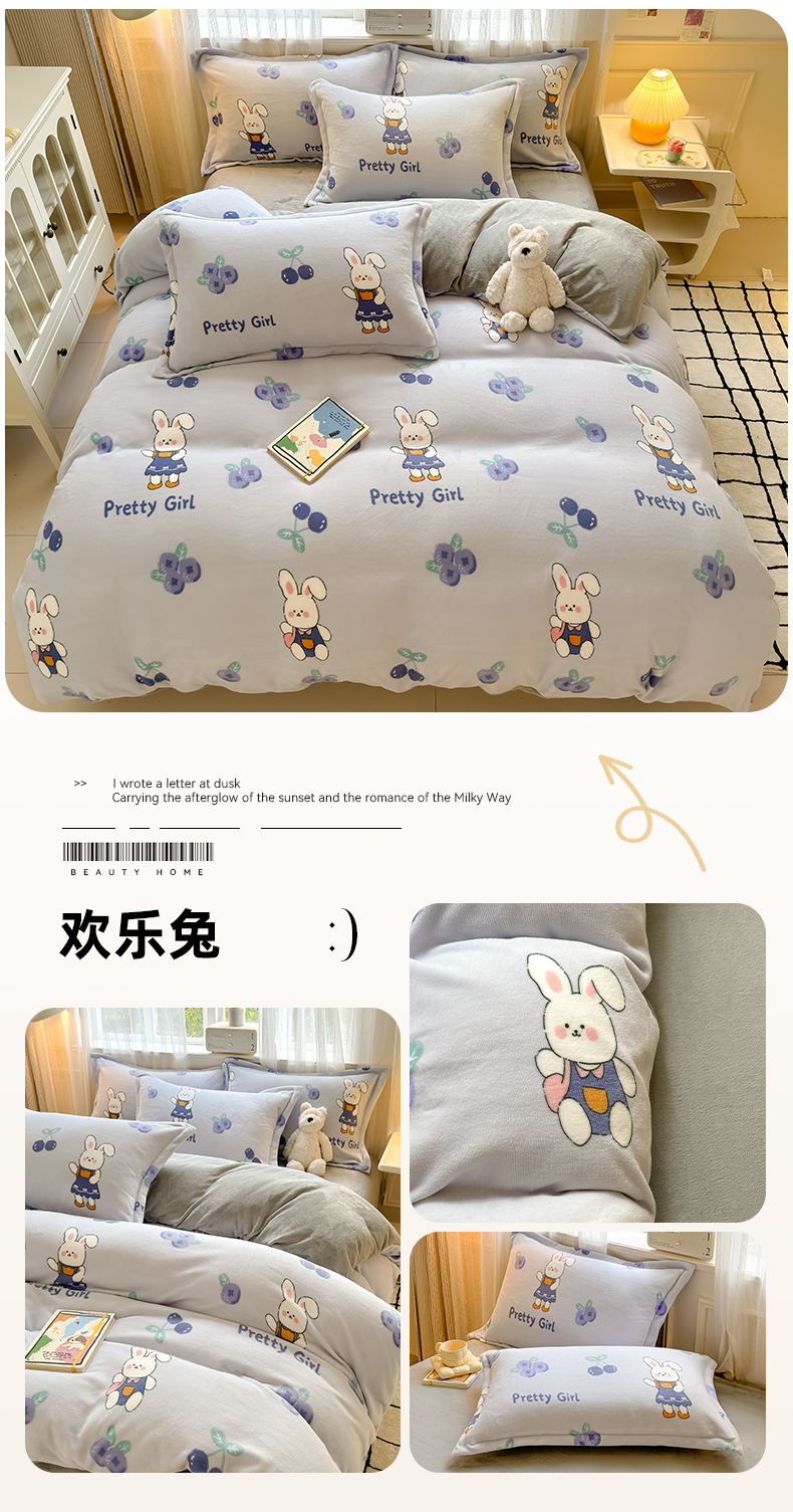 【热卖推荐】自然醒秋冬款A类小清新印花牛奶绒四件套卡通加厚加绒冬季法兰珊瑚绒床品被套三件套QJ