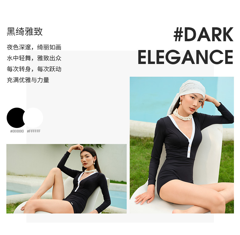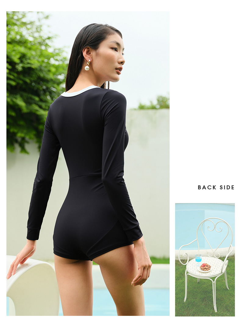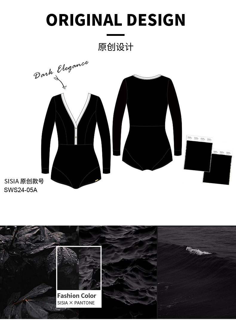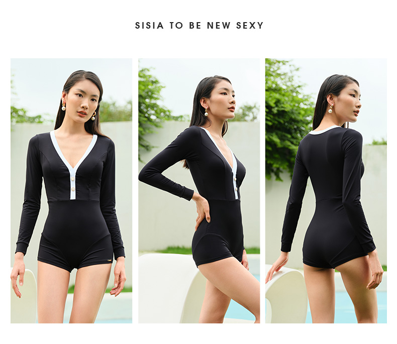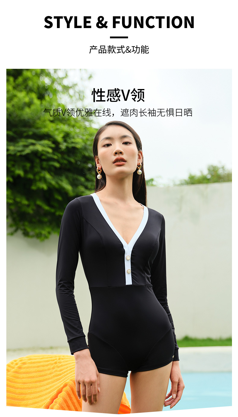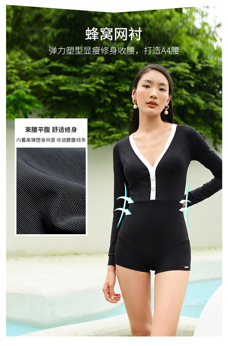 sisia2025新款泳衣女高级感优雅v领长袖防晒显瘦遮肚温泉连体泳衣SWS24-09B