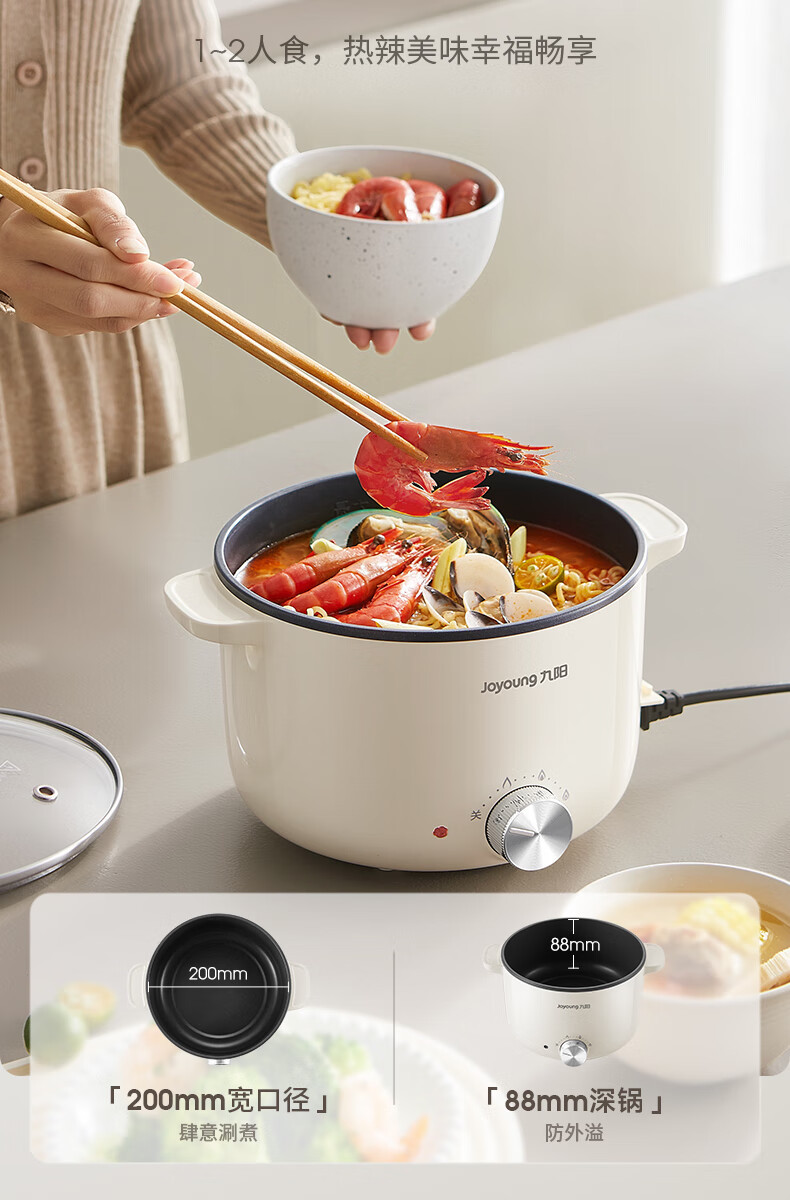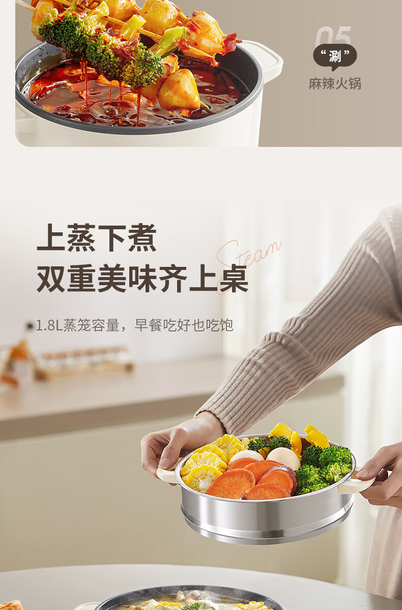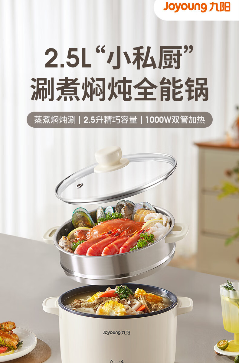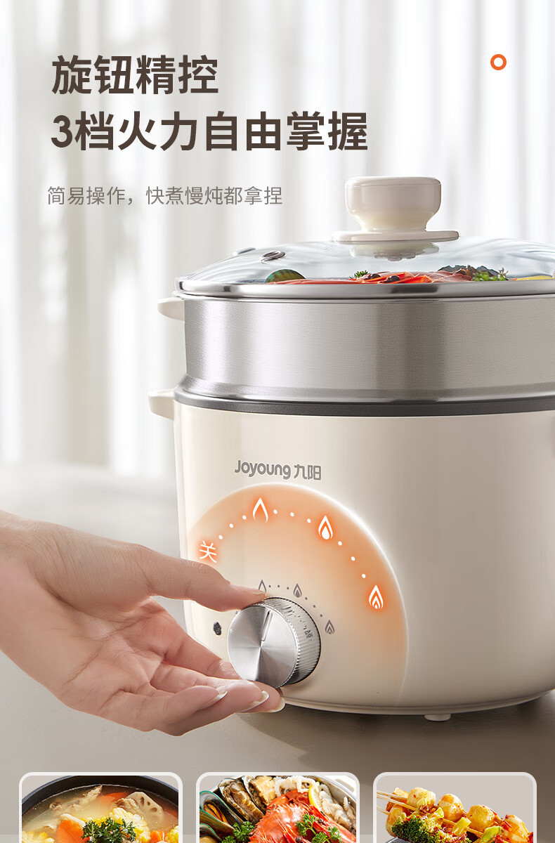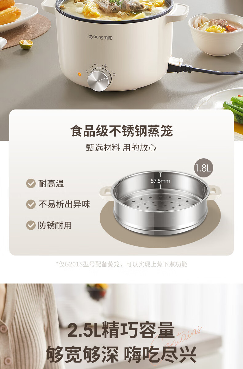 九阳HG25-G201S电煮锅 热锅火锅电蒸锅 2.5L蒸煮一体蒸屉蒸笼电蒸锅